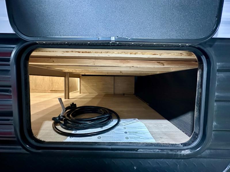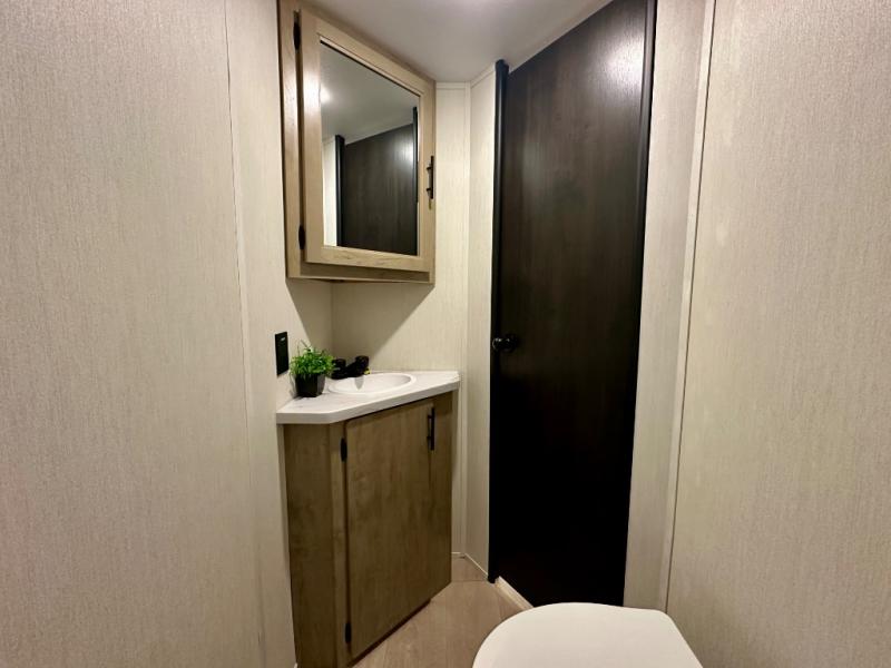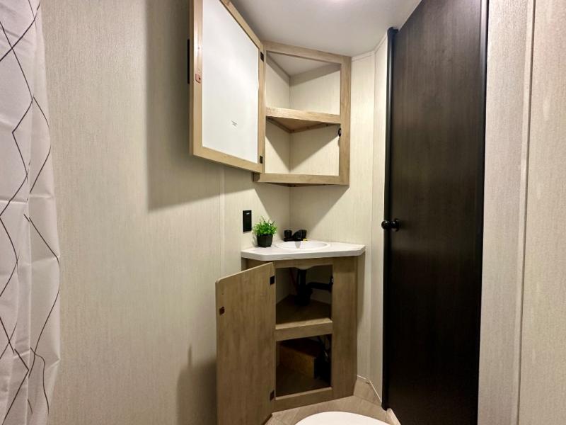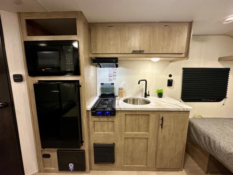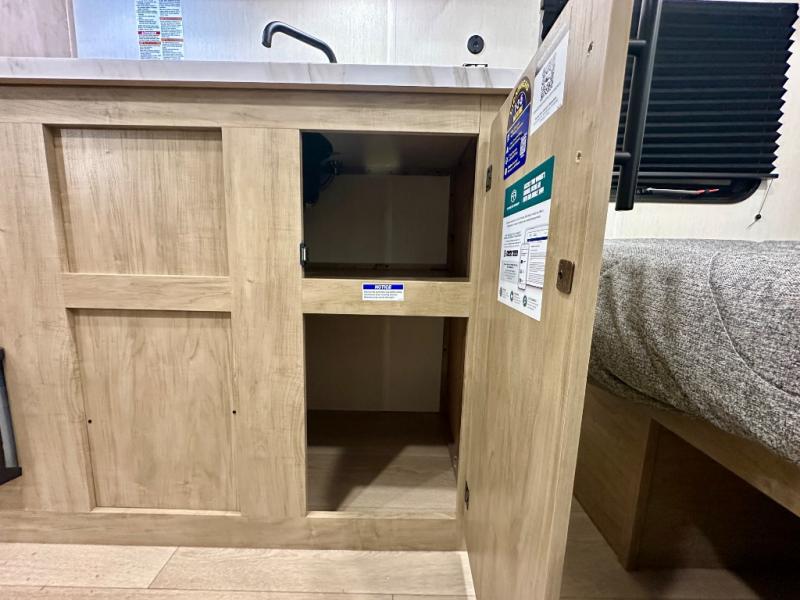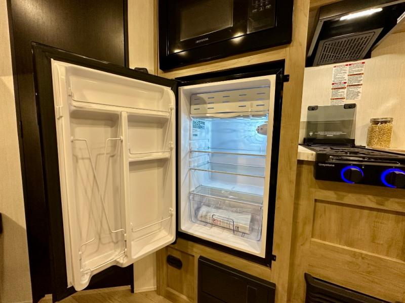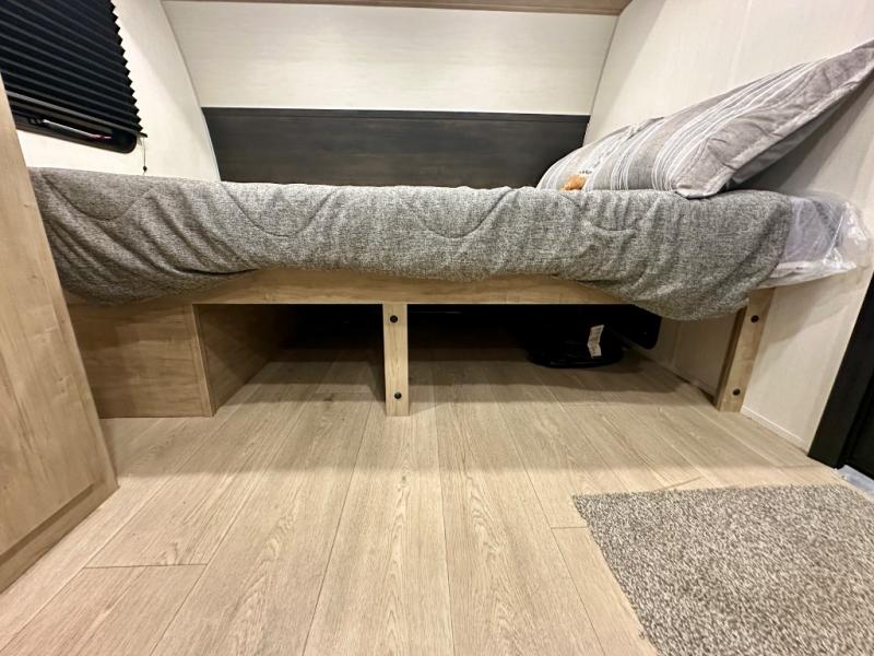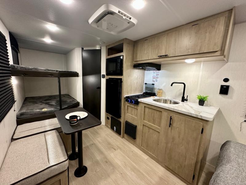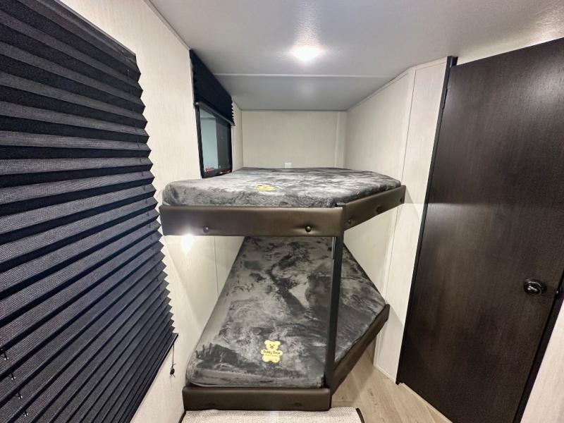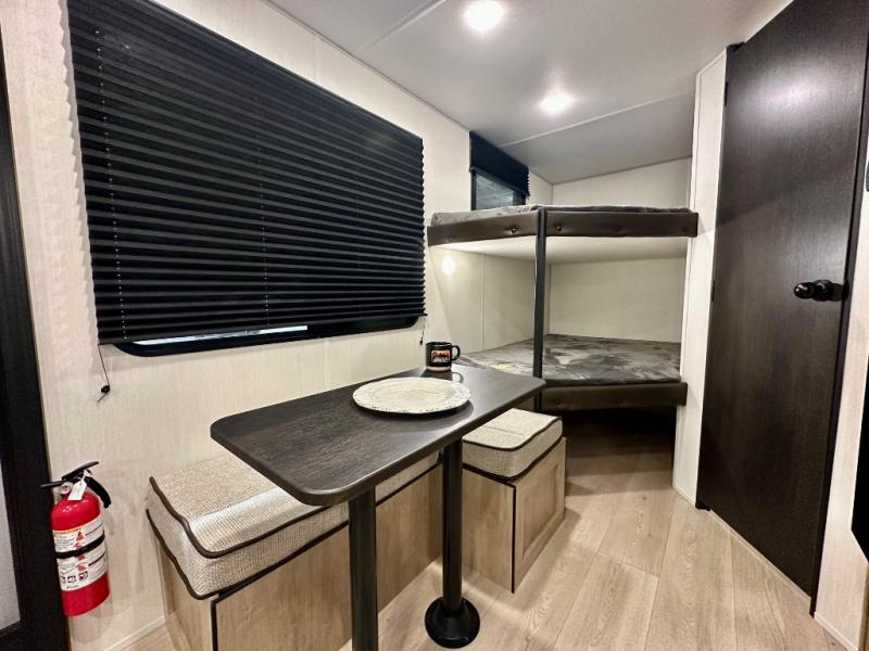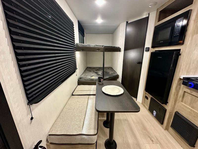 Create amazing memories in this stunning travel trailer! It is perfect for at least six people, thanks to its multiple sleeping spaces. The spacious double-sized bunk beds are ideal for kids or guests, while the plush queen-sized bed provides a restful retreat for adults. The full bathroom is equipped with everything you need for a comfortable stay, and the kitchen features a refrigerator and microwave for you to go wild in the kitchen. You can also gather around the dinette for meals and snacks, or relax in the evenings under the protection of the exterior awning. In addition, ample overhead cabinets provide storage for cookware, dishes, and essentials, keeping your trailer tidy and organized.