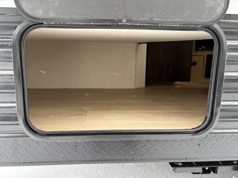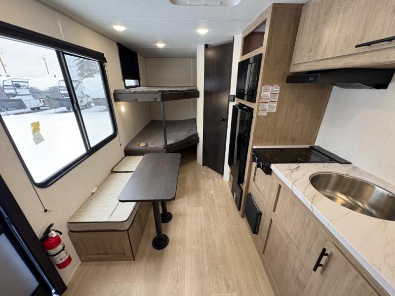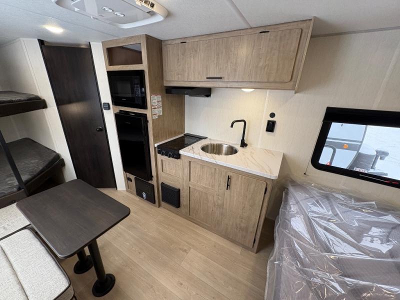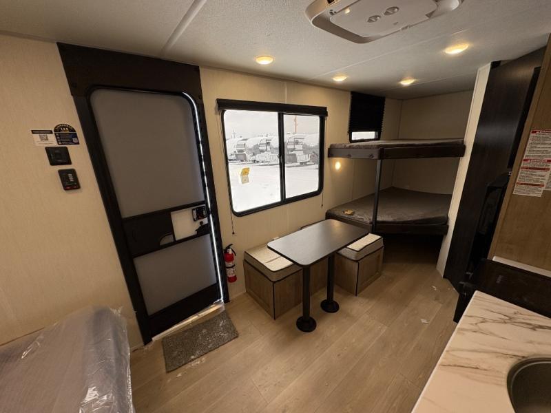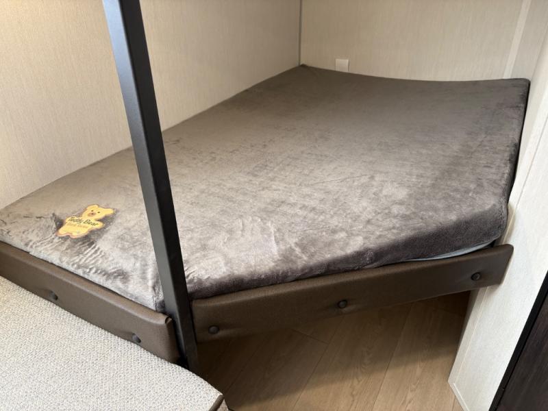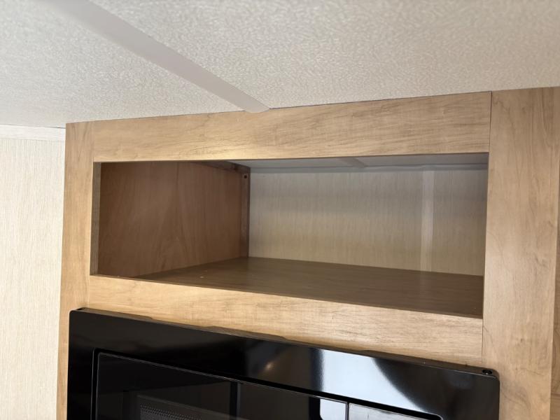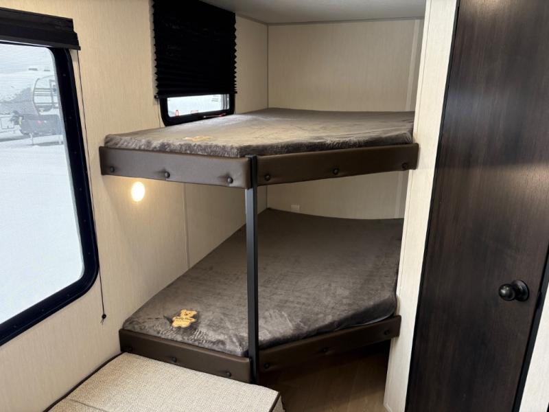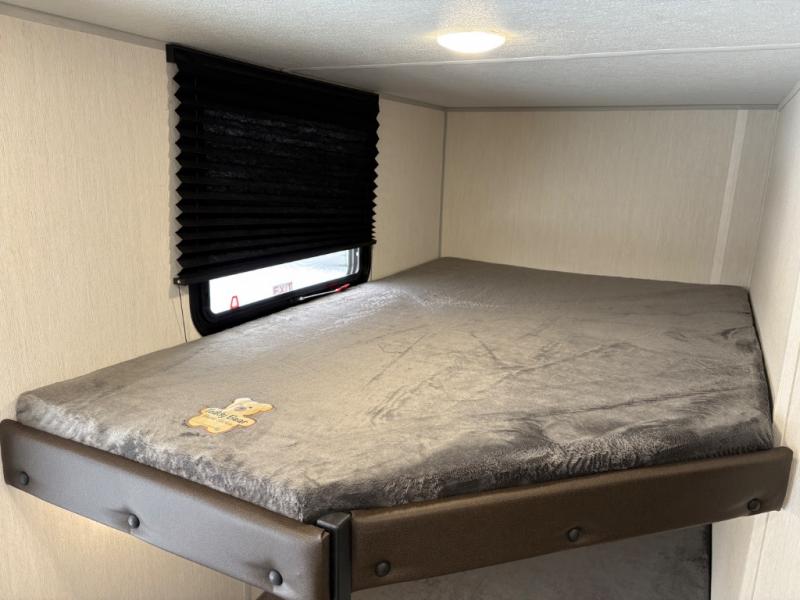 Create amazing memories in this stunning travel trailer! It is perfect for at least six people, thanks to its multiple sleeping spaces. The spacious double-sized bunk beds are ideal for kids or guests, while the plush queen-sized bed provides a restful retreat for adults. The full bathroom is equipped with everything you need for a comfortable stay, and the kitchen features a refrigerator and microwave for you to go wild in the kitchen. You can also gather around the dinette for meals and snacks, or relax in the evenings under the protection of the exterior awning. In addition, ample overhead cabinets provide storage for cookware, dishes, and essentials, keeping your trailer tidy and organized.