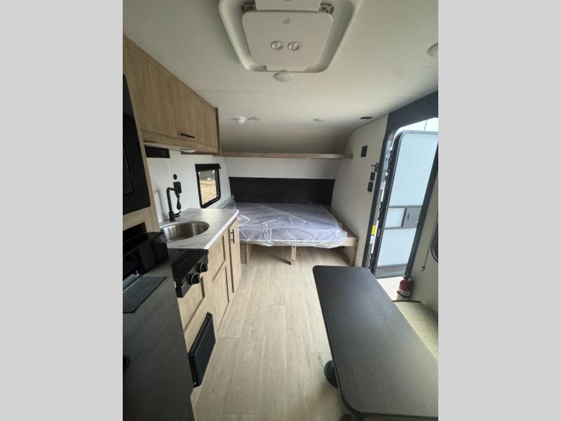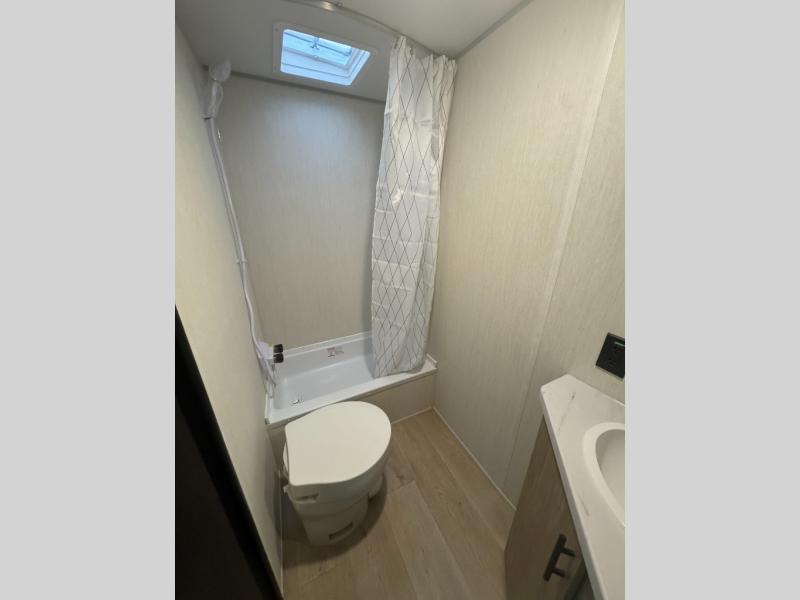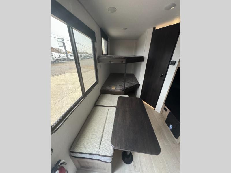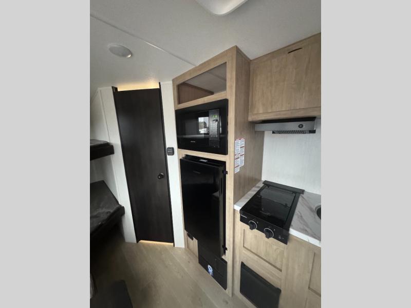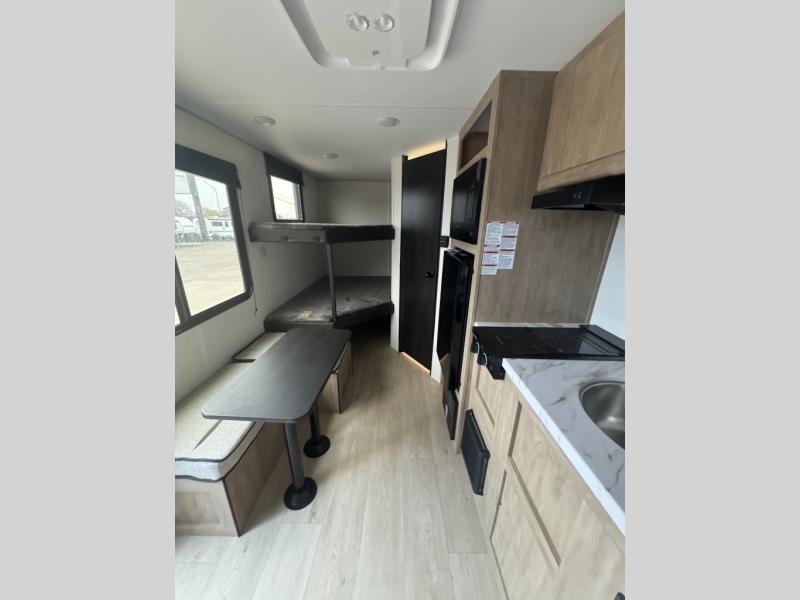 Create amazing memories in this stunning travel trailer! It is perfect for at least six people, thanks to its multiple sleeping spaces. The spacious double-sized bunk beds are ideal for kids or guests, while the plush queen-sized bed provides a restful retreat for adults. The full bathroom is equipped with everything you need for a comfortable stay, and the kitchen features a refrigerator and microwave for you to go wild in the kitchen. You can also gather around the dinette for meals and snacks, or relax in the evenings under the protection of the exterior awning. In addition, ample overhead cabinets provide storage for cookware, dishes, and essentials, keeping your trailer tidy and organized.