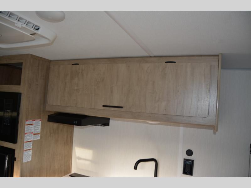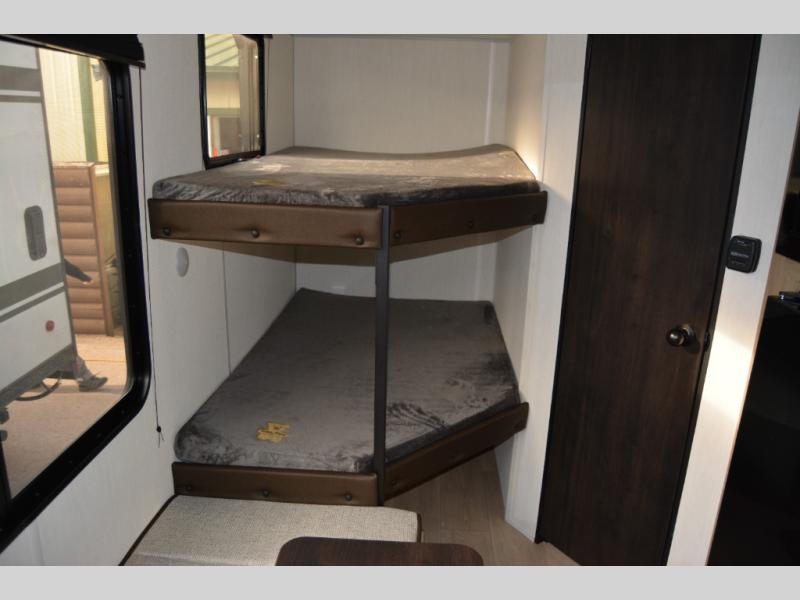 Create amazing memories in this stunning travel trailer! It is perfect for at least six people, thanks to its multiple sleeping spaces. The spacious double-sized bunk beds are ideal for kids or guests, while the plush queen-sized bed provides a restful retreat for adults. The full bathroom is equipped with everything you need for a comfortable stay, and the kitchen features a refrigerator and microwave for you to go wild in the kitchen. You can also gather around the dinette for meals and snacks, or relax in the evenings under the protection of the exterior awning. In addition, ample overhead cabinets provide storage for cookware, dishes, and essentials, keeping your trailer tidy and organized.