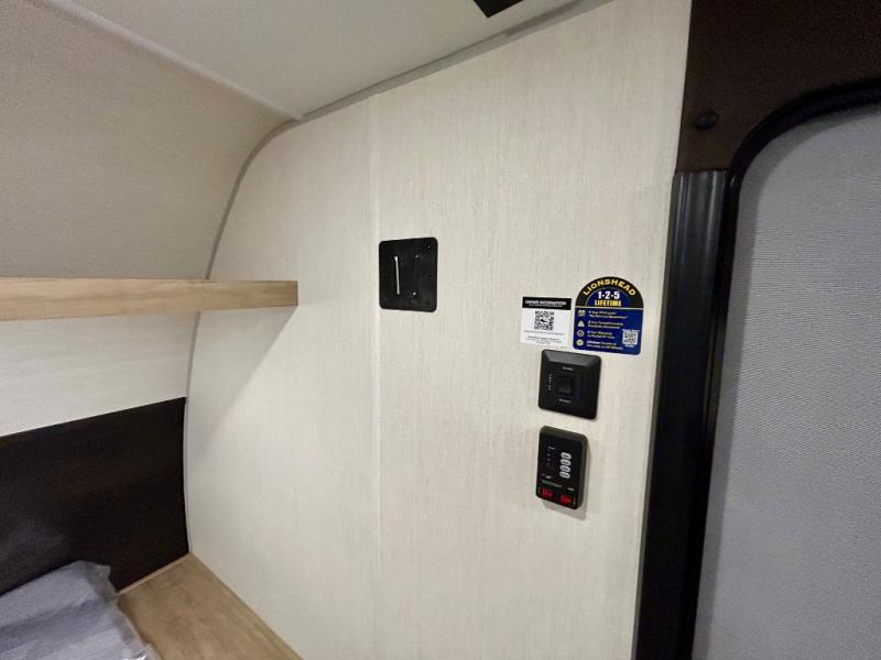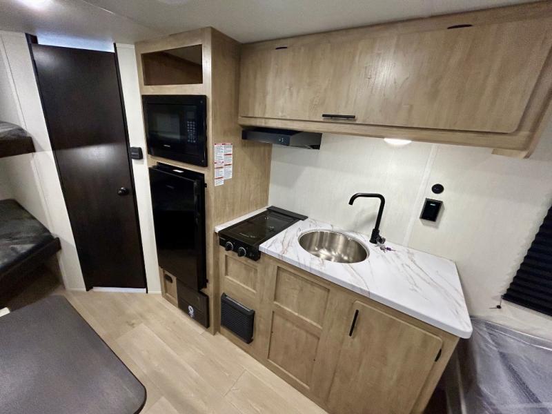Create amazing memories in this stunning travel trailer! It is perfect for at least six people, thanks to its multiple sleeping spaces. The spacious double-sized bunk beds are ideal for kids or guests, while the plush queen-sized bed provides a restful retreat for adults. The full bathroom is equipped with everything you need for a comfortable stay, and the kitchen features a refrigerator and microwave for you to go wild in the kitchen. You can also gather around the dinette for meals and snacks, or relax in the evenings under the protection of the exterior awning. In addition, ample overhead cabinets provide storage for cookware, dishes, and essentials, keeping your trailer tidy and organized.