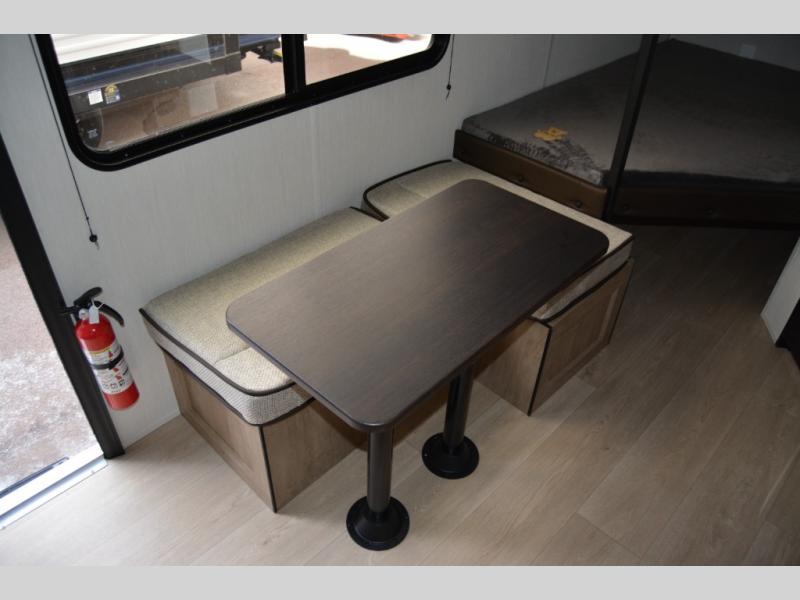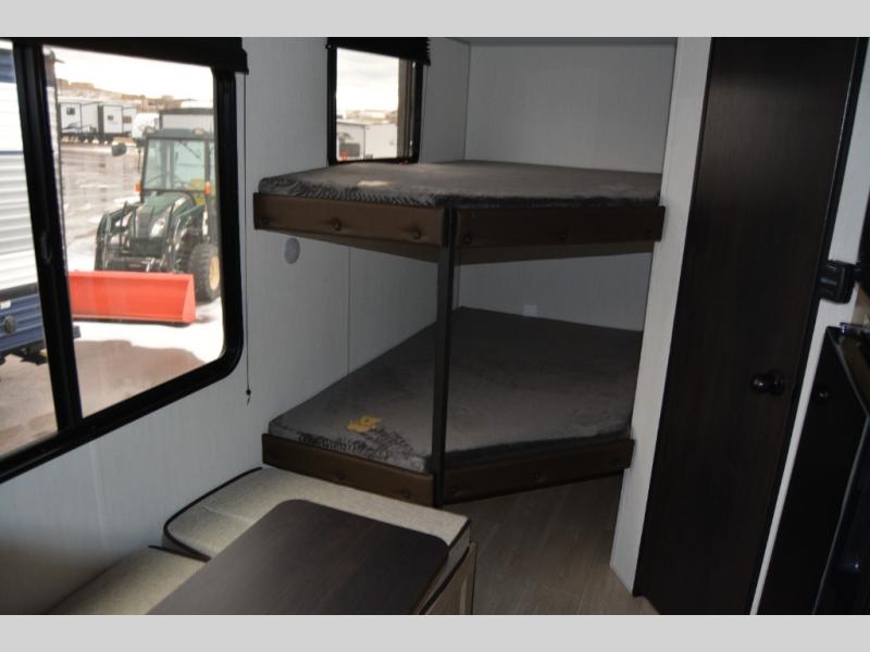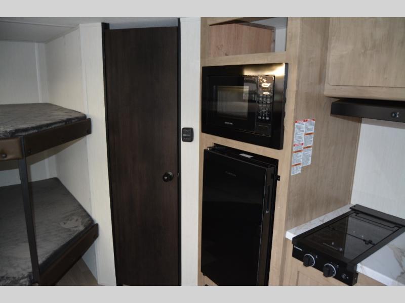 Create amazing memories in this stunning travel trailer! It is perfect for at least six people, thanks to its multiple sleeping spaces. The spacious double-sized bunk beds are ideal for kids or guests, while the plush queen-sized bed provides a restful retreat for adults. The full bathroom is equipped with everything you need for a comfortable stay, and the kitchen features a refrigerator and microwave for you to go wild in the kitchen. You can also gather around the dinette for meals and snacks, or relax in the evenings under the protection of the exterior awning. In addition, ample overhead cabinets provide storage for cookware, dishes, and essentials, keeping your trailer tidy and organized.