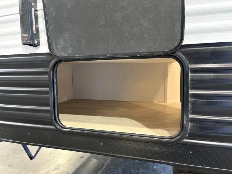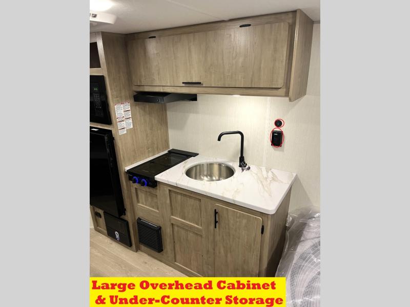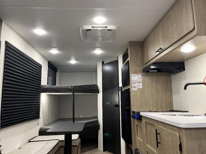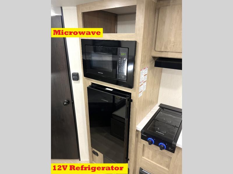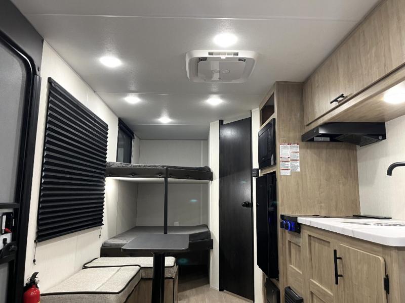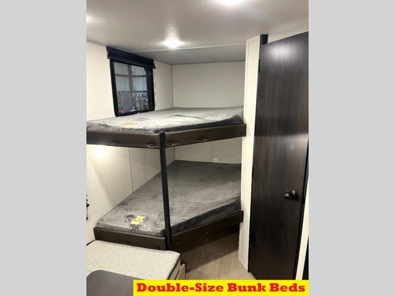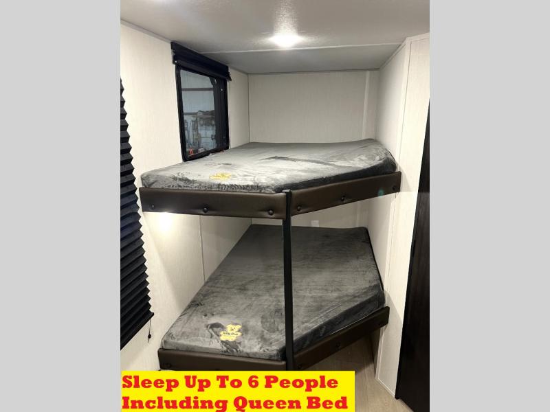 Create amazing memories in this stunning travel trailer! It is perfect for at least six people, thanks to its multiple sleeping spaces. The spacious double-sized bunk beds are ideal for kids or guests, while the plush queen-sized bed provides a restful retreat for adults. The full bathroom is equipped with everything you need for a comfortable stay, and the kitchen features a refrigerator and microwave for you to go wild in the kitchen. You can also gather around the dinette for meals and snacks, or relax in the evenings under the protection of the exterior awning. In addition, ample overhead cabinets provide storage for cookware, dishes, and essentials, keeping your trailer tidy and organized.