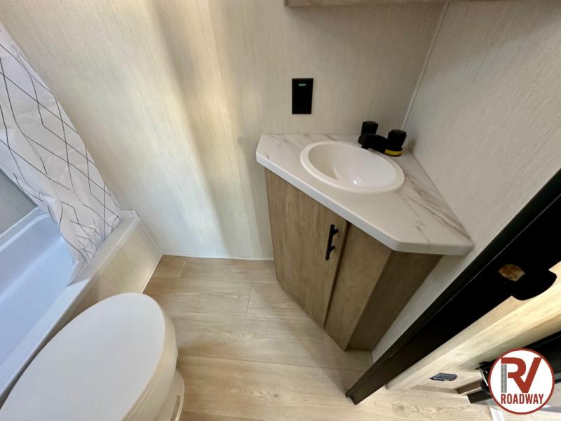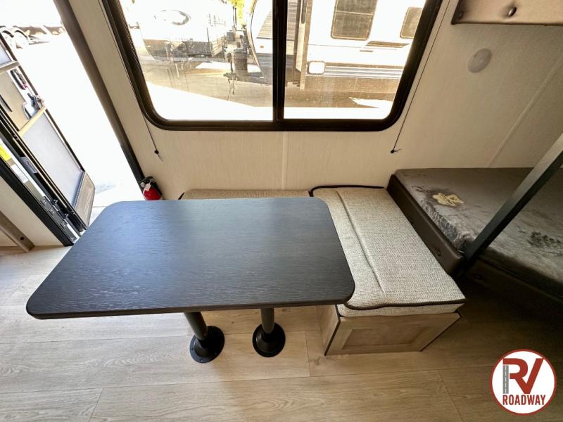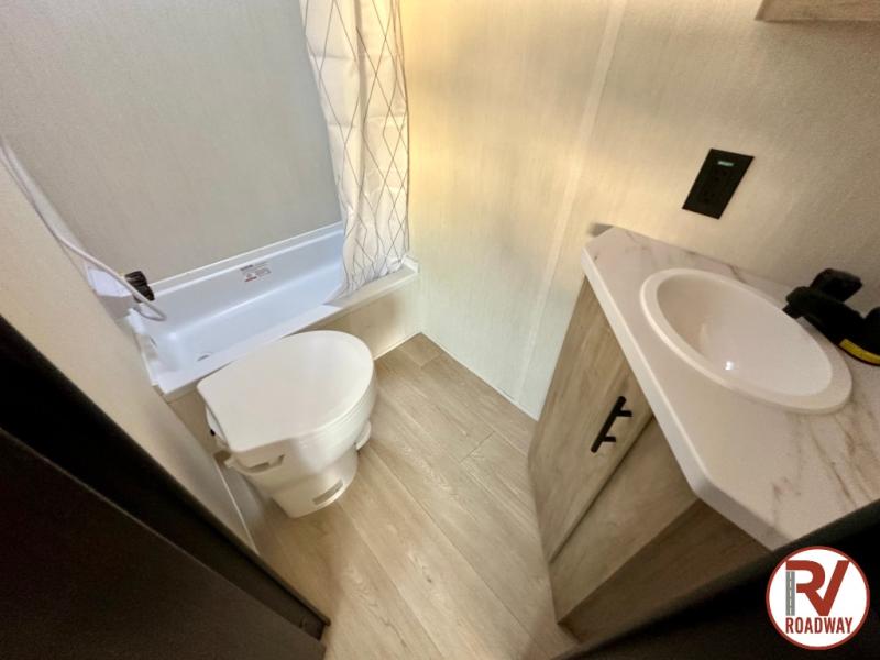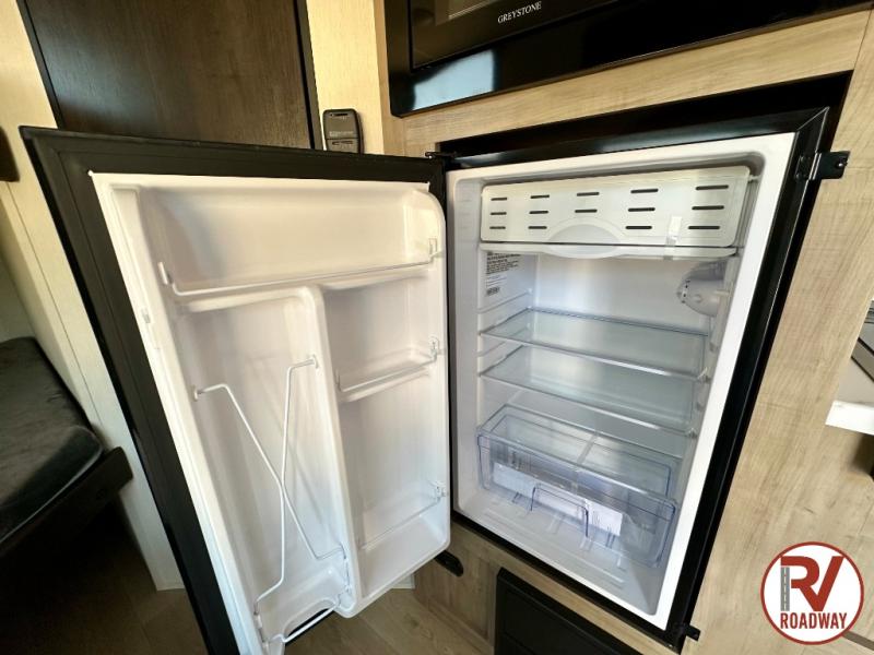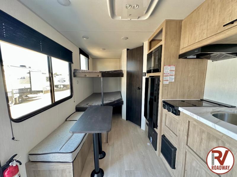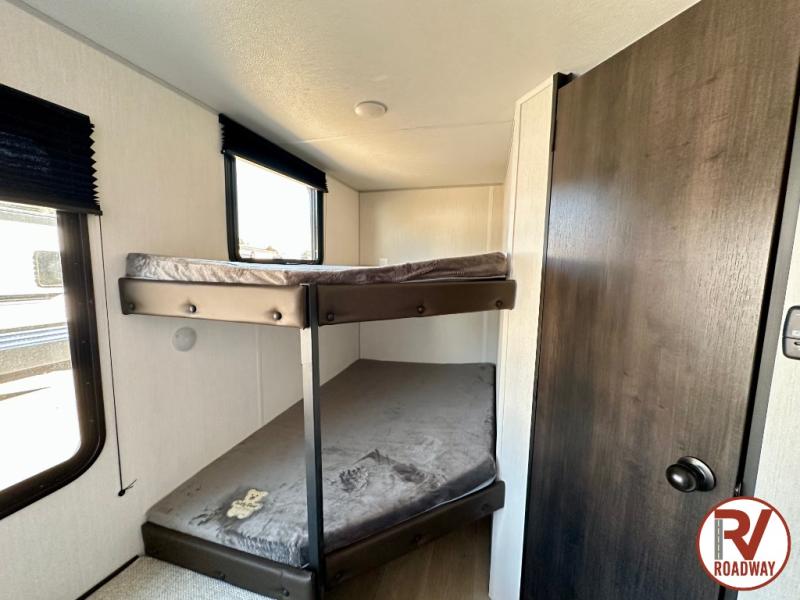Create amazing memories in this stunning travel trailer! It is perfect for at least six people, thanks to its multiple sleeping spaces. The spacious double-sized bunk beds are ideal for kids or guests, while the plush queen-sized bed provides a restful retreat for adults. The full bathroom is equipped with everything you need for a comfortable stay, and the kitchen features a refrigerator and microwave for you to go wild in the kitchen. You can also gather around the dinette for meals and snacks, or relax in the evenings under the protection of the exterior awning. In addition, ample overhead cabinets provide storage for cookware, dishes, and essentials, keeping your trailer tidy and organized.