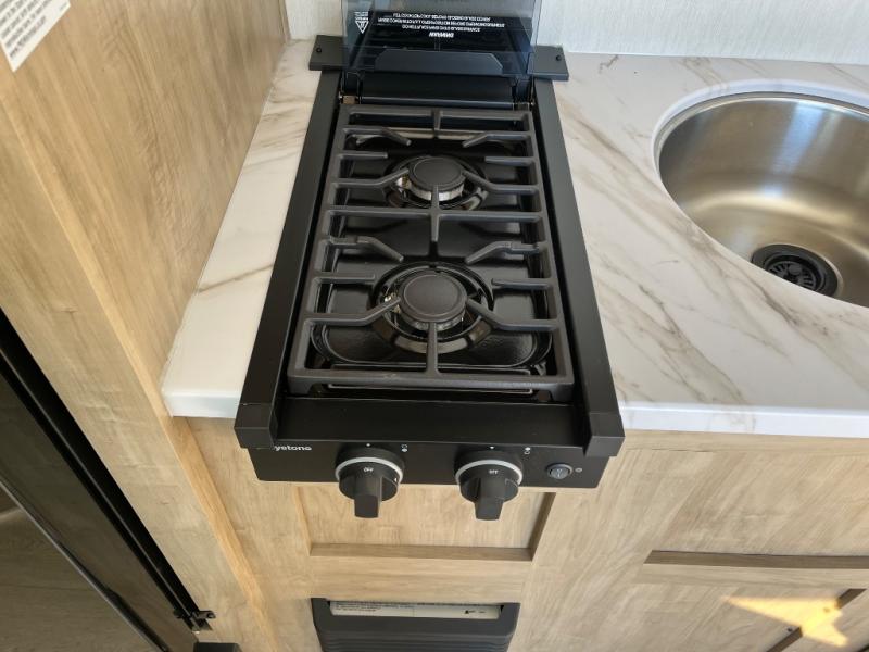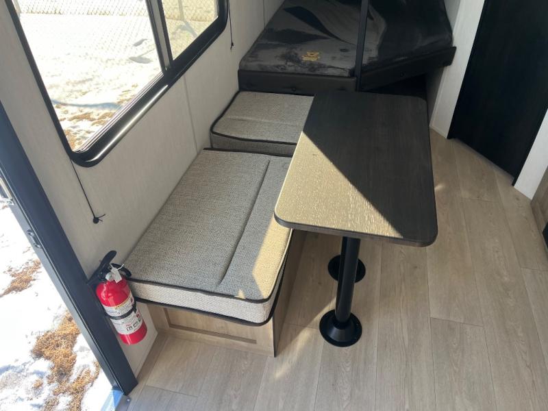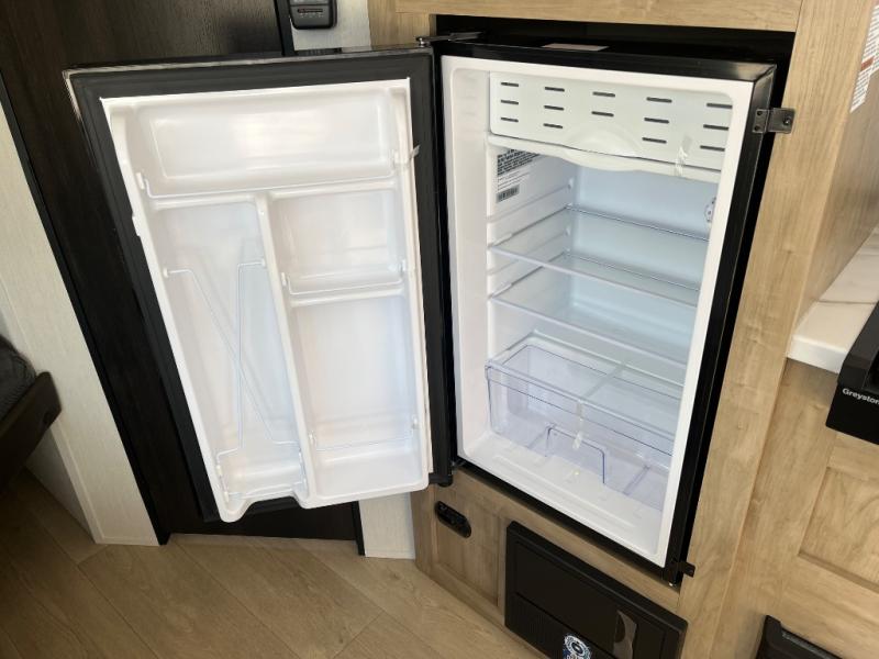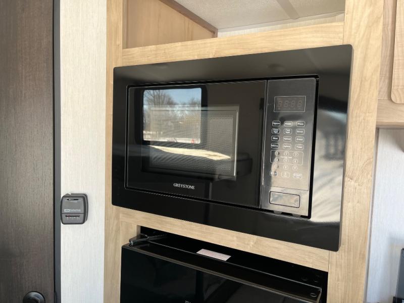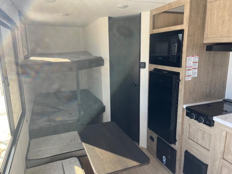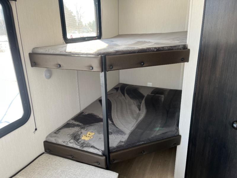 Create amazing memories in this stunning travel trailer! It is perfect for at least six people, thanks to its multiple sleeping spaces. The spacious double-sized bunk beds are ideal for kids or guests, while the plush queen-sized bed provides a restful retreat for adults. The full bathroom is equipped with everything you need for a comfortable stay, and the kitchen features a refrigerator and microwave for you to go wild in the kitchen. You can also gather around the dinette for meals and snacks, or relax in the evenings under the protection of the exterior awning. In addition, ample overhead cabinets provide storage for cookware, dishes, and essentials, keeping your trailer tidy and organized.