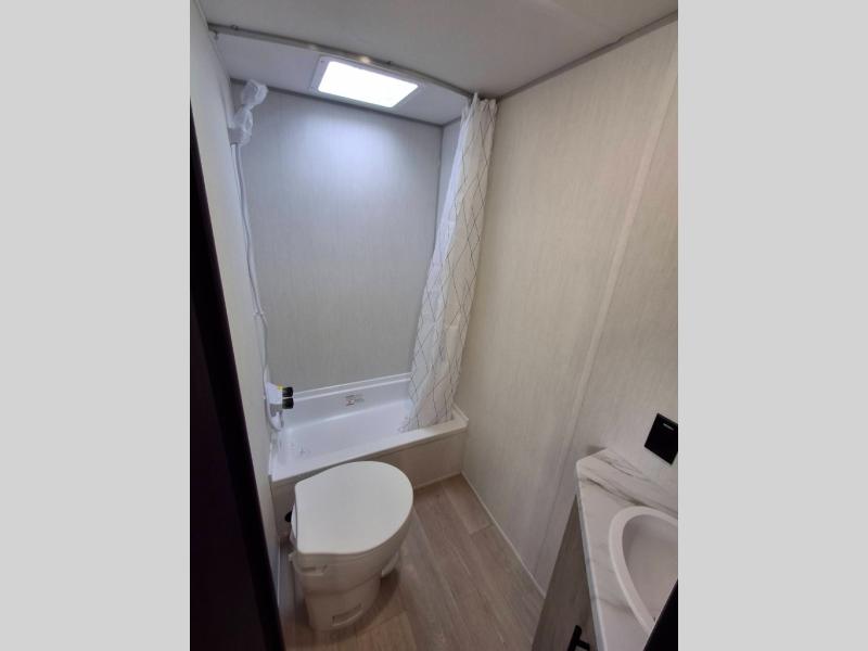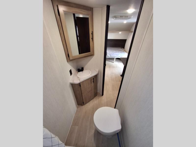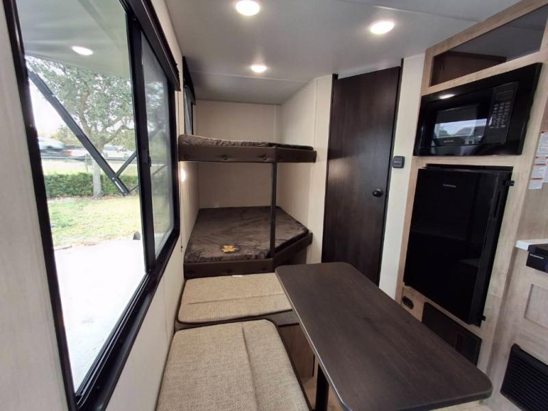 Create amazing memories in this stunning travel trailer! It is perfect for at least six people, thanks to its multiple sleeping spaces. The spacious double-sized bunk beds are ideal for kids or guests, while the plush queen-sized bed provides a restful retreat for adults. The full bathroom is equipped with everything you need for a comfortable stay, and the kitchen features a refrigerator and microwave for you to go wild in the kitchen. You can also gather around the dinette for meals and snacks, or relax in the evenings under the protection of the exterior awning. In addition, ample overhead cabinets provide storage for cookware, dishes, and essentials, keeping your trailer tidy and organized.