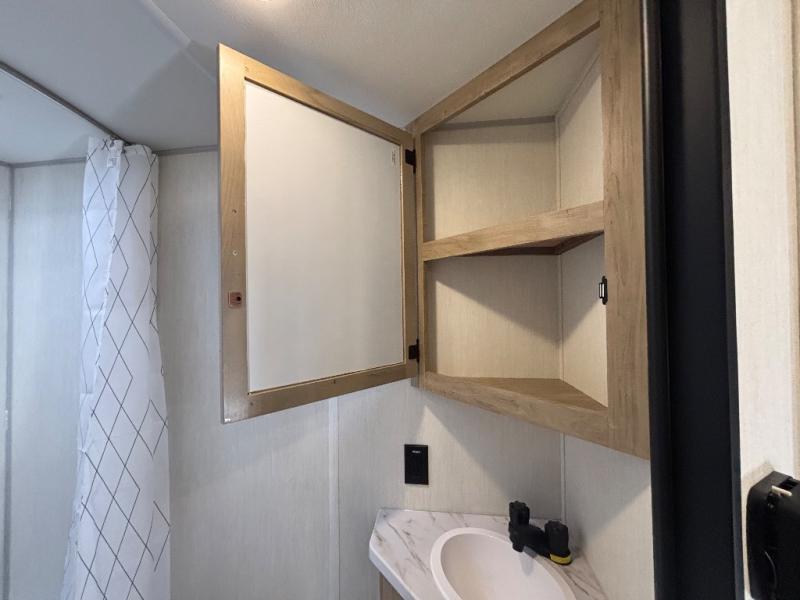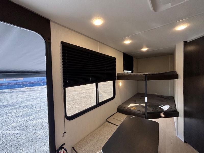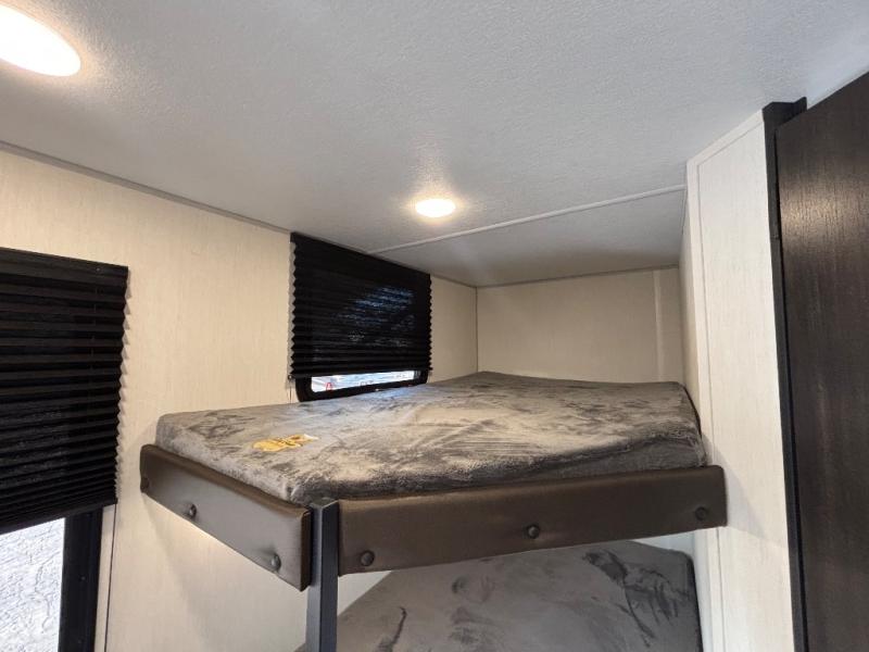 Create amazing memories in this stunning travel trailer! It is perfect for at least six people, thanks to its multiple sleeping spaces. The spacious double-sized bunk beds are ideal for kids or guests, while the plush queen-sized bed provides a restful retreat for adults. The full bathroom is equipped with everything you need for a comfortable stay, and the kitchen features a refrigerator and microwave for you to go wild in the kitchen. You can also gather around the dinette for meals and snacks, or relax in the evenings under the protection of the exterior awning. In addition, ample overhead cabinets provide storage for cookware, dishes, and essentials, keeping your trailer tidy and organized.