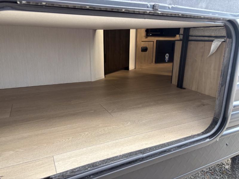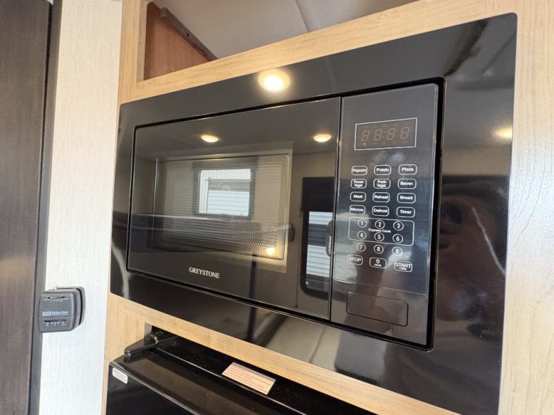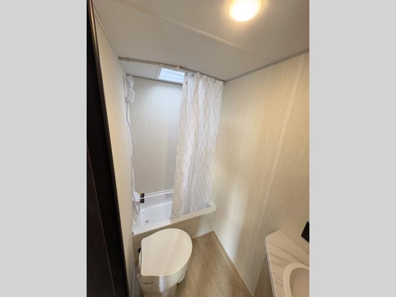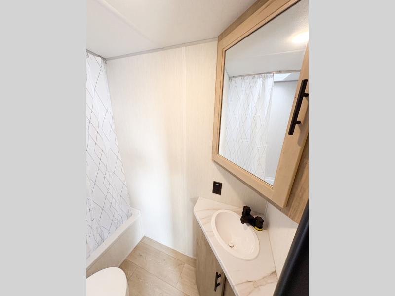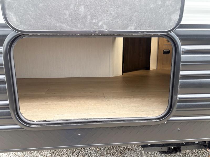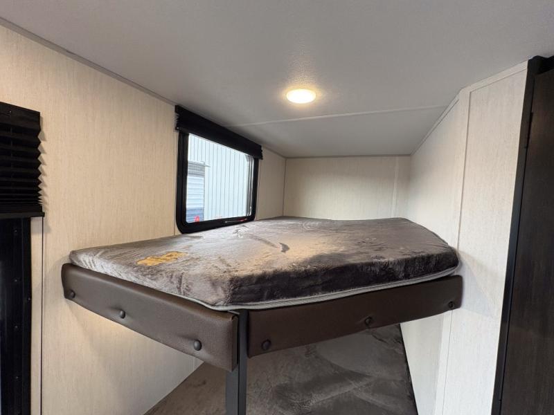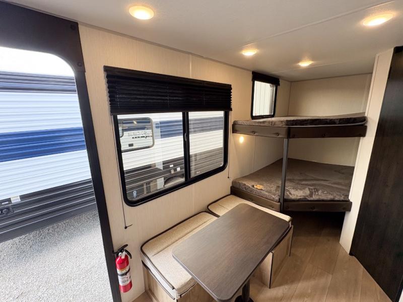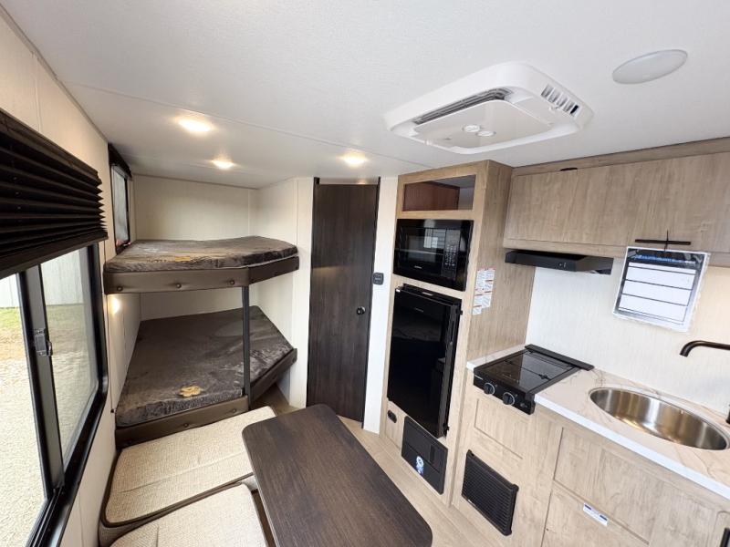 Create amazing memories in this stunning travel trailer! It is perfect for at least six people, thanks to its multiple sleeping spaces. The spacious double-sized bunk beds are ideal for kids or guests, while the plush queen-sized bed provides a restful retreat for adults. The full bathroom is equipped with everything you need for a comfortable stay, and the kitchen features a refrigerator and microwave for you to go wild in the kitchen. You can also gather around the dinette for meals and snacks, or relax in the evenings under the protection of the exterior awning. In addition, ample overhead cabinets provide storage for cookware, dishes, and essentials, keeping your trailer tidy and organized.