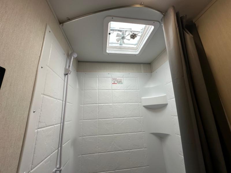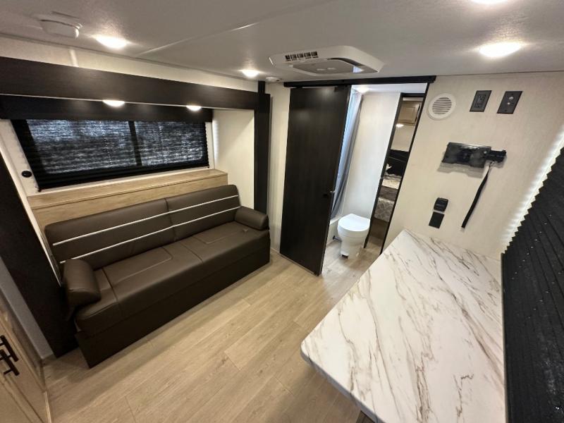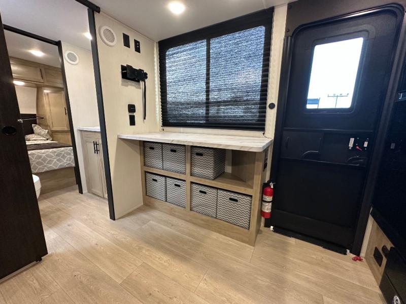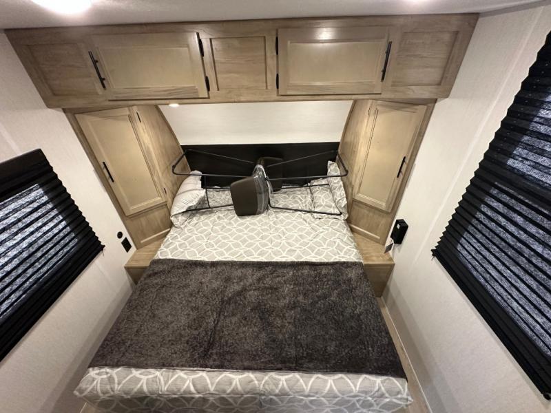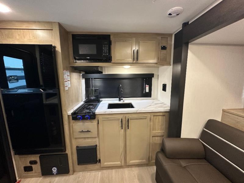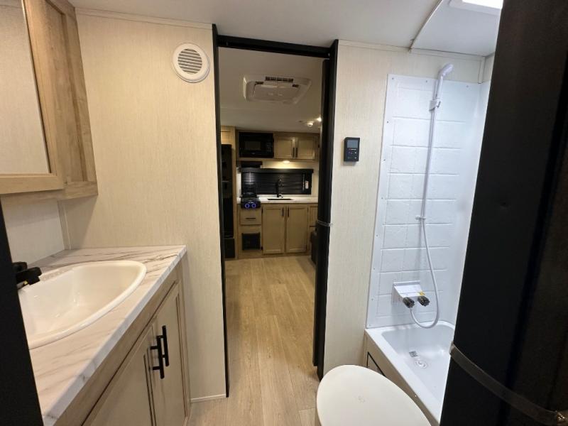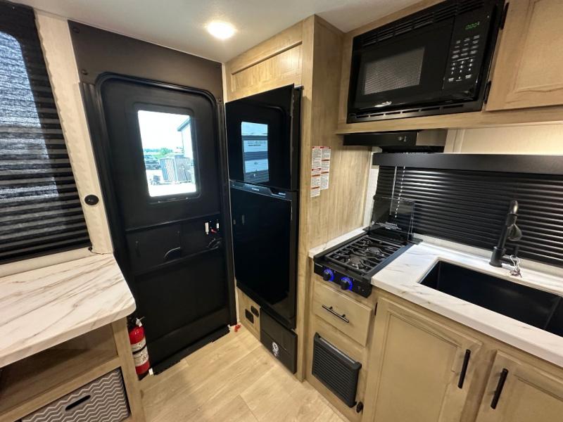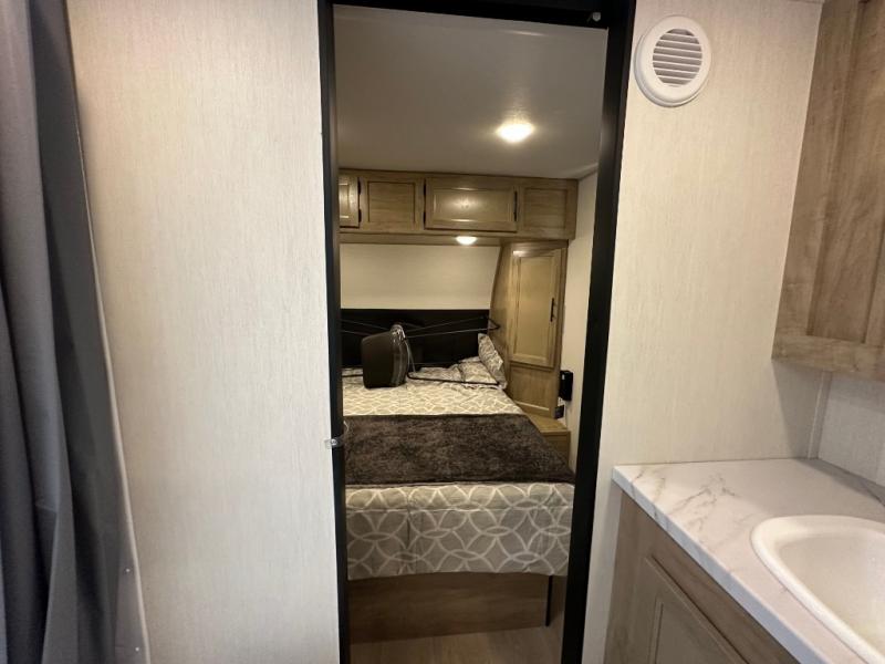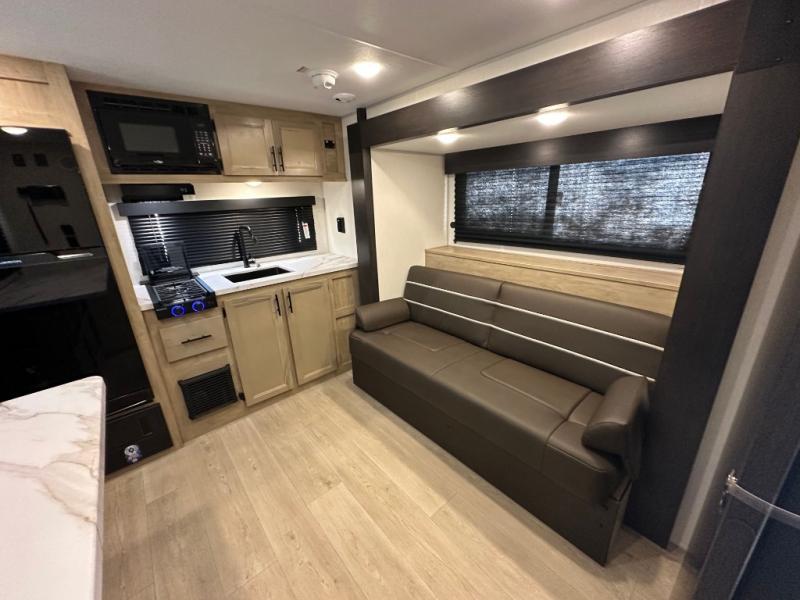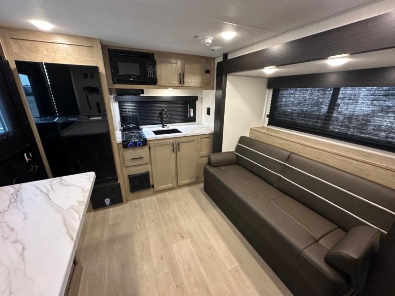 Convenient camping is found with this lightweight travel trailer! Once you arrive at your destination, put out the power awning, then make lunch on the exterior mini kitchen. Inside, you can dine at the bar top with stools, freshen up in the tub/shower, and sleep soundly on the queen bed in the master bedroom. There is also a sofa slide out to provide additional seating, sleeping, and interior space! And you're sure to find plenty of storage spaces both inside and outside, including a rear storage rack!
