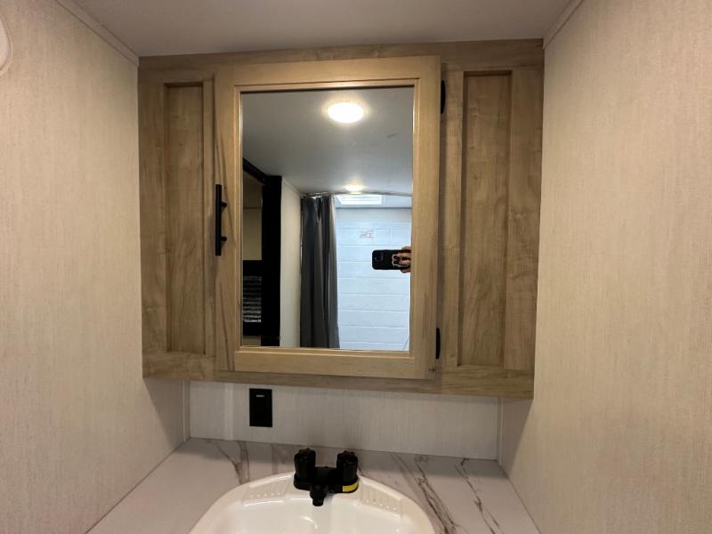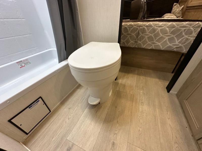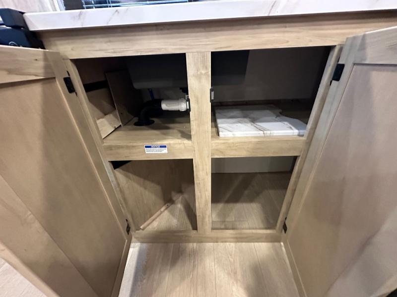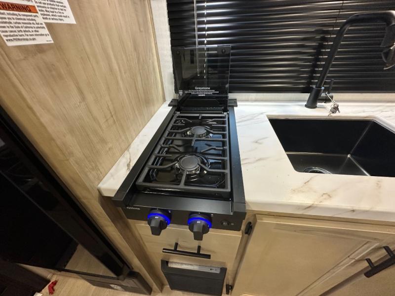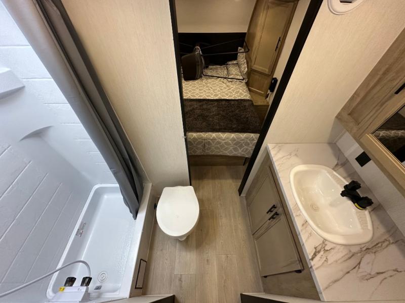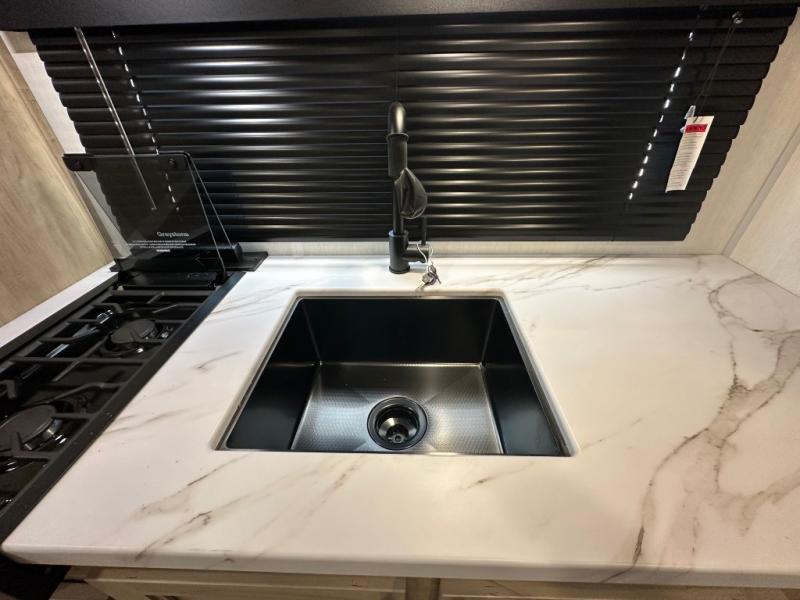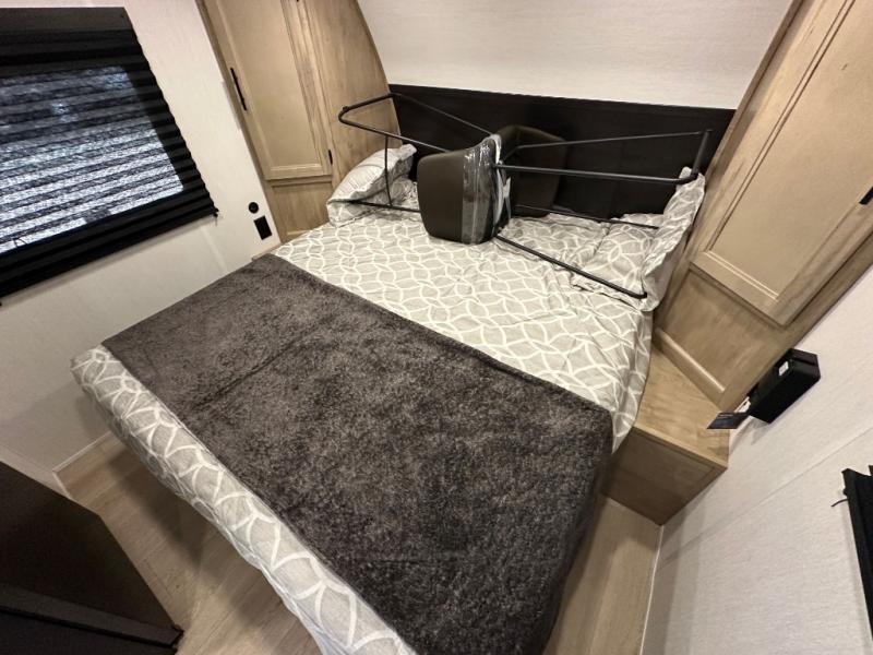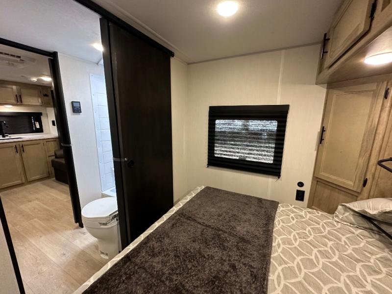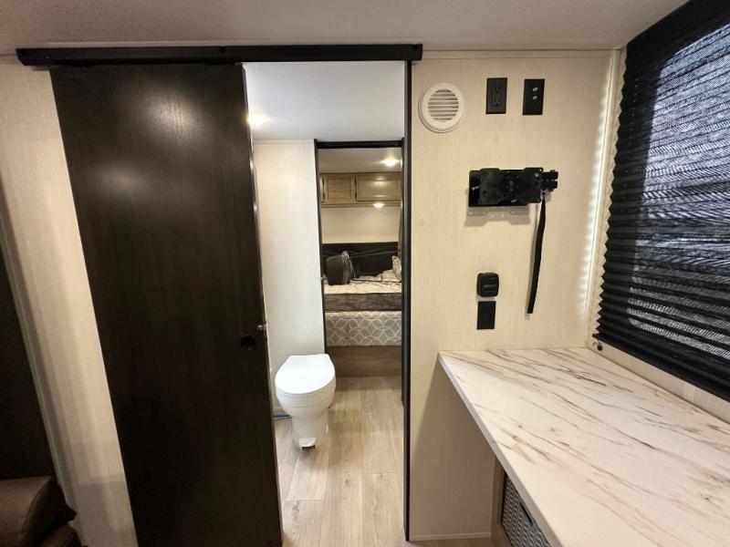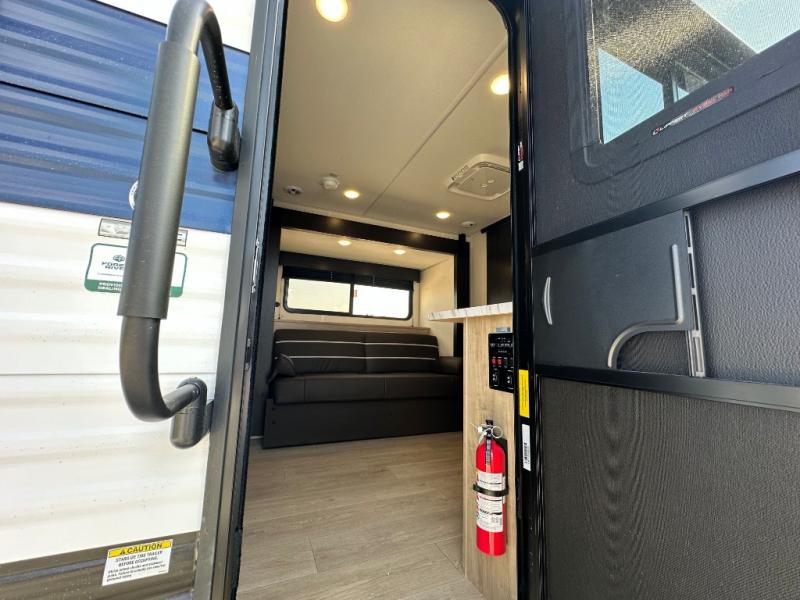 Convenient camping is found with this lightweight travel trailer! Once you arrive at your destination, put out the power awning, then make lunch on the exterior mini kitchen. Inside, you can dine at the bar top with stools, freshen up in the tub/shower, and sleep soundly on the queen bed in the master bedroom. There is also a sofa slide out to provide additional seating, sleeping, and interior space! And you're sure to find plenty of storage spaces both inside and outside, including a rear storage rack!