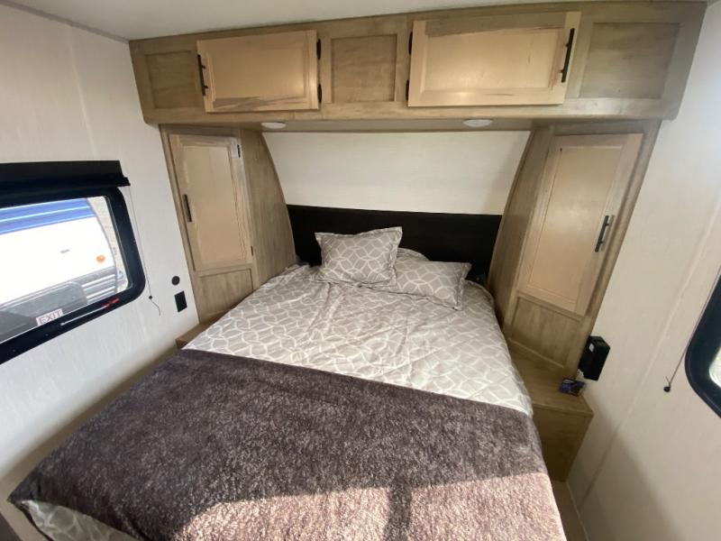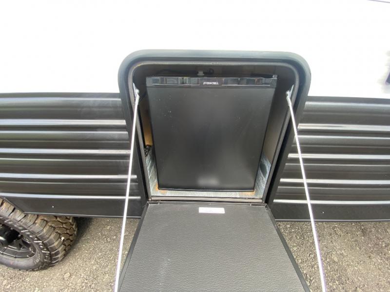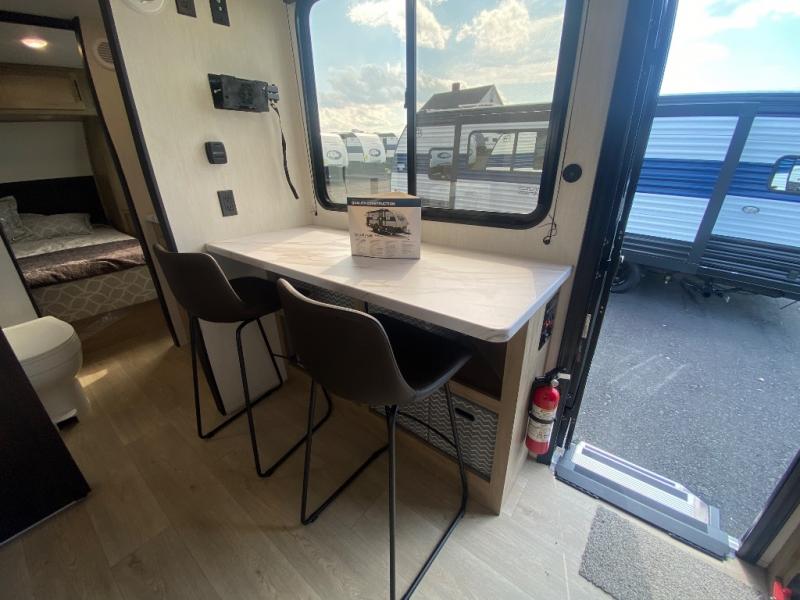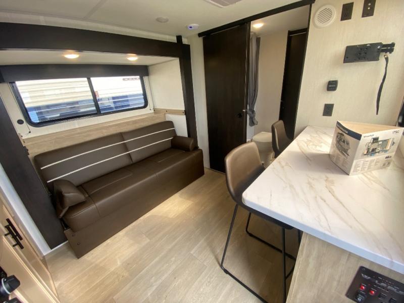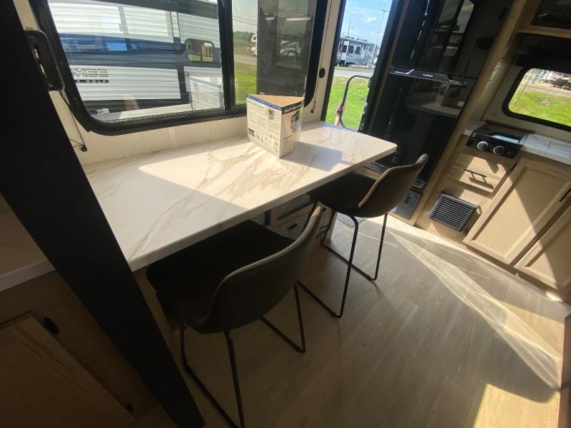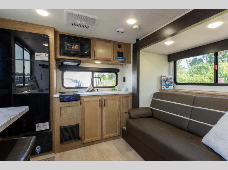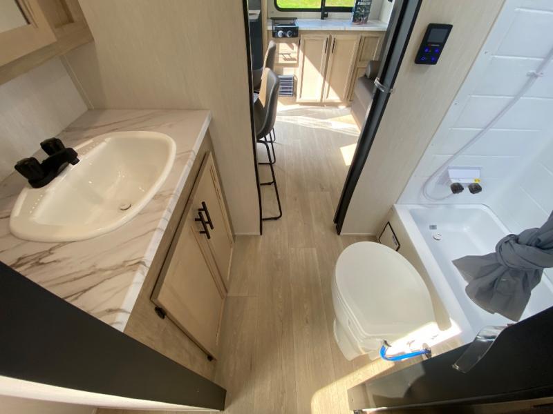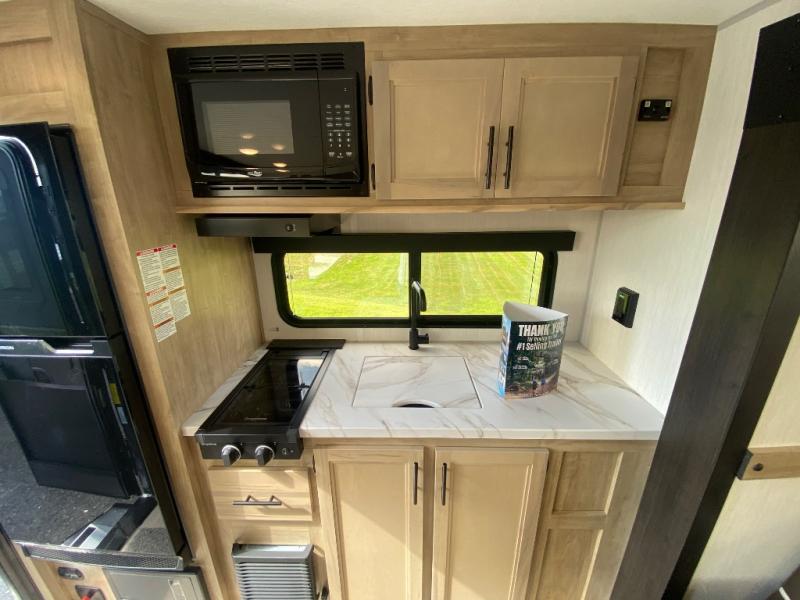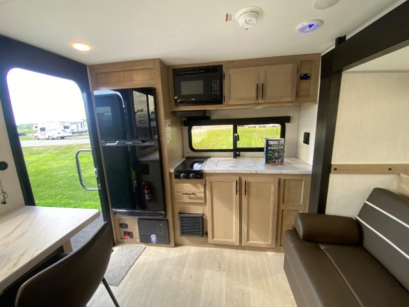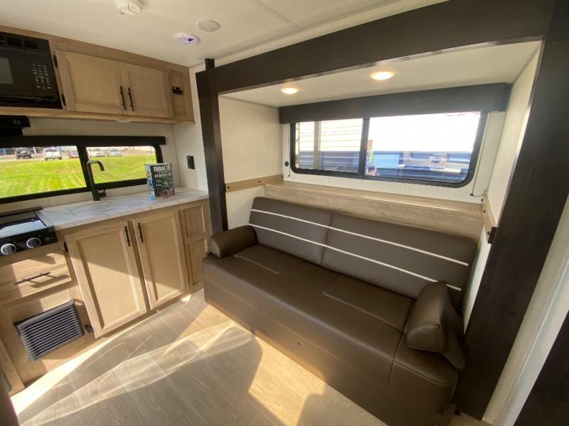 Convenient camping is found with this lightweight travel trailer! Once you arrive at your destination, put out the power awning, then make lunch on the exterior mini kitchen. Inside, you can dine at the bar top with stools, freshen up in the tub/shower, and sleep soundly on the queen bed in the master bedroom. There is also a sofa slide out to provide additional seating, sleeping, and interior space! And you're sure to find plenty of storage spaces both inside and outside, including a rear storage rack!