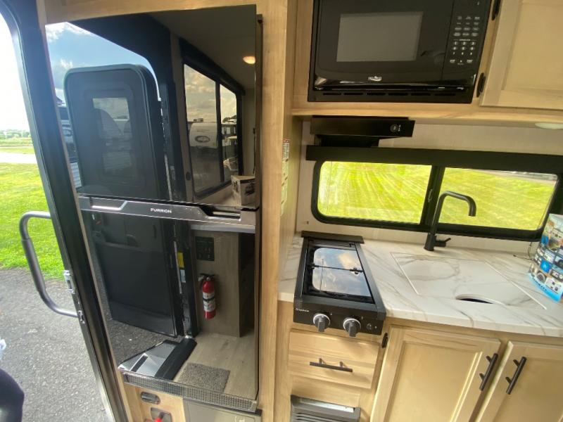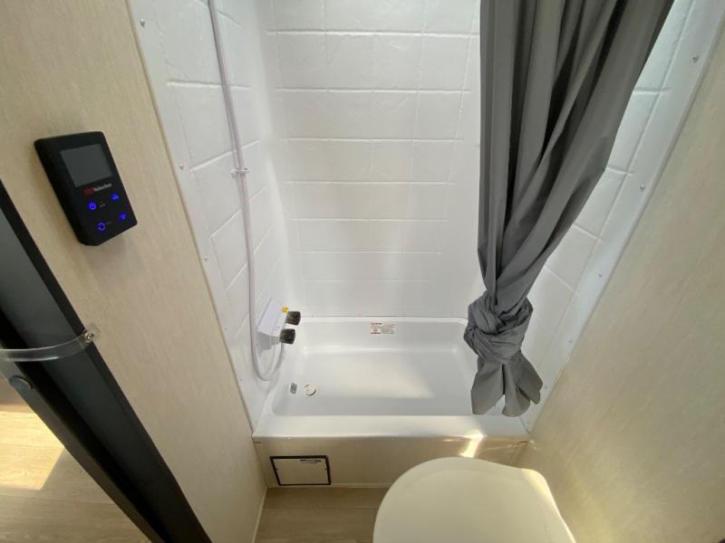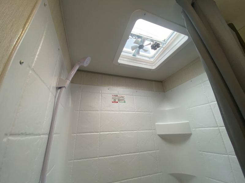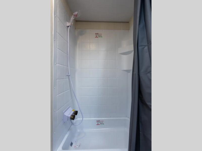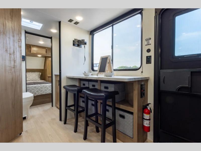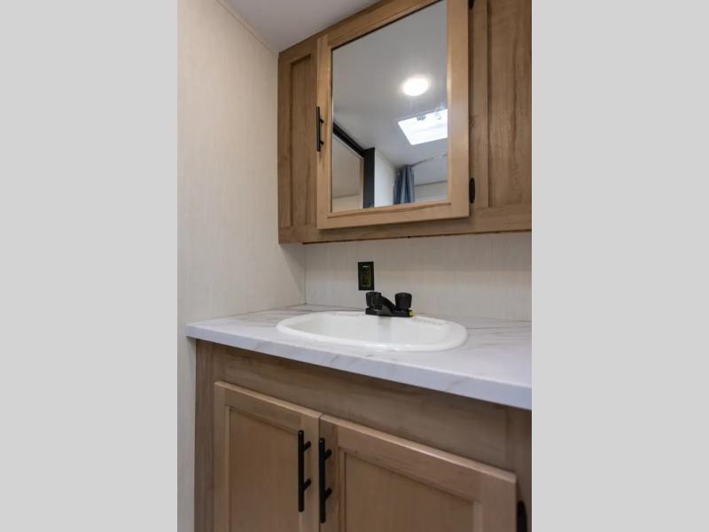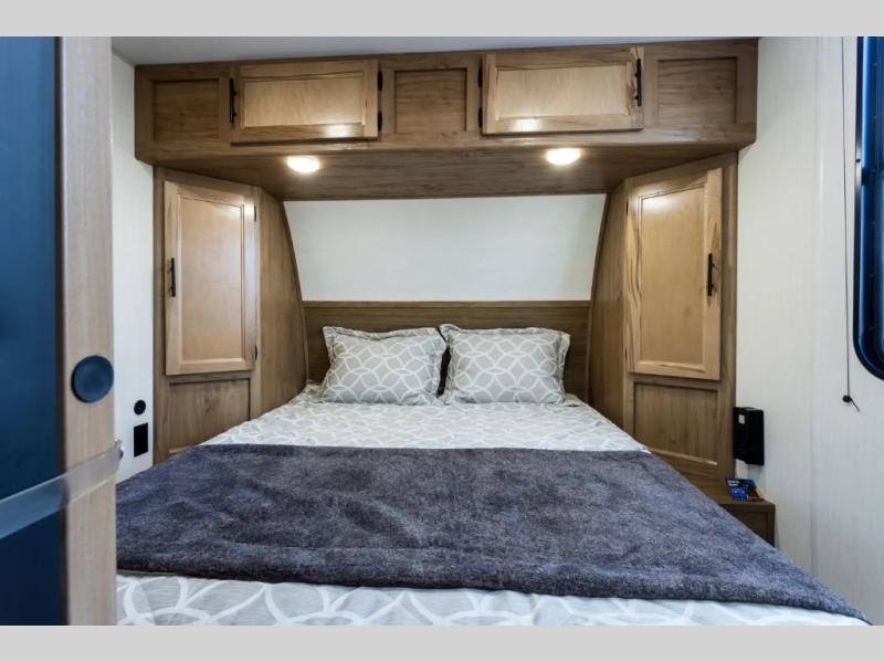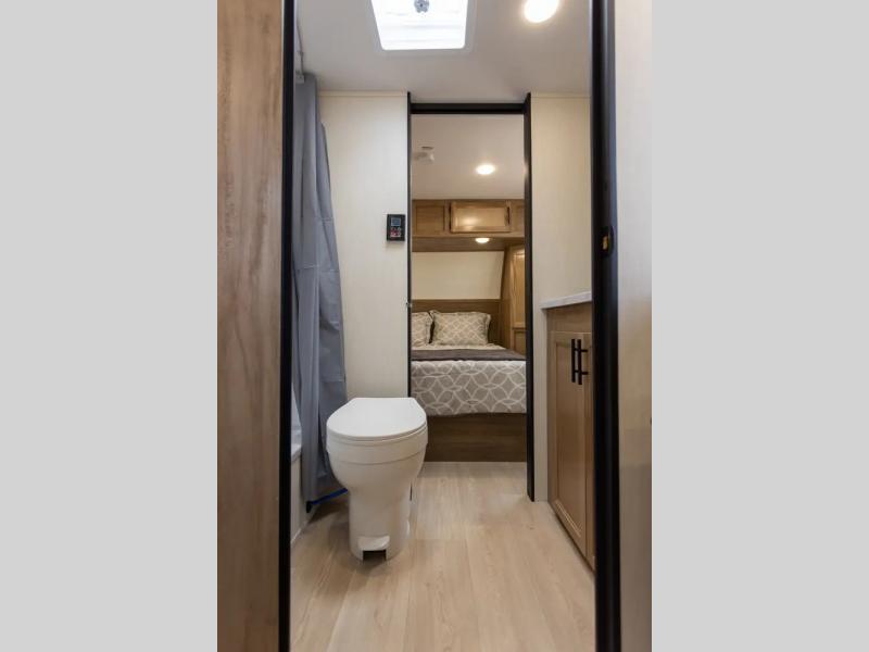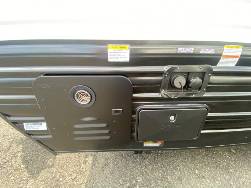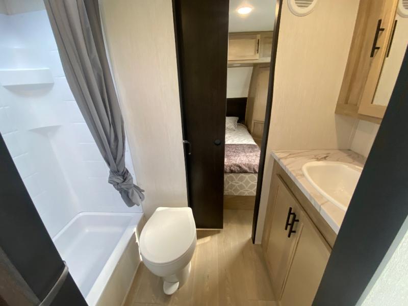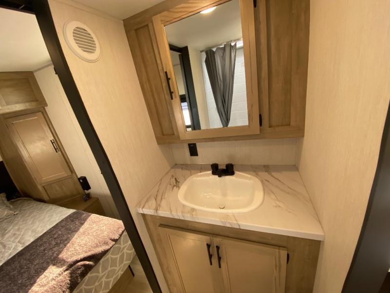 Convenient camping is found with this lightweight travel trailer! Once you arrive at your destination, put out the power awning, then make lunch on the exterior mini kitchen. Inside, you can dine at the bar top with stools, freshen up in the tub/shower, and sleep soundly on the queen bed in the master bedroom. There is also a sofa slide out to provide additional seating, sleeping, and interior space! And you're sure to find plenty of storage spaces both inside and outside, including a rear storage rack!