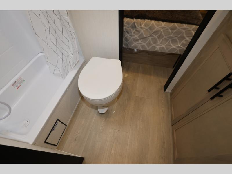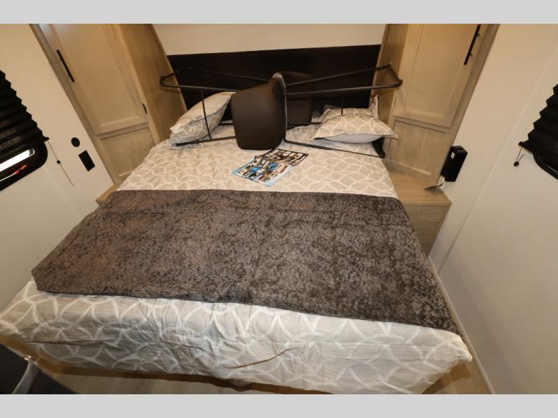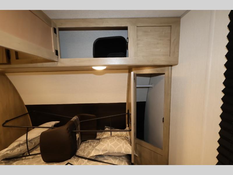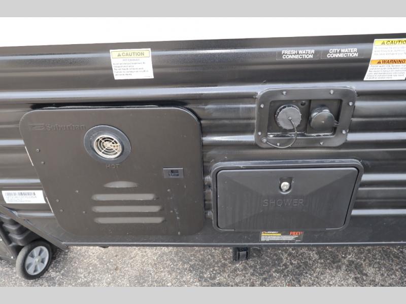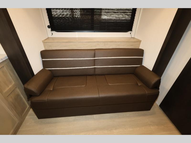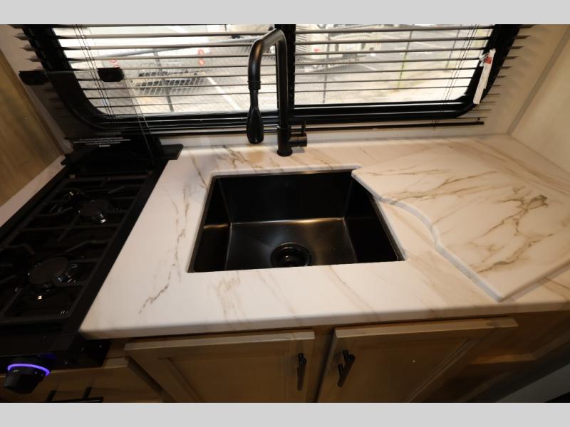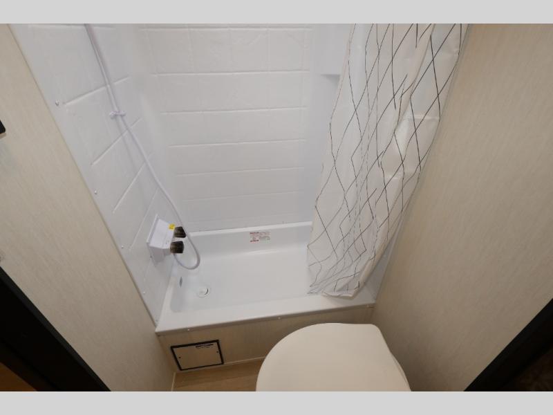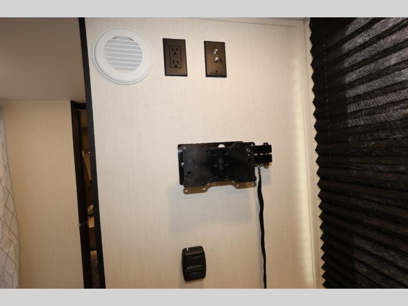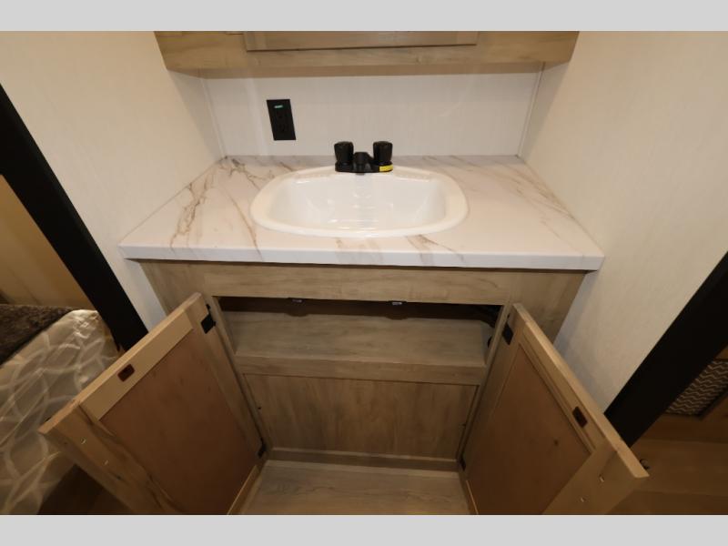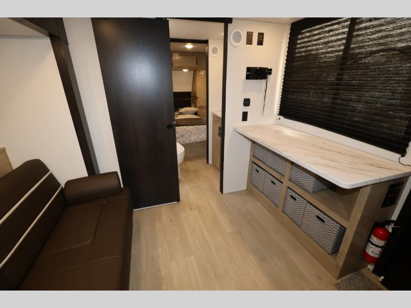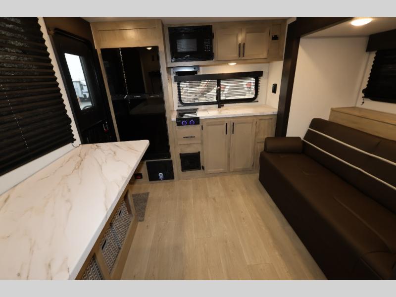 Convenient camping is found with this lightweight travel trailer! Once you arrive at your destination, put out the power awning, then make lunch on the exterior mini kitchen. Inside, you can dine at the bar top with stools, freshen up in the tub/shower, and sleep soundly on the queen bed in the master bedroom. There is also a sofa slide out to provide additional seating, sleeping, and interior space! And you're sure to find plenty of storage spaces both inside and outside, including a rear storage rack!