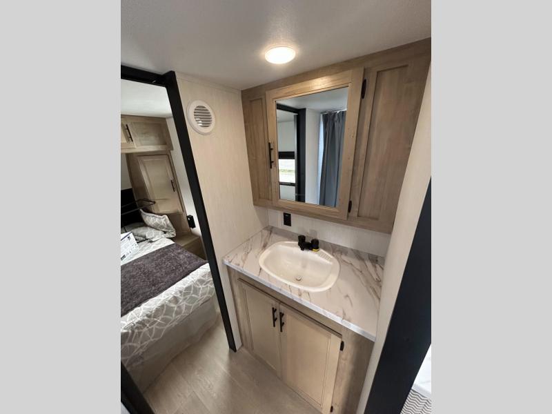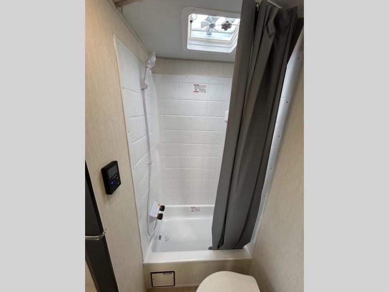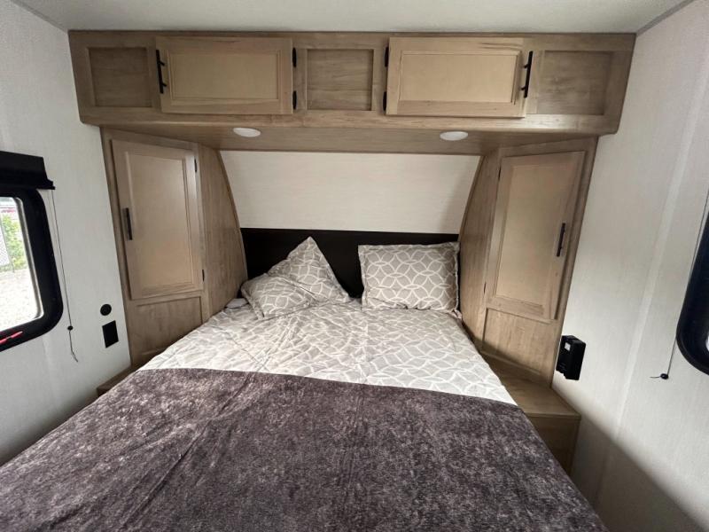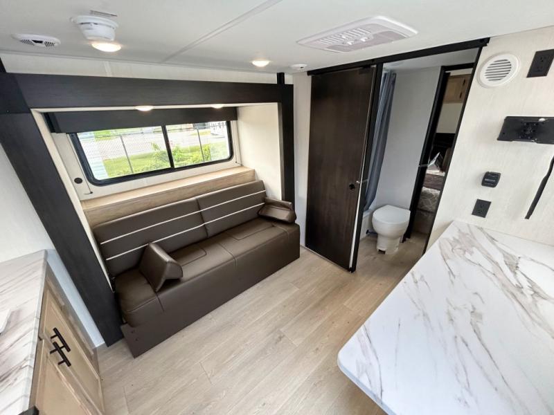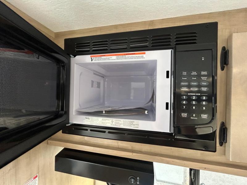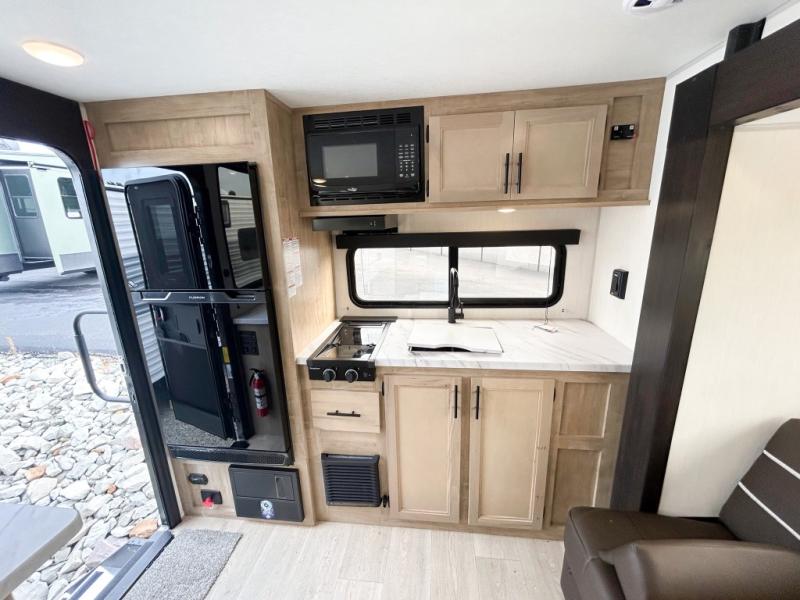 Convenient camping is found with this lightweight travel trailer! Once you arrive at your destination, put out the power awning, then make lunch on the exterior mini kitchen. Inside, you can dine at the bar top with stools, freshen up in the tub/shower, and sleep soundly on the queen bed in the master bedroom. There is also a sofa slide out to provide additional seating, sleeping, and interior space! And you're sure to find plenty of storage spaces both inside and outside, including a rear storage rack!