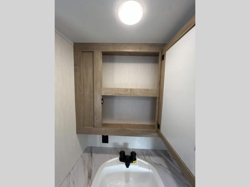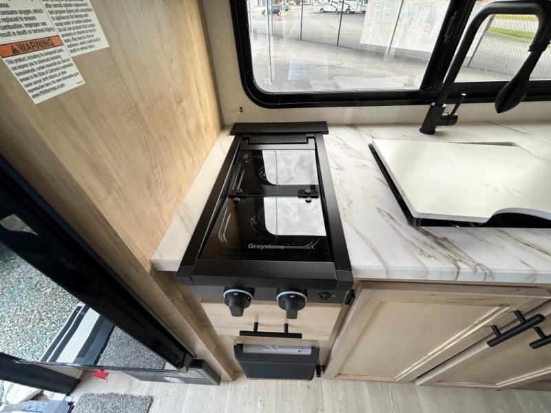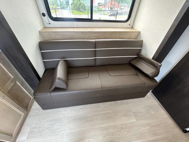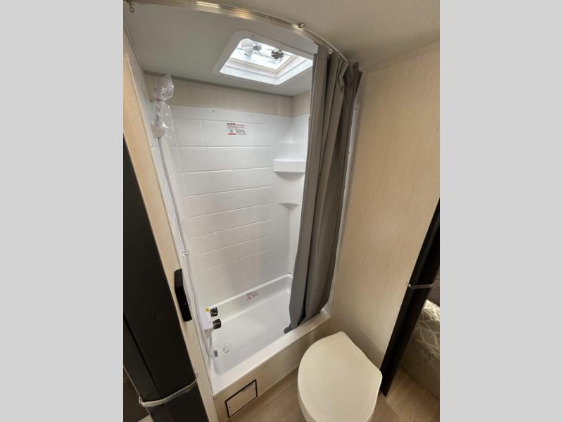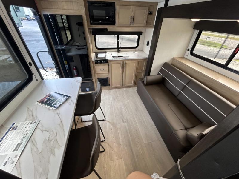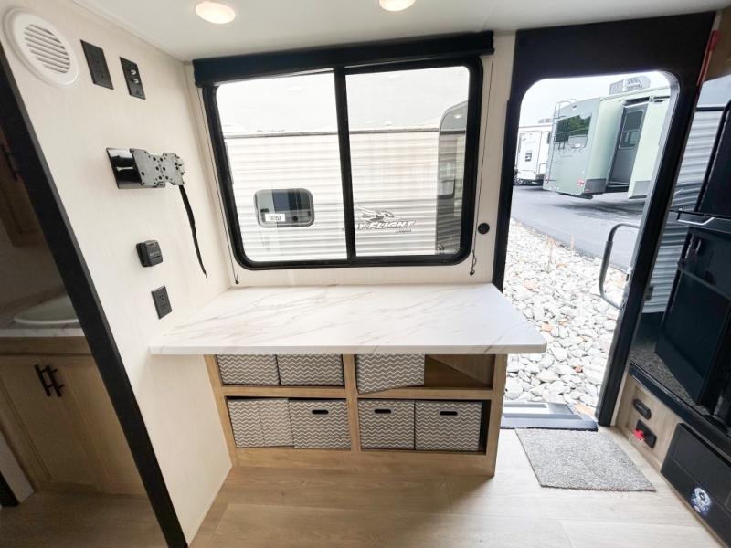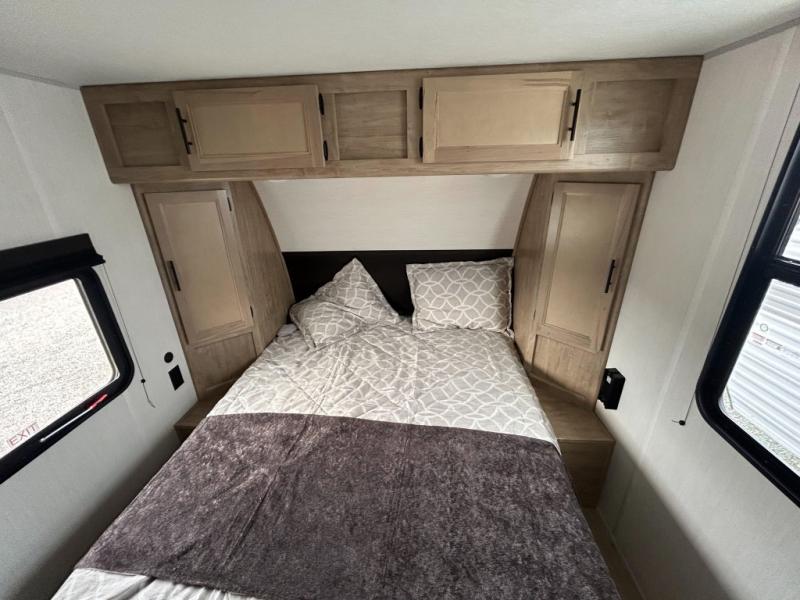 Convenient camping is found with this lightweight travel trailer! Once you arrive at your destination, put out the power awning, then make lunch on the exterior mini kitchen. Inside, you can dine at the bar top with stools, freshen up in the tub/shower, and sleep soundly on the queen bed in the master bedroom. There is also a sofa slide out to provide additional seating, sleeping, and interior space! And you're sure to find plenty of storage spaces both inside and outside, including a rear storage rack!