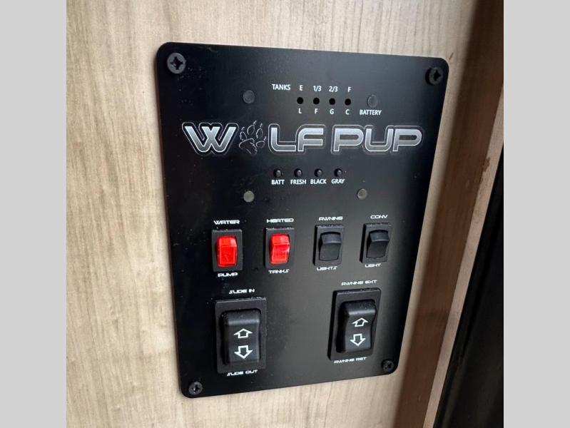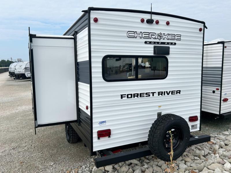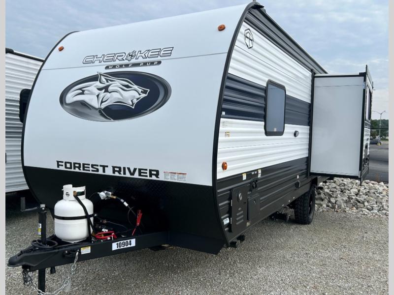 Each one of these Forest River Cherokee Wolf Pup travel trailers are lightweight and easy to tow! They are fully self contained with ample tank capacities, an abundance of storage space, and filled with at home amenities. The aerodynamic smooth radius front profile, the Power Gear frame technology, and the space saver rail design make them easier to maneuver. You will also appreciate the seamless roofing membrane with heat reflectivity to keep the sun from making your unit a hot box. The tongue and groove plywood flooring will hold up for years of fun and the USB charging stations help to keep your electronics at 100% while you're away. Come find the best model for you today!