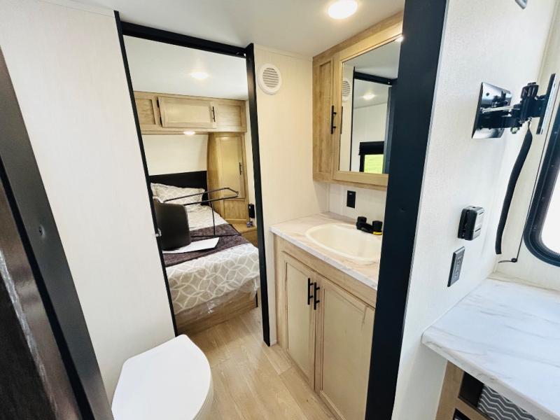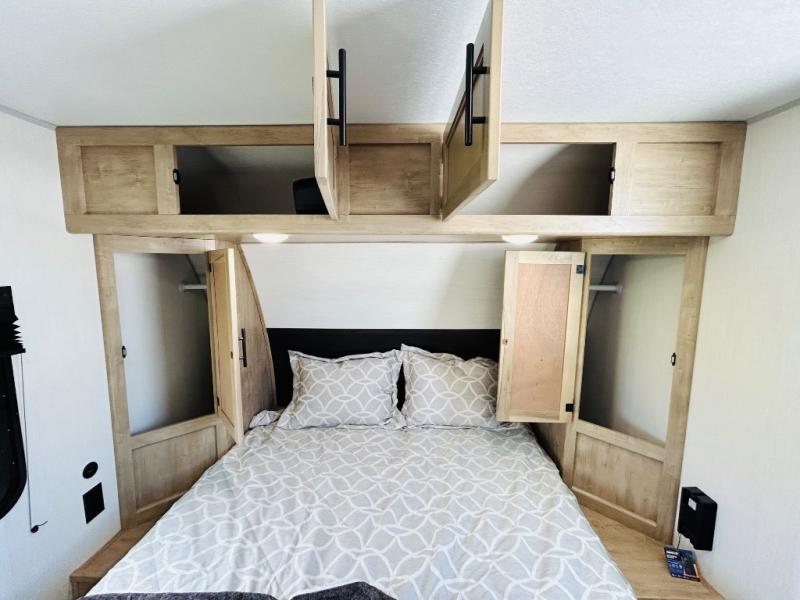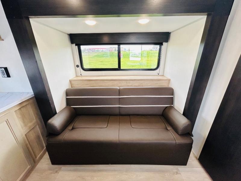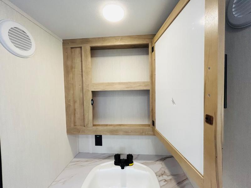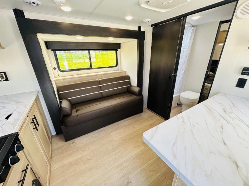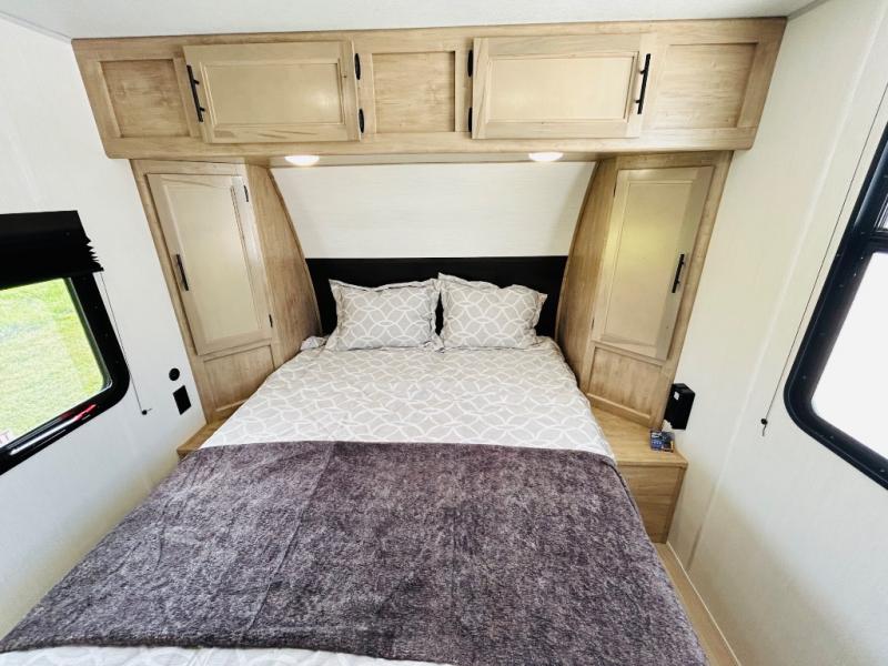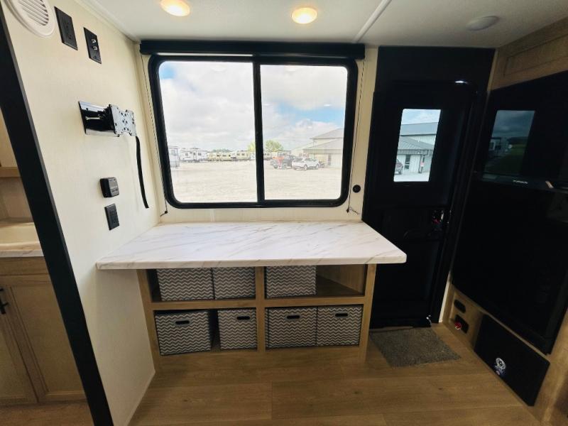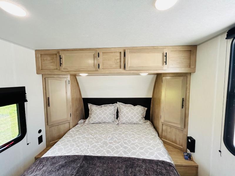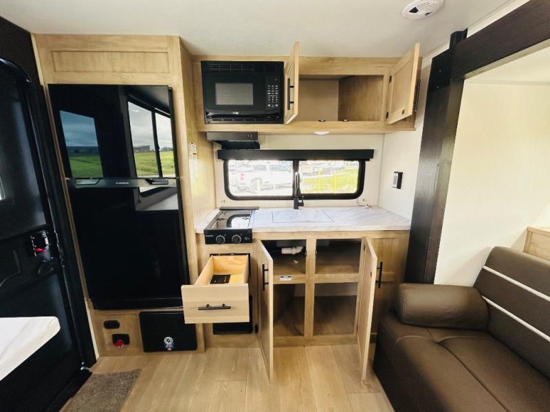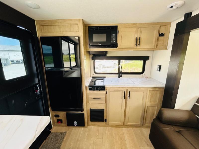Convenient camping is found with this lightweight travel trailer! Once you arrive at your destination, put out the power awning, then make lunch on the exterior mini kitchen. Inside, you can dine at the bar top with stools, freshen up in the tub/shower, and sleep soundly on the queen bed in the master bedroom. There is also a sofa slide out to provide additional seating, sleeping, and interior space! And you're sure to find plenty of storage spaces both inside and outside, including a rear storage rack!