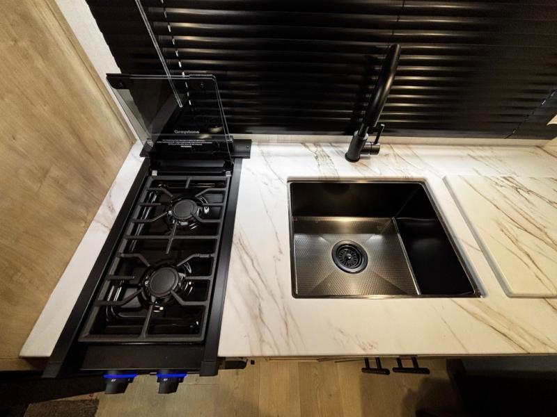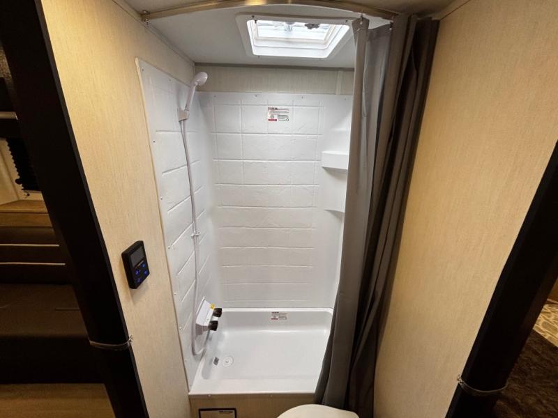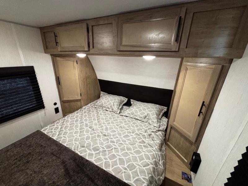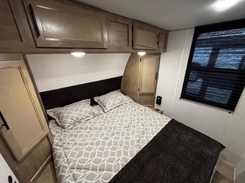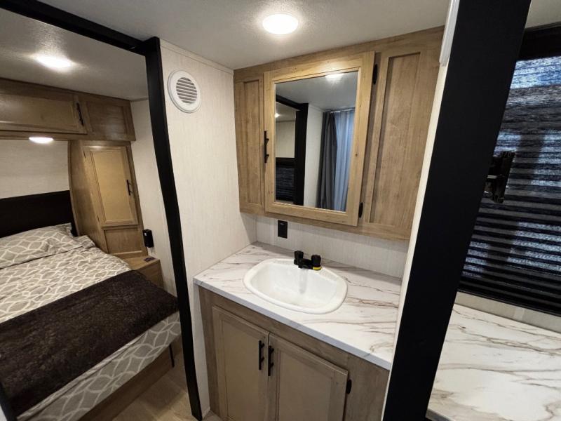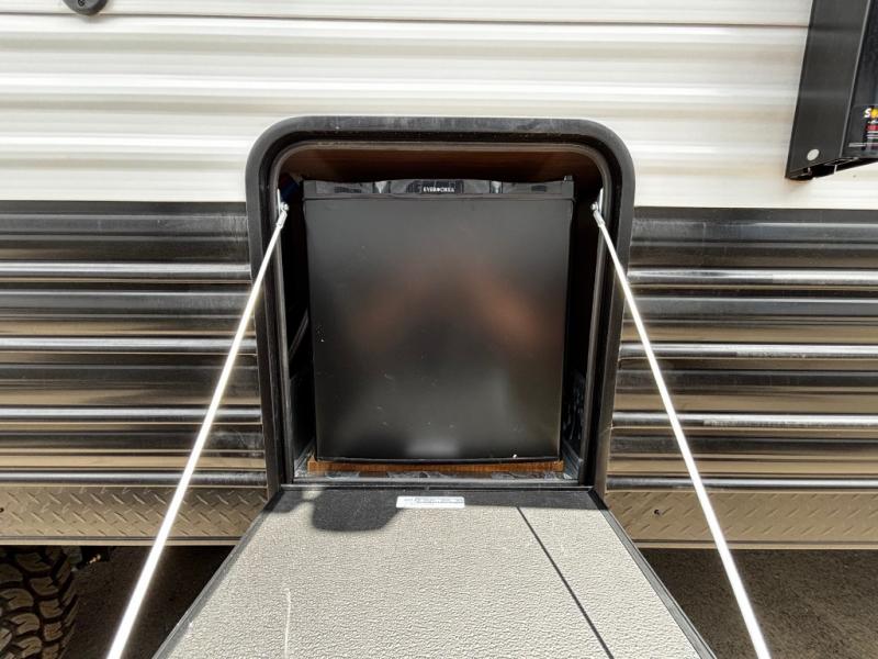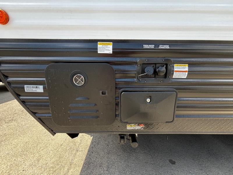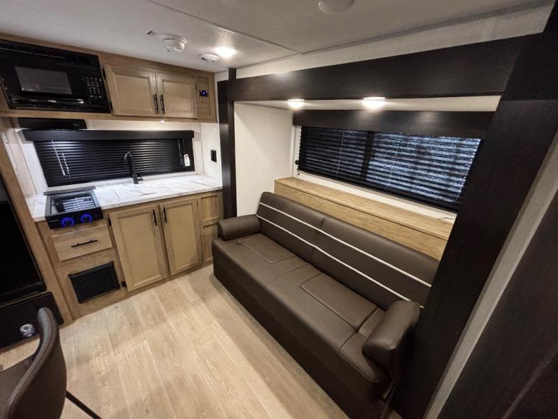 Convenient camping is found with this lightweight travel trailer! Once you arrive at your destination, put out the power awning, then make lunch on the exterior mini kitchen. Inside, you can dine at the bar top with stools, freshen up in the tub/shower, and sleep soundly on the queen bed in the master bedroom. There is also a sofa slide out to provide additional seating, sleeping, and interior space! And you're sure to find plenty of storage spaces both inside and outside, including a rear storage rack!