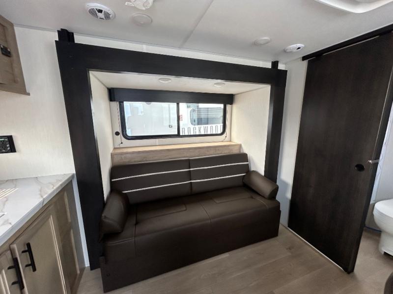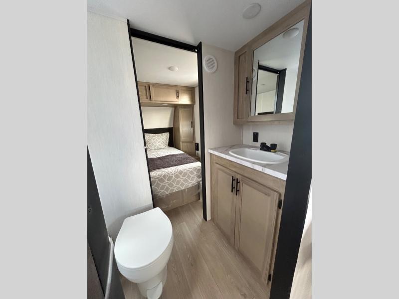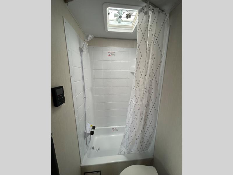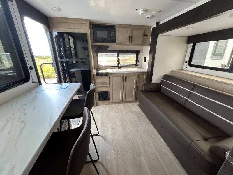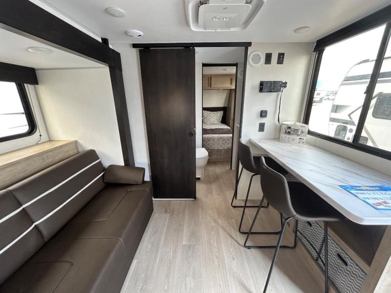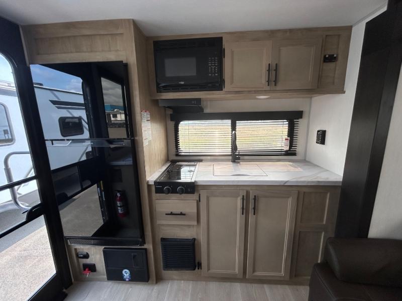 Convenient camping is found with this lightweight travel trailer! Once you arrive at your destination, put out the power awning, then make lunch on the exterior mini kitchen. Inside, you can dine at the bar top with stools, freshen up in the tub/shower, and sleep soundly on the queen bed in the master bedroom. There is also a sofa slide out to provide additional seating, sleeping, and interior space! And you're sure to find plenty of storage spaces both inside and outside, including a rear storage rack!