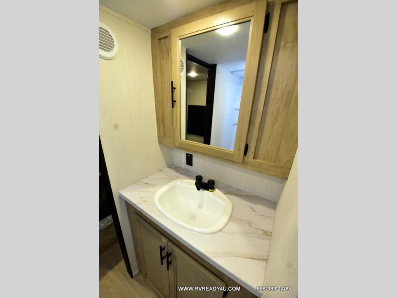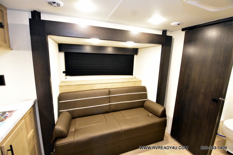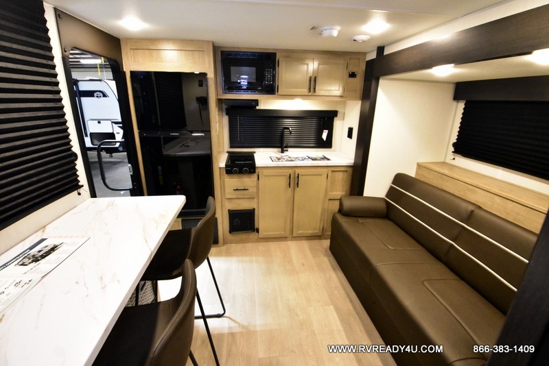 Convenient camping is found with this lightweight travel trailer! Once you arrive at your destination, put out the power awning, then make lunch on the exterior mini kitchen. Inside, you can dine at the bar top with stools, freshen up in the tub/shower, and sleep soundly on the queen bed in the master bedroom. There is also a sofa slide out to provide additional seating, sleeping, and interior space! And you're sure to find plenty of storage spaces both inside and outside, including a rear storage rack!