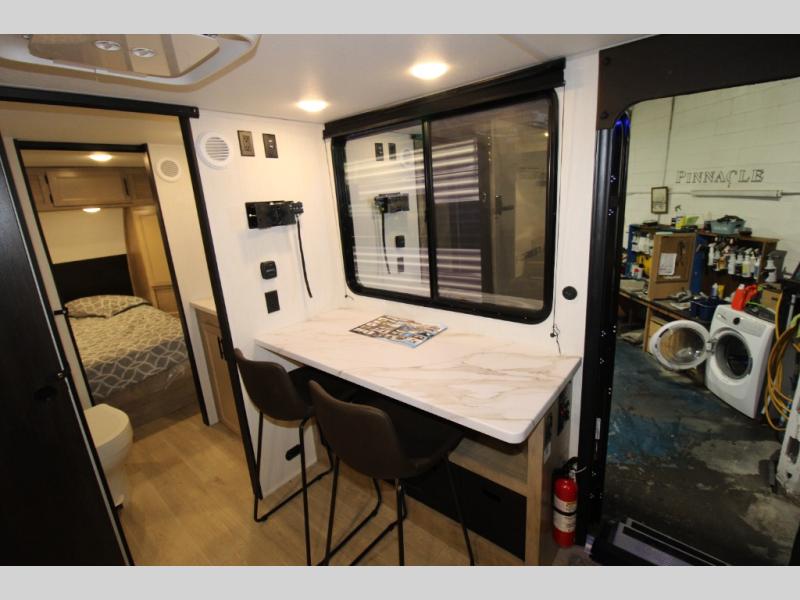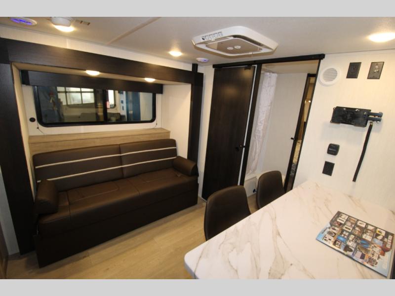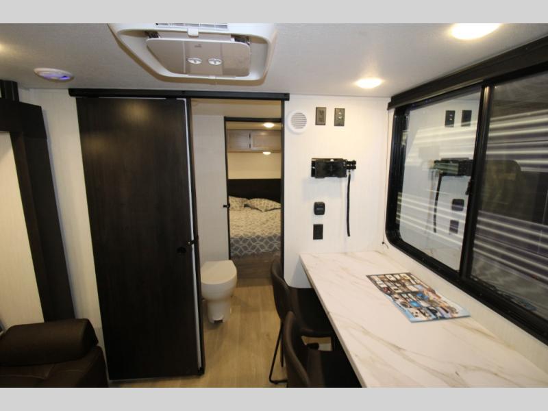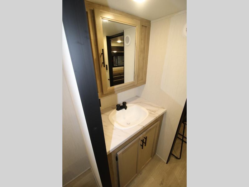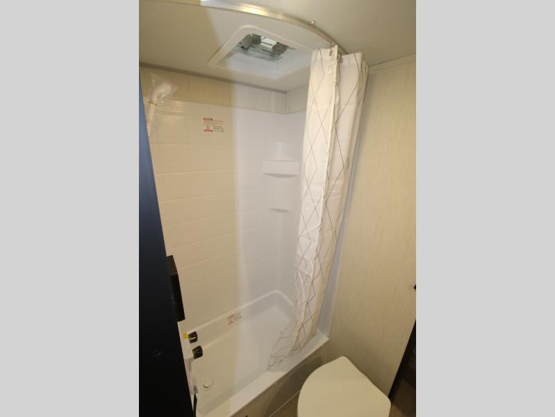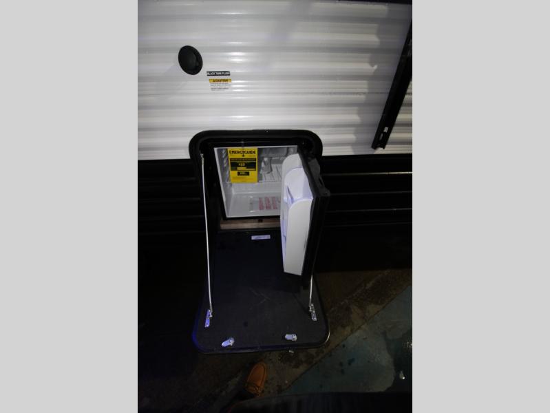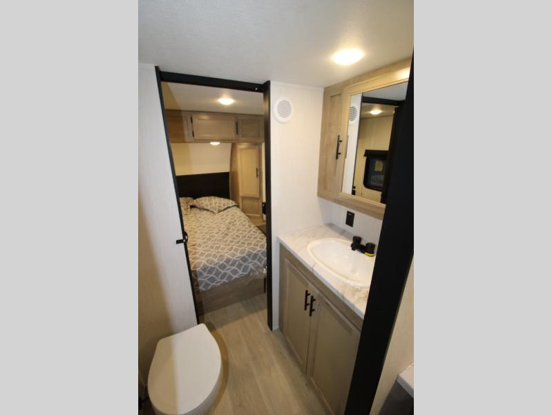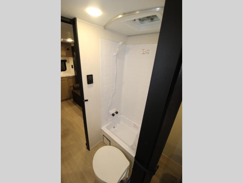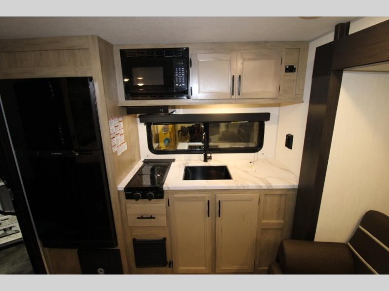 Convenient camping is found with this lightweight travel trailer! Once you arrive at your destination, put out the power awning, then make lunch on the exterior mini kitchen. Inside, you can dine at the bar top with stools, freshen up in the tub/shower, and sleep soundly on the queen bed in the master bedroom. There is also a sofa slide out to provide additional seating, sleeping, and interior space! And you're sure to find plenty of storage spaces both inside and outside, including a rear storage rack!
