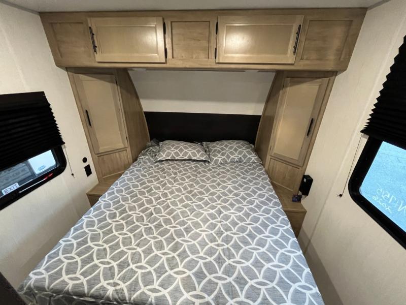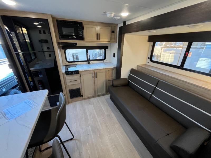 Convenient camping is found with this lightweight travel trailer! Once you arrive at your destination, put out the power awning, then make lunch on the exterior mini kitchen. Inside, you can dine at the bar top with stools, freshen up in the tub/shower, and sleep soundly on the queen bed in the master bedroom. There is also a sofa slide out to provide additional seating, sleeping, and interior space! And you're sure to find plenty of storage spaces both inside and outside, including a rear storage rack!