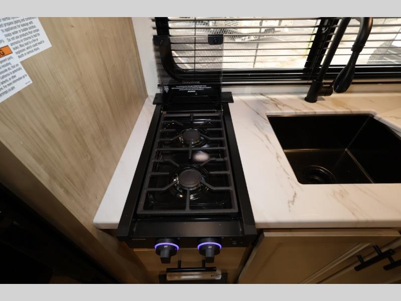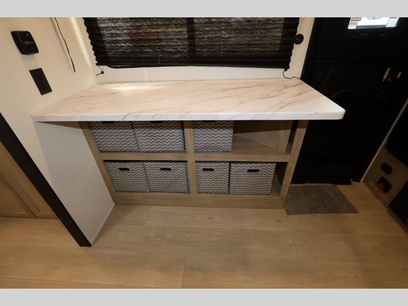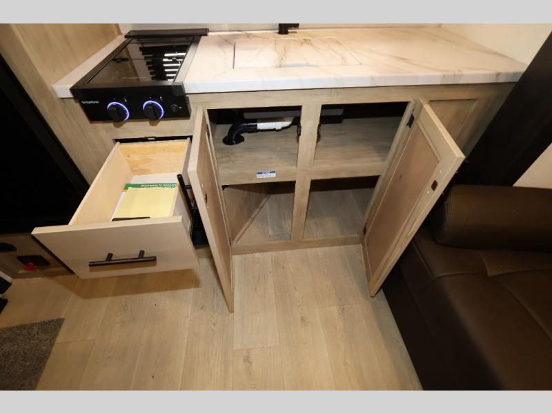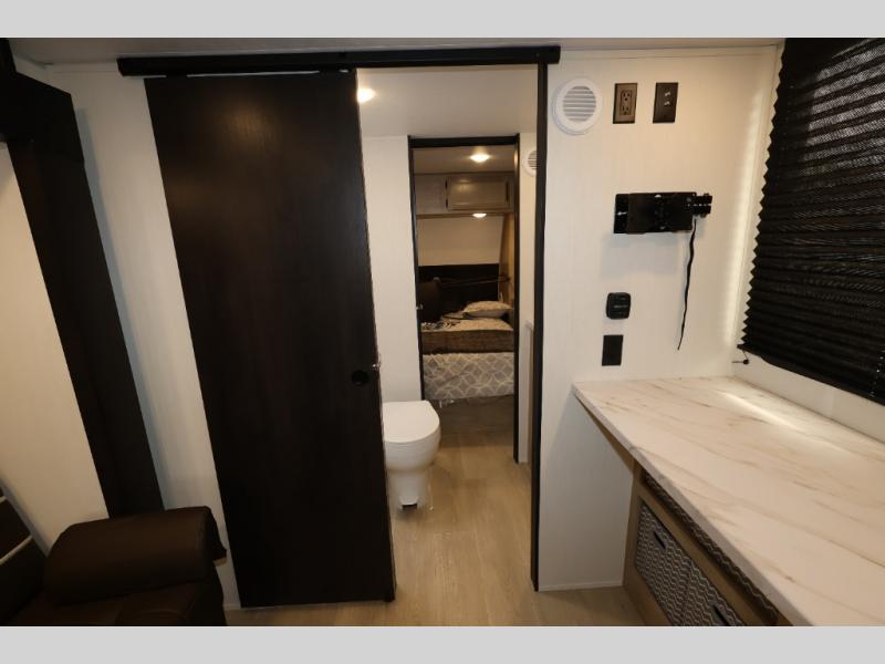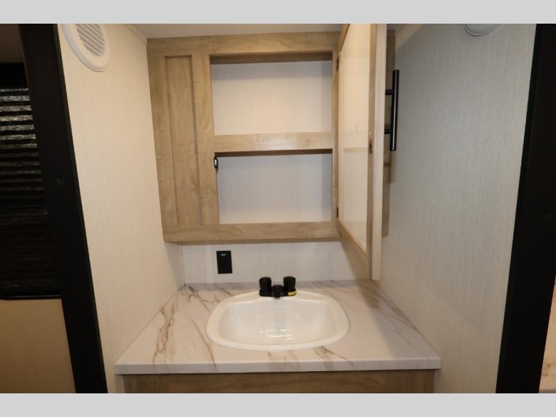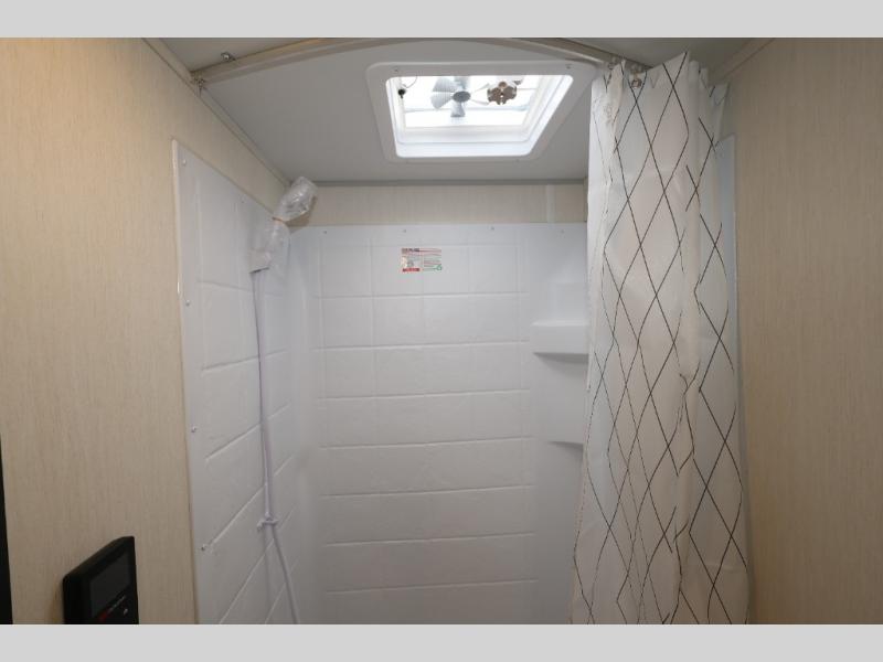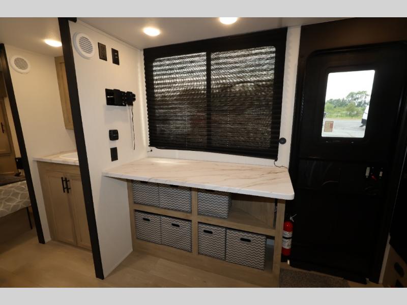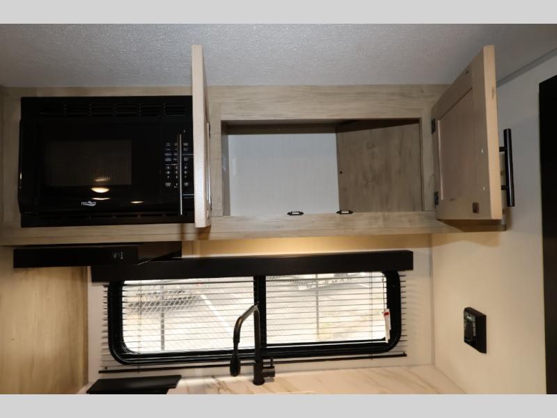 Convenient camping is found with this lightweight travel trailer! Once you arrive at your destination, put out the power awning, then make lunch on the exterior mini kitchen. Inside, you can dine at the bar top with stools, freshen up in the tub/shower, and sleep soundly on the queen bed in the master bedroom. There is also a sofa slide out to provide additional seating, sleeping, and interior space! And you're sure to find plenty of storage spaces both inside and outside, including a rear storage rack!