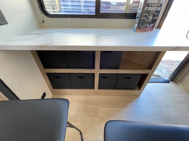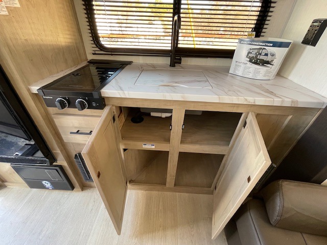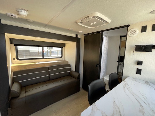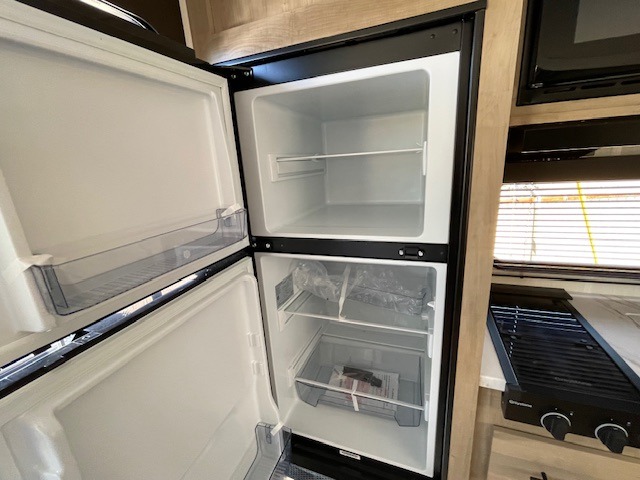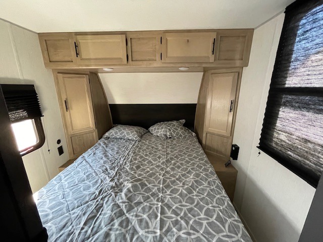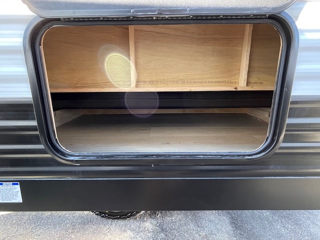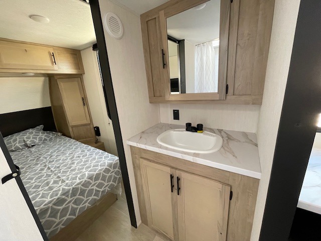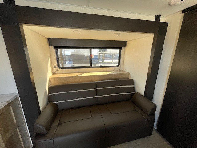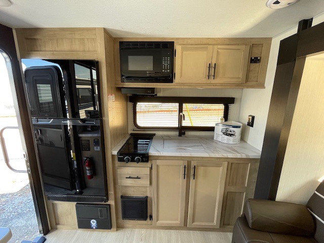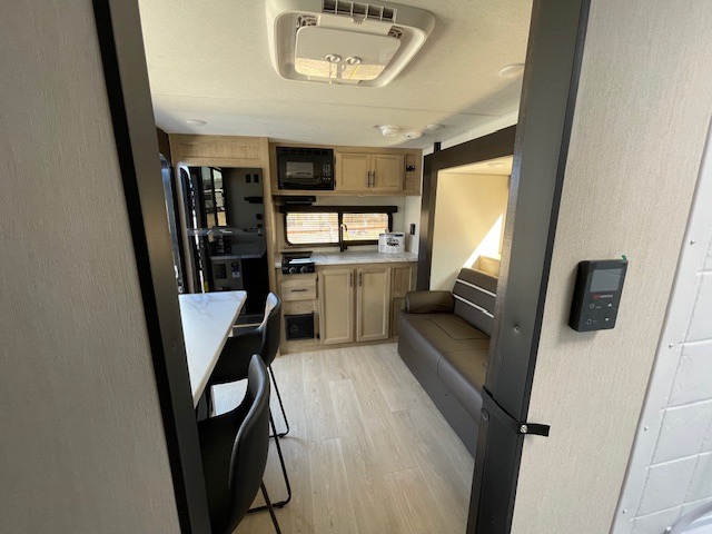 Convenient camping is found with this lightweight travel trailer! Once you arrive at your destination, put out the power awning, then make lunch on the exterior mini kitchen. Inside, you can dine at the bar top with stools, freshen up in the tub/shower, and sleep soundly on the queen bed in the master bedroom. There is also a sofa slide out to provide additional seating, sleeping, and interior space! And you're sure to find plenty of storage spaces both inside and outside, including a rear storage rack!