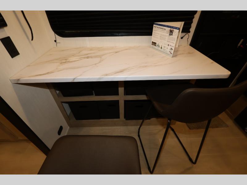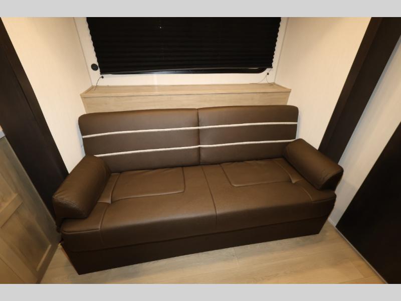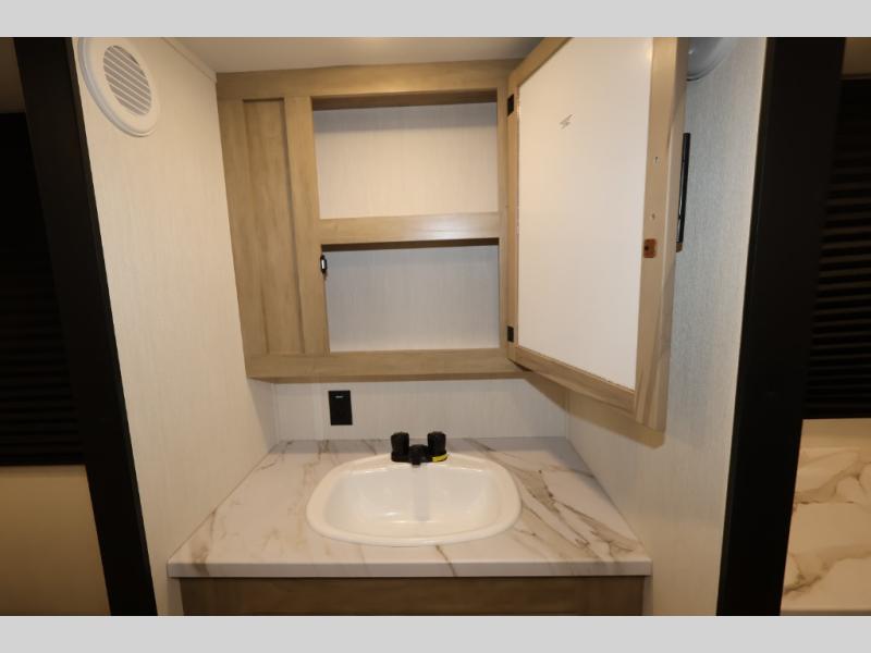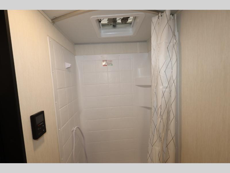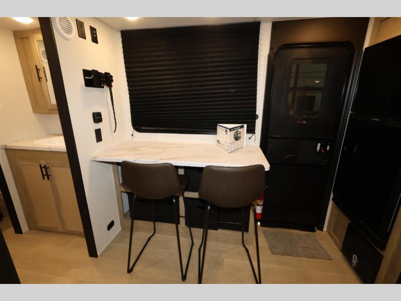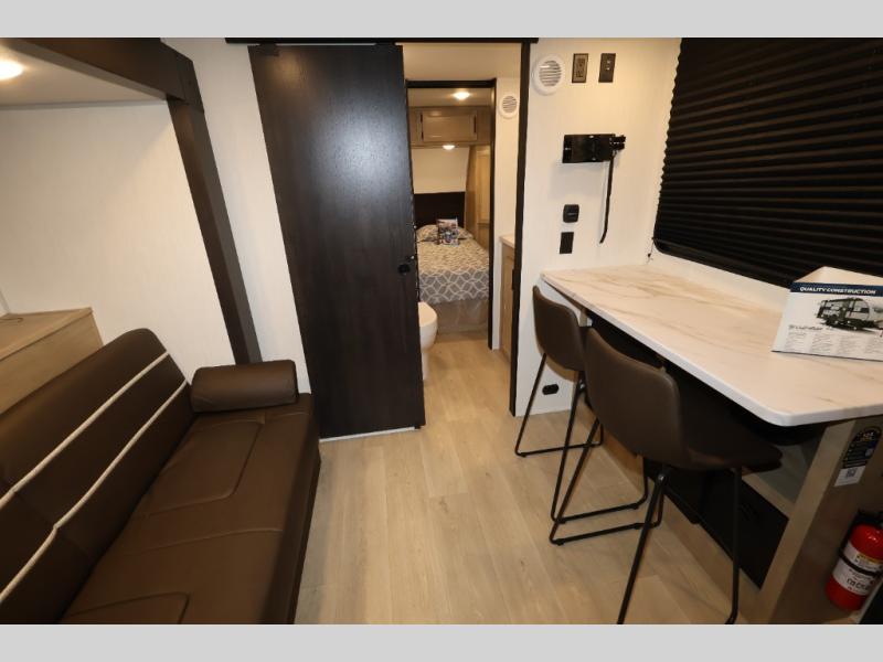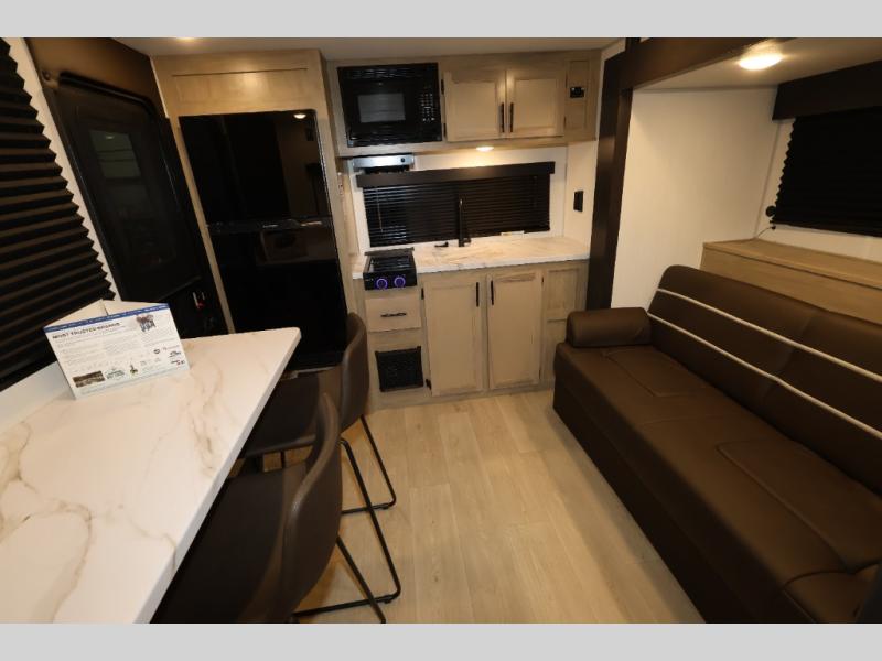 Convenient camping is found with this lightweight travel trailer! Once you arrive at your destination, put out the power awning, then make lunch on the exterior mini kitchen. Inside, you can dine at the bar top with stools, freshen up in the tub/shower, and sleep soundly on the queen bed in the master bedroom. There is also a sofa slide out to provide additional seating, sleeping, and interior space! And you're sure to find plenty of storage spaces both inside and outside, including a rear storage rack!