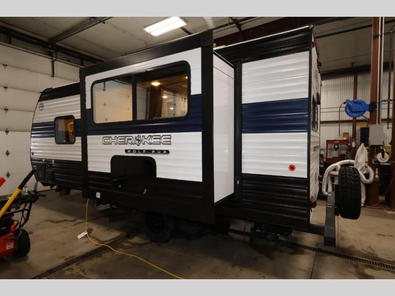 Each one of these Forest River Cherokee Wolf Pup travel trailers and toy hauler are lightweight and easy to tow! They are fully self-contained with ample tank capacities, an abundance of storage space, and filled with at home amenities. The full bath and kitchen amenities will make life at the campground easier than ever, and the outdoor patio awning will provide an inviting outdoor space!