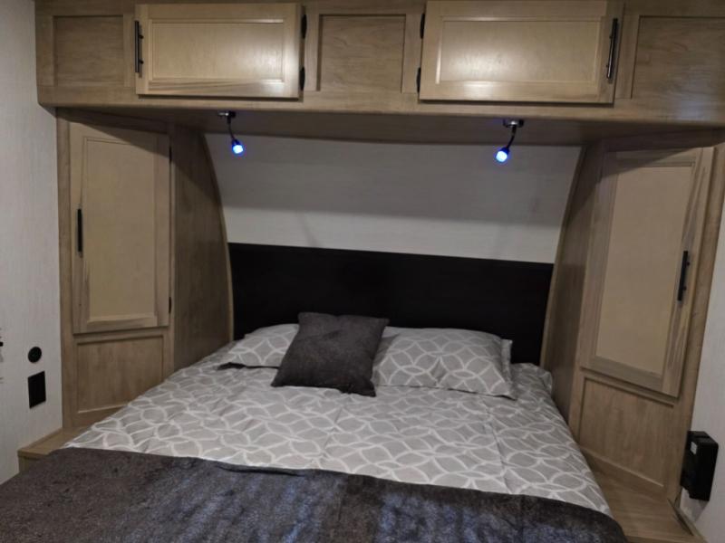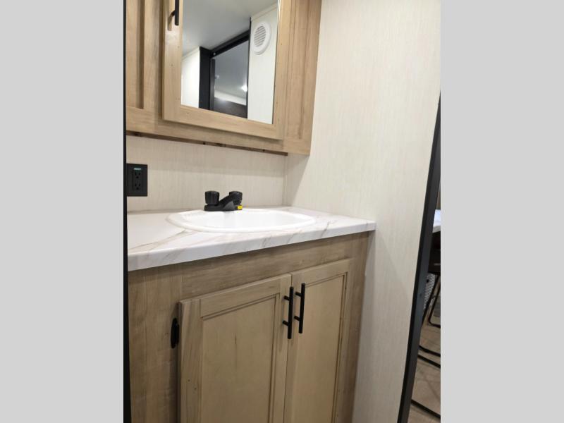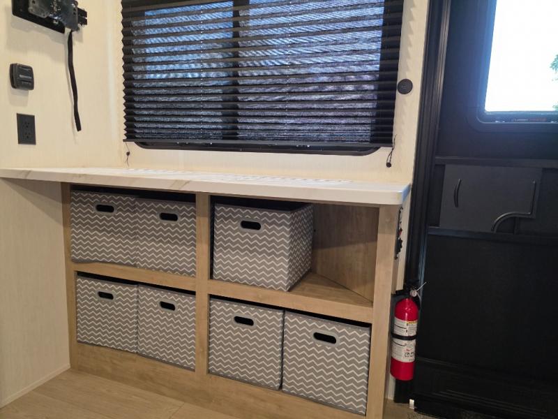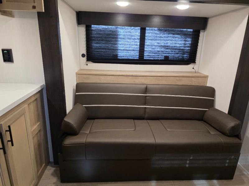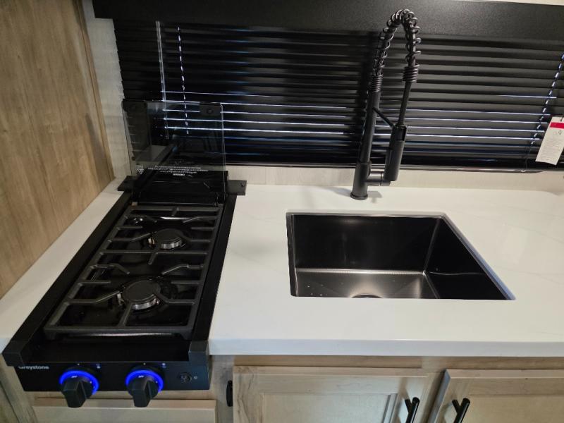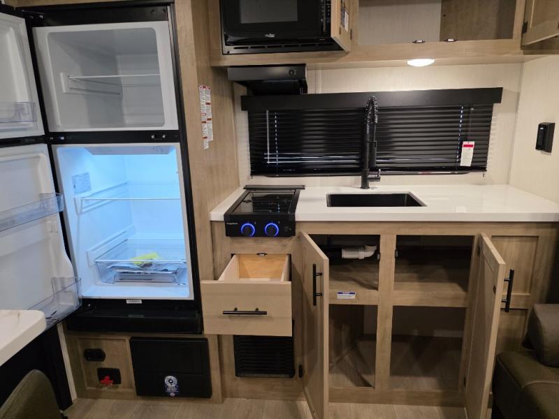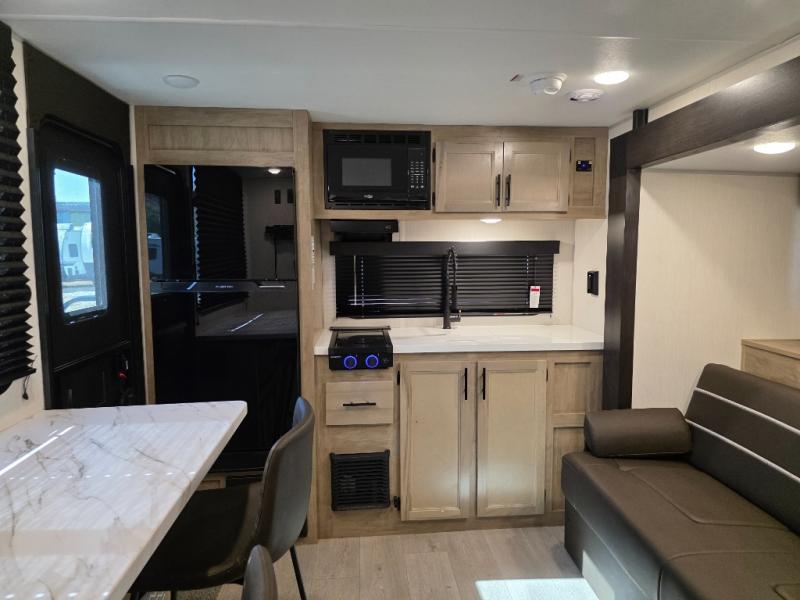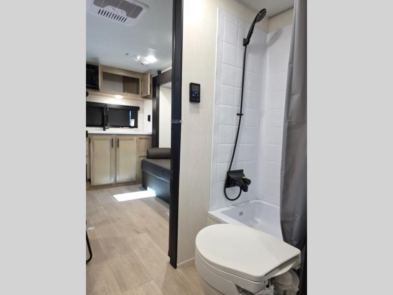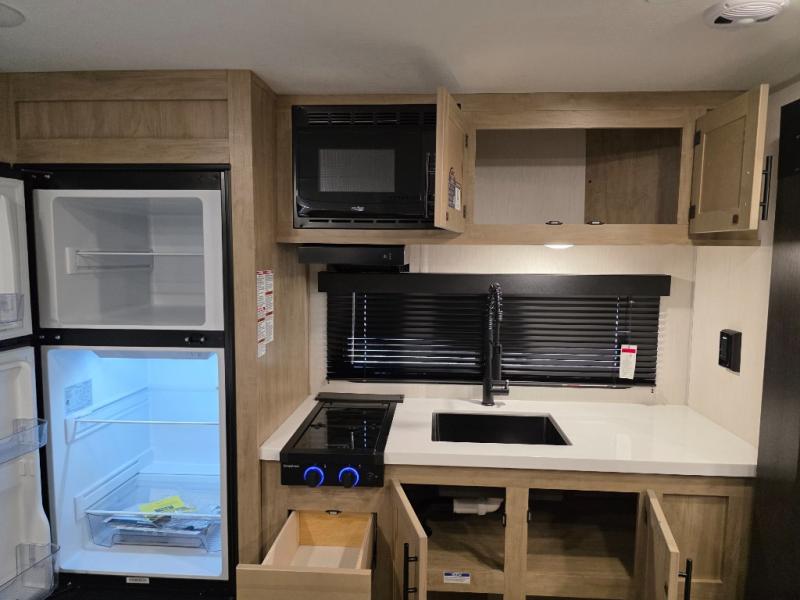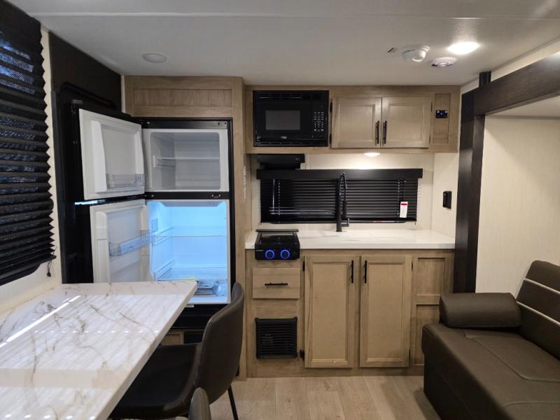 Convenient camping is found with this lightweight travel trailer! Once you arrive at your destination, put out the power awning, then make lunch on the exterior mini kitchen. Inside, you can dine at the bar top with stools, freshen up in the tub/shower, and sleep soundly on the queen bed in the master bedroom. There is also a sofa slide out to provide additional seating, sleeping, and interior space! And you're sure to find plenty of storage spaces both inside and outside, including a rear storage rack!
