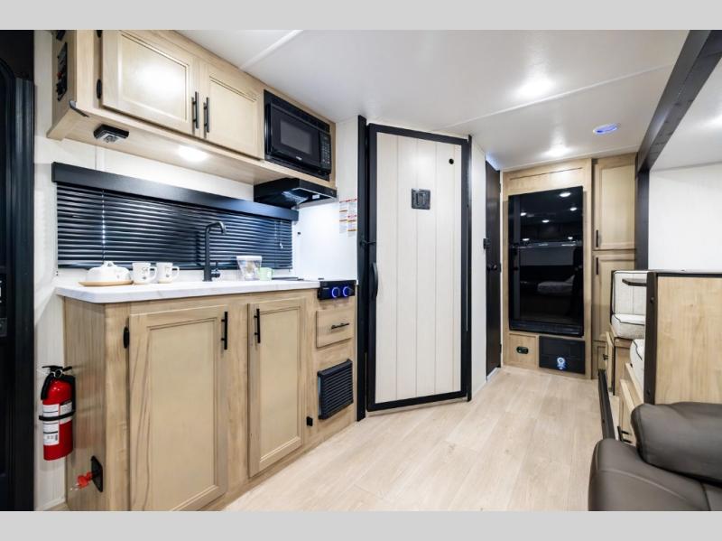 Camping trips in this spacious travel trailer are sure to bring memories! Once you arrive at the campground, you can unload the outside storage, put out the 12' awning, and enjoy the outdoor mini kitchen. Once inside, you can dine at the booth dinette, relax on the sofa, and freshen up in the full bath with a tub/shower. The front queen bed will provide a great night's rest, while your guests sleep on the living area furniture. This travel trailer also includes ample interior storage, including a spacious kitchen pantry, an overhead cabinet above the bed, plus additional storage beside the refrigerator!