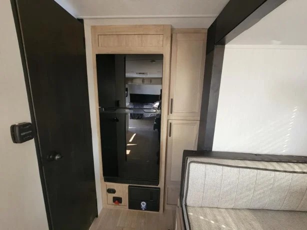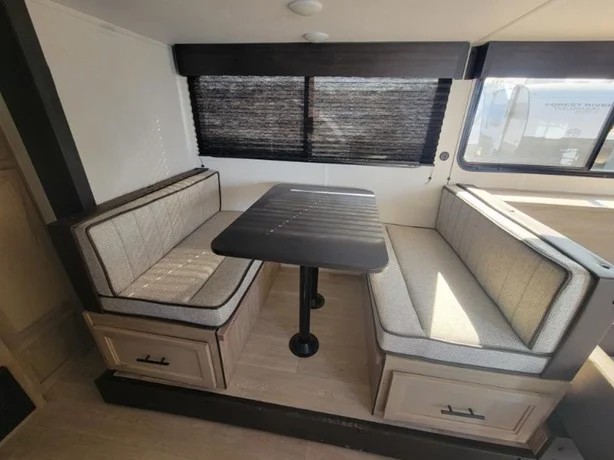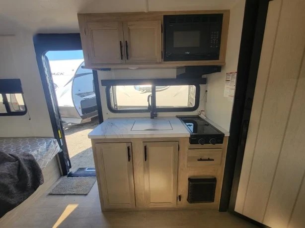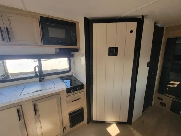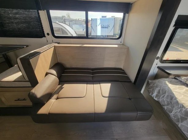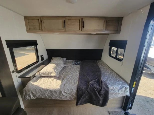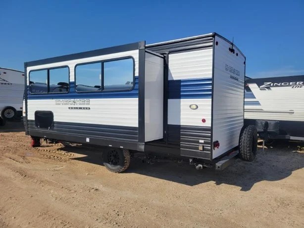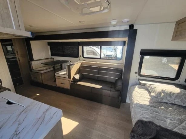 Camping trips in this spacious travel trailer are sure to bring memories! Once you arrive at the campground, you can unload the outside storage, put out the 12' awning, and enjoy the outdoor mini kitchen. Once inside, you can dine at the booth dinette, relax on the sofa, and freshen up in the full bath with a tub/shower. The front queen bed will provide a great night's rest, while your guests sleep on the living area furniture. This travel trailer also includes ample interior storage, including a spacious kitchen pantry, an overhead cabinet above the bed, plus additional storage beside the refrigerator!