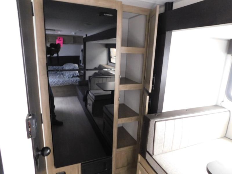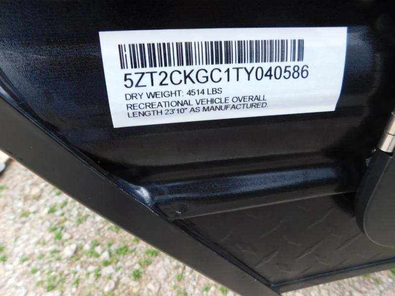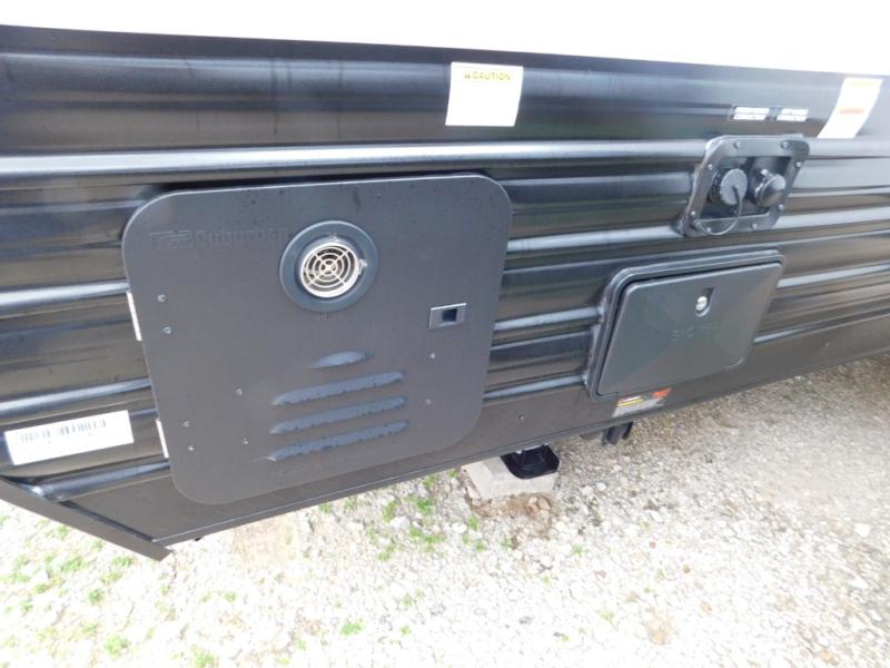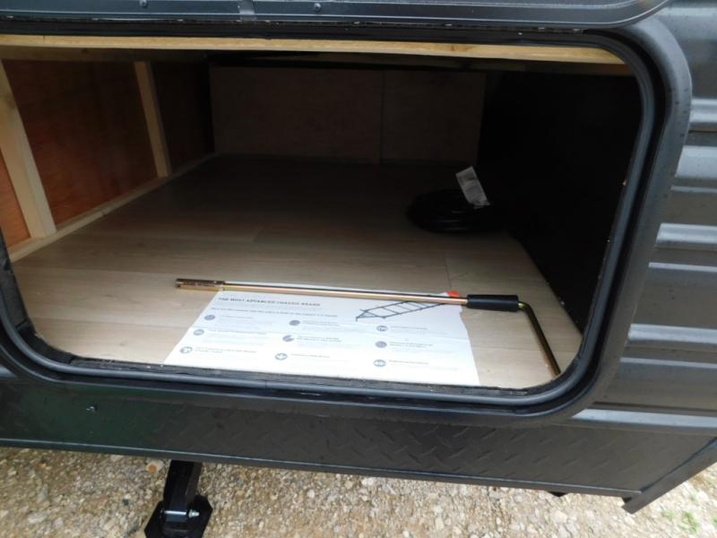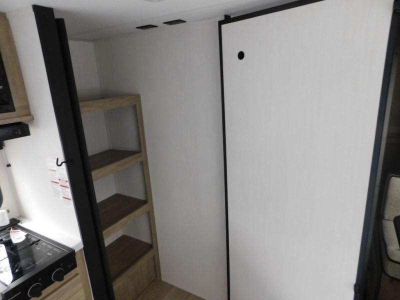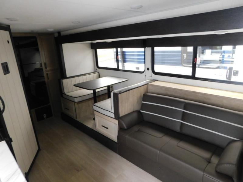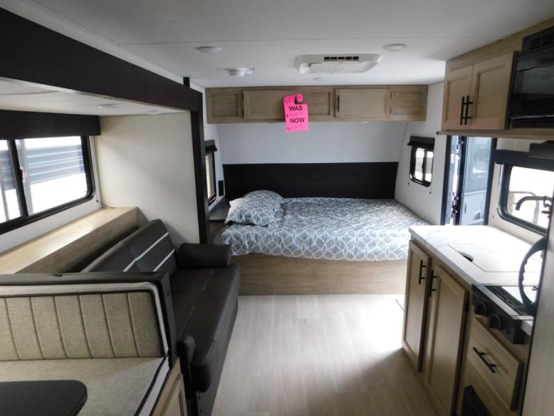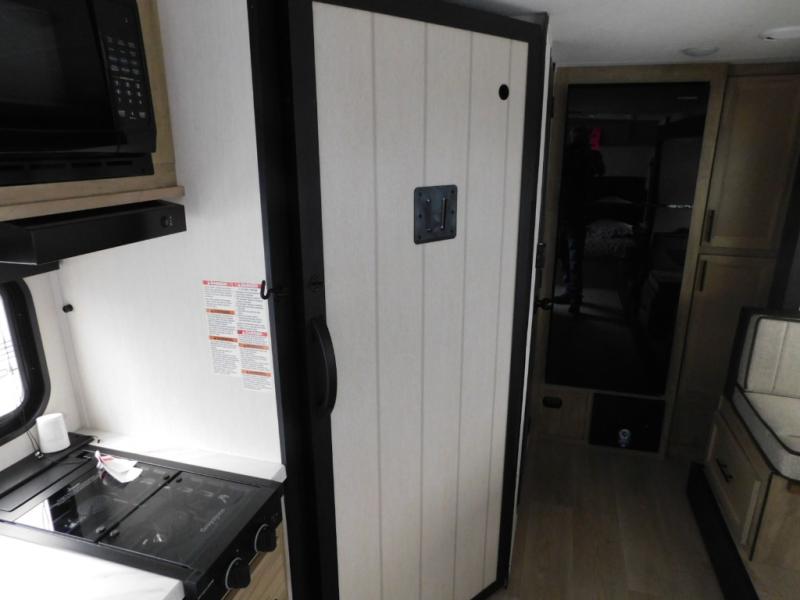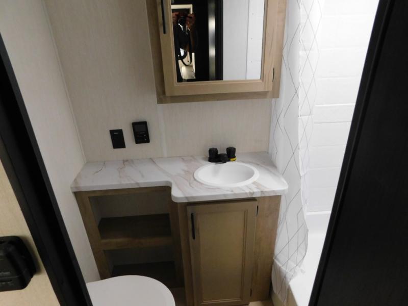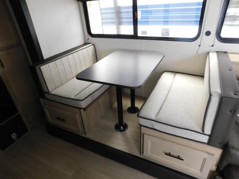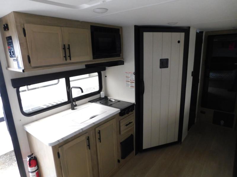 Camping trips in this spacious travel trailer are sure to bring memories! Once you arrive at the campground, you can unload the outside storage, put out the 12' awning, and enjoy the outdoor mini kitchen. Once inside, you can dine at the booth dinette, relax on the sofa, and freshen up in the full bath with a tub/shower. The front queen bed will provide a great night's rest, while your guests sleep on the living area furniture. This travel trailer also includes ample interior storage, including a spacious kitchen pantry, an overhead cabinet above the bed, plus additional storage beside the refrigerator!