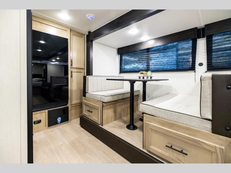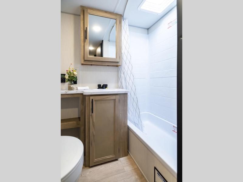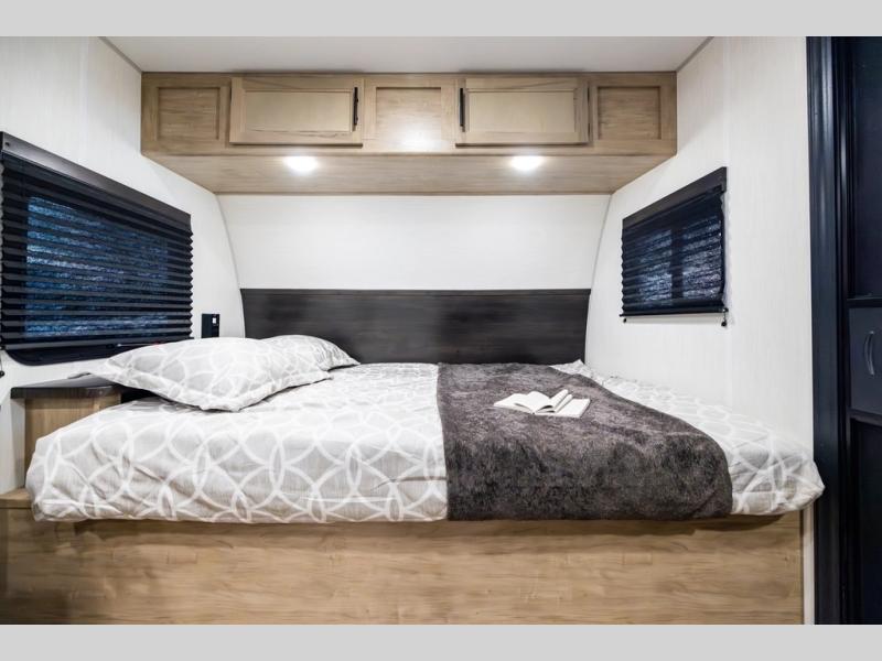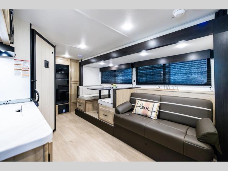 Camping trips in this spacious travel trailer are sure to bring memories! Once you arrive at the campground, you can unload the outside storage, put out the 12' awning, and enjoy the outdoor mini kitchen. Once inside, you can dine at the booth dinette, relax on the sofa, and freshen up in the full bath with a tub/shower. The front queen bed will provide a great night's rest, while your guests sleep on the living area furniture. This travel trailer also includes ample interior storage, including a spacious kitchen pantry, an overhead cabinet above the bed, plus additional storage beside the refrigerator!