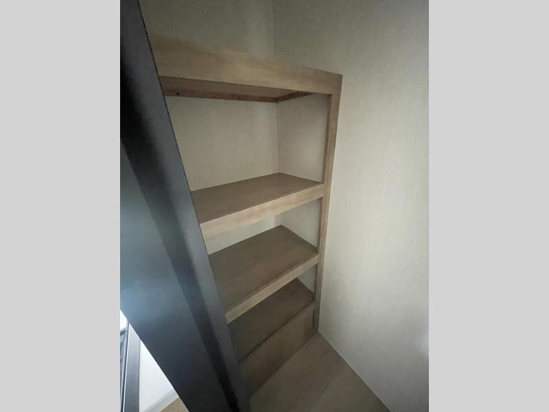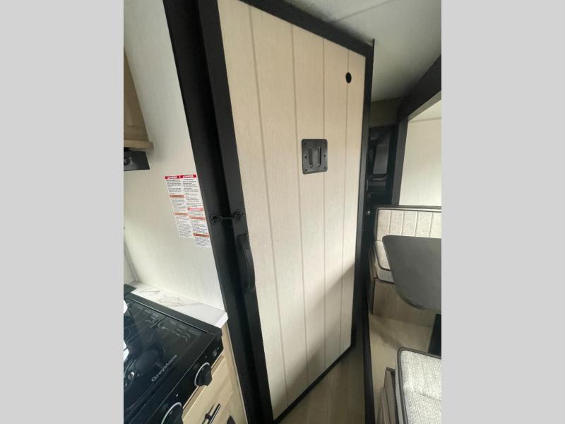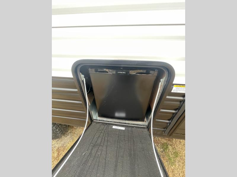 Camping trips in this spacious travel trailer are sure to bring memories! Once you arrive at the campground, you can unload the outside storage, put out the 12' awning, and enjoy the outdoor mini kitchen. Once inside, you can dine at the booth dinette, relax on the sofa, and freshen up in the full bath with a tub/shower. The front queen bed will provide a great night's rest, while your guests sleep on the living area furniture. This travel trailer also includes ample interior storage, including a spacious kitchen pantry, an overhead cabinet above the bed, plus additional storage beside the refrigerator!