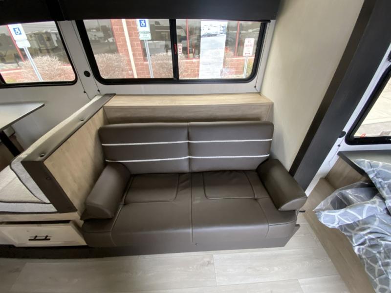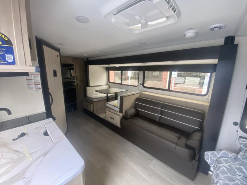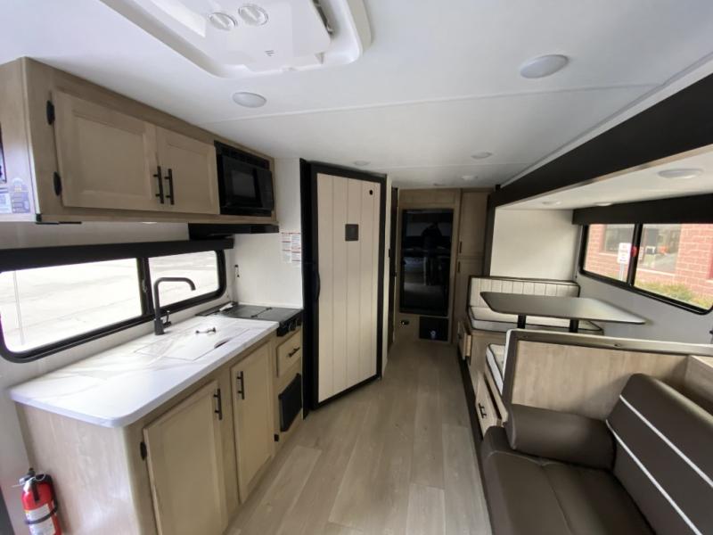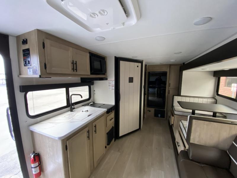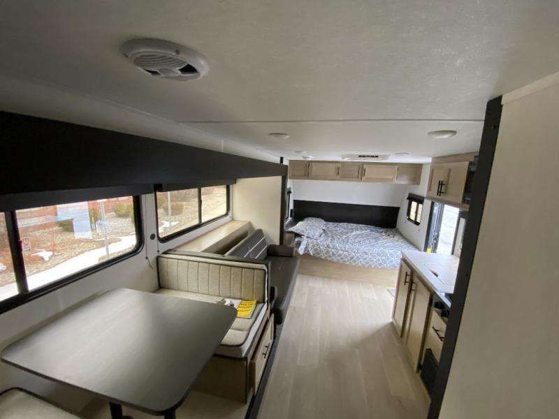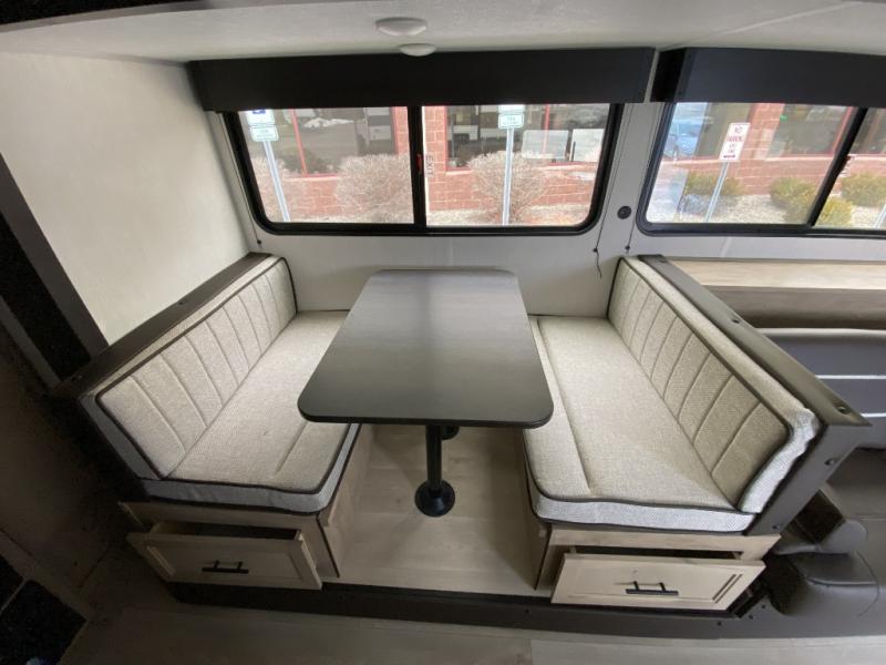 Camping trips in this spacious travel trailer are sure to bring memories! Once you arrive at the campground, you can unload the outside storage, put out the 12' awning, and enjoy the outdoor mini kitchen. Once inside, you can dine at the booth dinette, relax on the sofa, and freshen up in the full bath with a tub/shower. The front queen bed will provide a great night's rest, while your guests sleep on the living area furniture. This travel trailer also includes ample interior storage, including a spacious kitchen pantry, an overhead cabinet above the bed, plus additional storage beside the refrigerator!