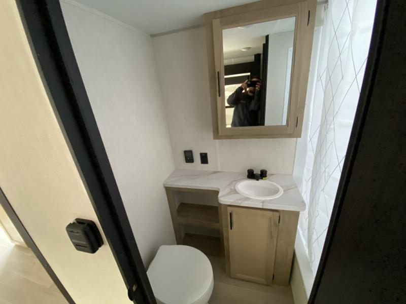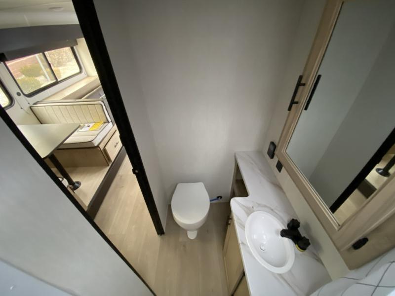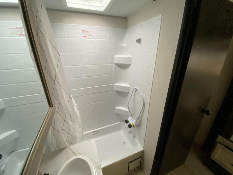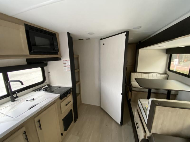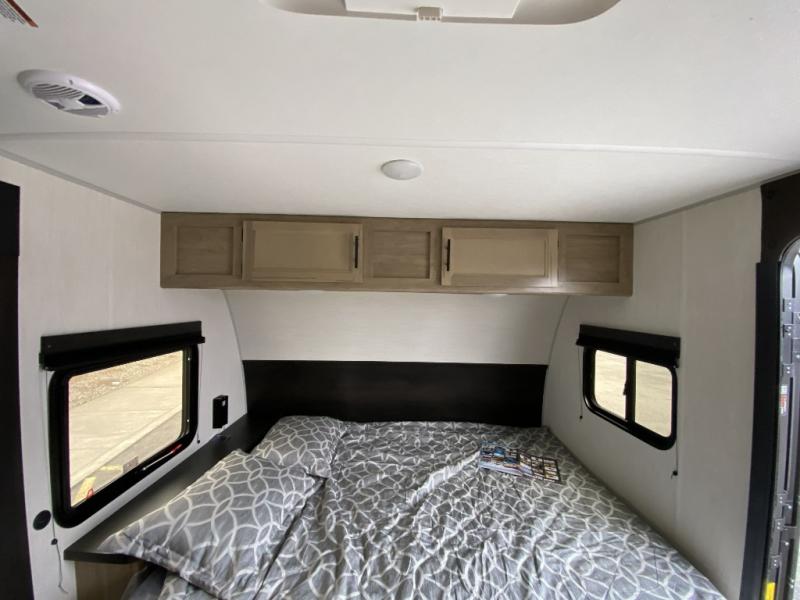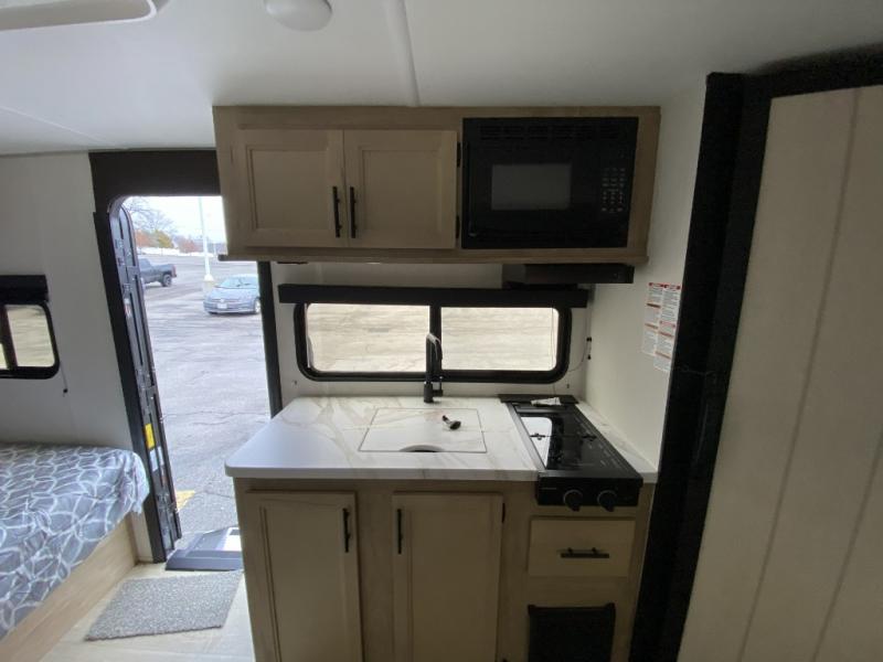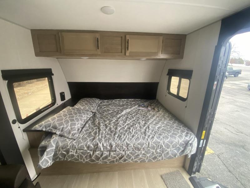 Camping trips in this spacious travel trailer are sure to bring memories! Once you arrive at the campground, you can unload the outside storage, put out the 12' awning, and enjoy the outdoor mini kitchen. Once inside, you can dine at the booth dinette, relax on the sofa, and freshen up in the full bath with a tub/shower. The front queen bed will provide a great night's rest, while your guests sleep on the living area furniture. This travel trailer also includes ample interior storage, including a spacious kitchen pantry, an overhead cabinet above the bed, plus additional storage beside the refrigerator!