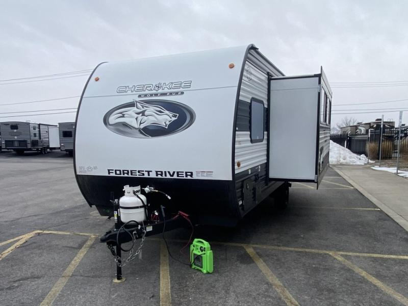 Each one of these Forest River Cherokee Wolf Pup travel trailers and toy hauler are lightweight and easy to tow! They are fully self-contained with ample tank capacities, an abundance of storage space, and filled with at home amenities. The full bath and kitchen amenities will make life at the campground easier than ever, and the outdoor patio awning will provide an inviting outdoor space!