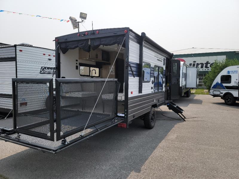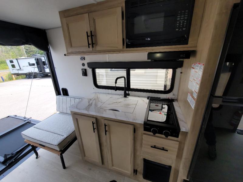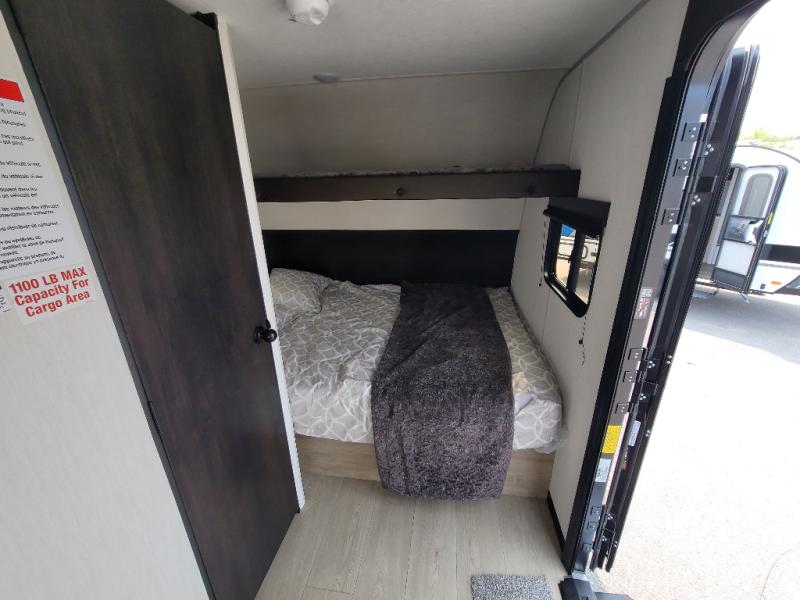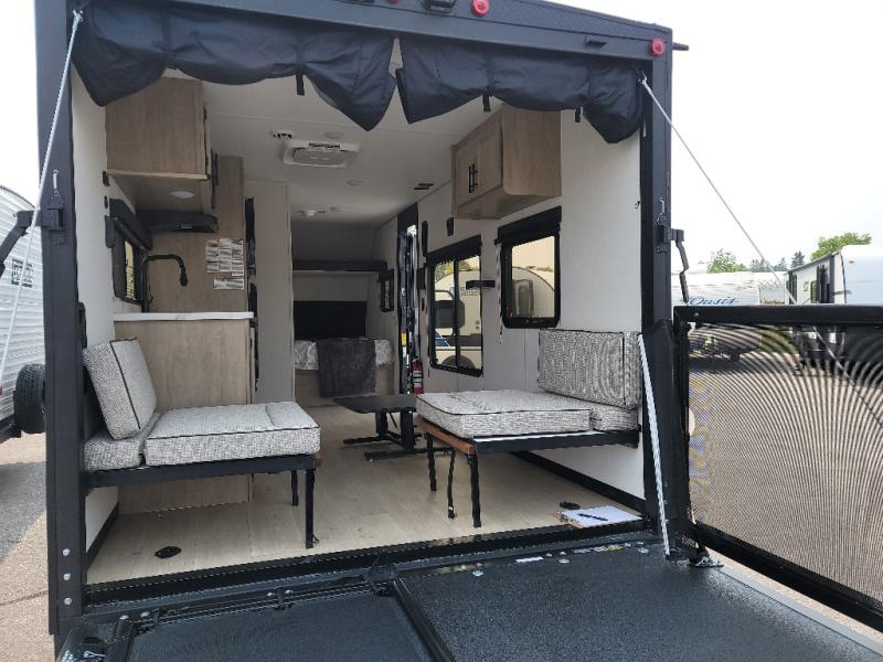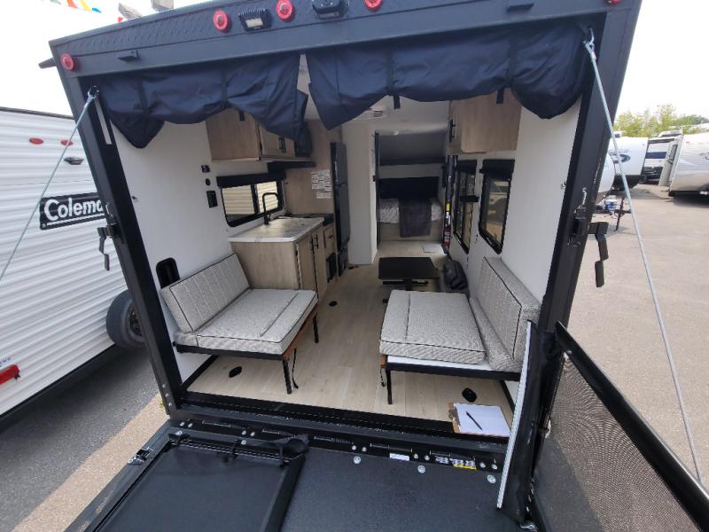 Sleeping for five and up to 13' 11" for your toys makes for an exciting adventure. The rear ramp door makes it easy to load and unload your toys, and once you are camped and the toys are removed, you can set up the dinette in back with removeable table. At night, this can double as sleeping space for two more tired campers. Up front, a queen bed with bunk above, plus storage. A tub/shower will keep everyone feeling their best, and the modern chef's kitchen will allow you to keep everyone fueled and ready for fun! There is a inside and outside TV mount so you can choose where to put a television if you add one. There is also outside storage up front and a 12' awning for added living space outside to enjoy.