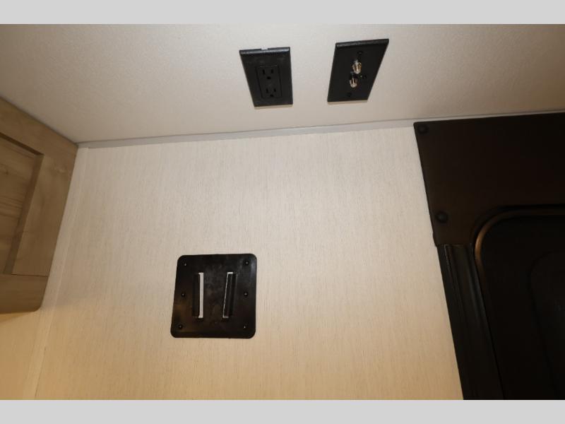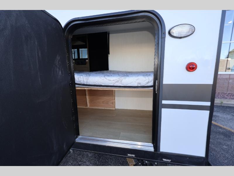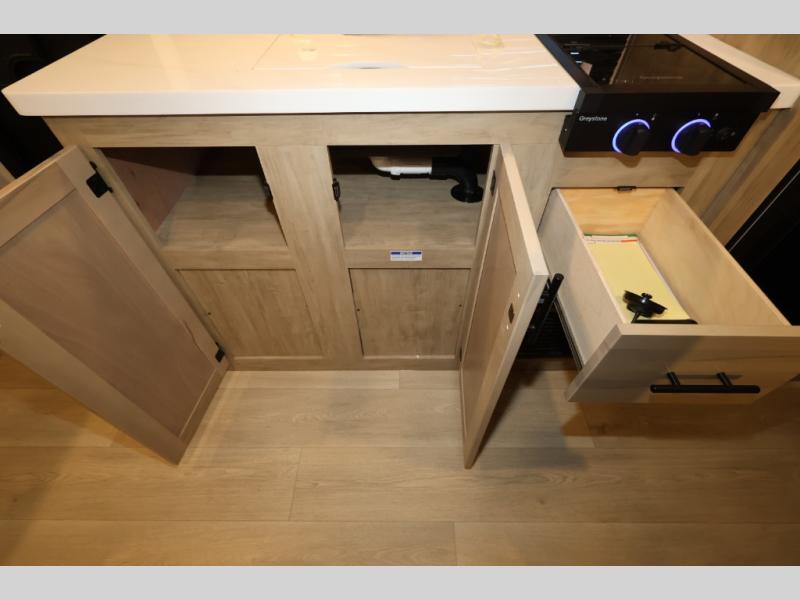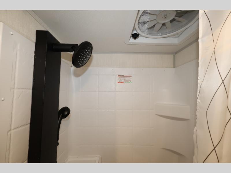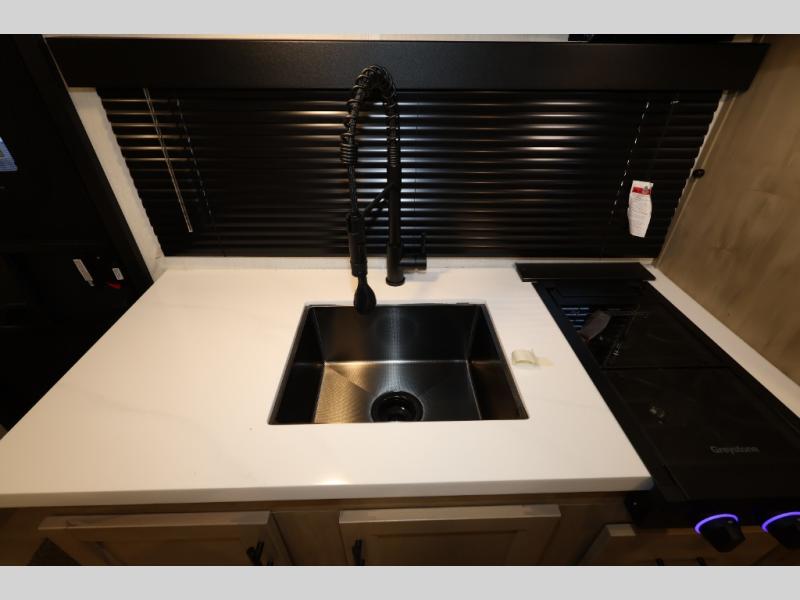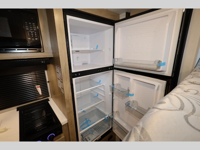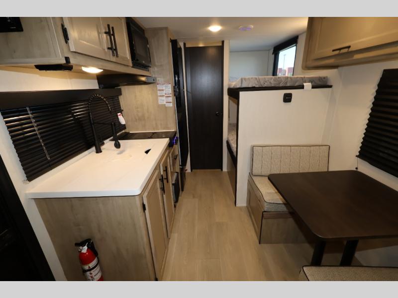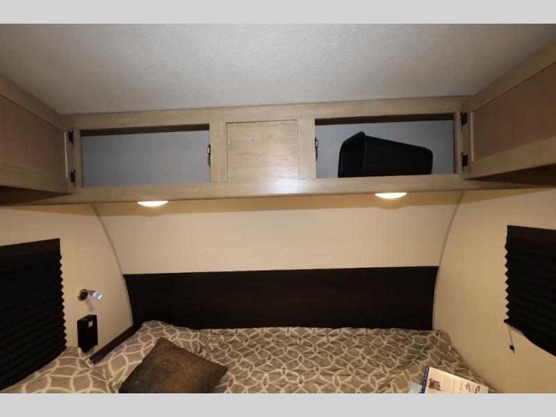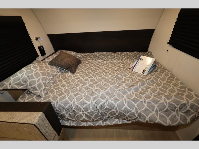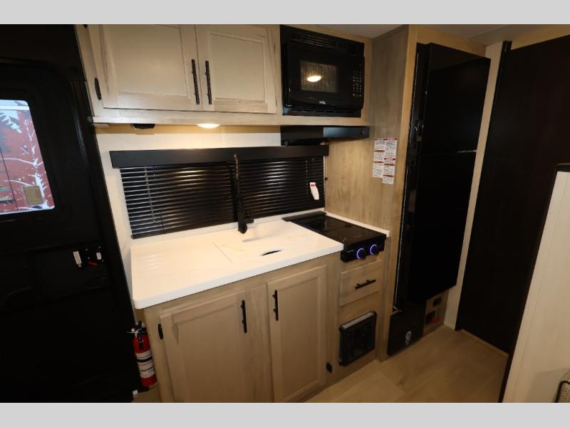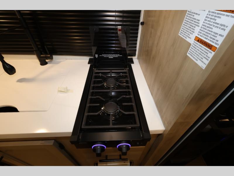 The whole family can sleep comfortably in this travel trailer! It has a set of bunk beds for the kids or guests to sleep on, and you can sleep comfortably on the front queen bed with overhead cabinets and a shelf. There is even an exterior storage plus door that accesses the storage space under the bottom bunk. The chef will enjoy preparing their best home cooked meals either indoors with the cooktop or at the outside mini kitchen while staying protected by the 12' power awning!