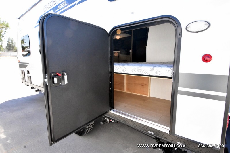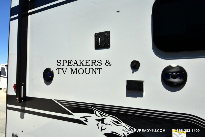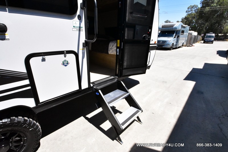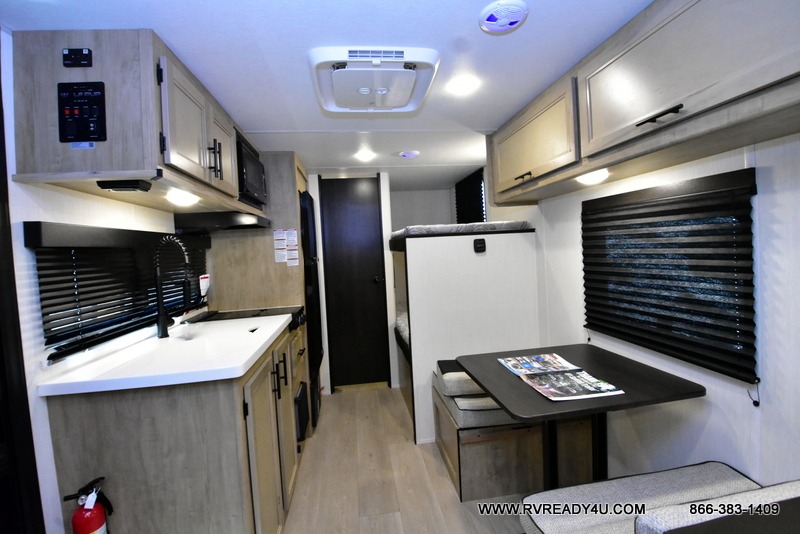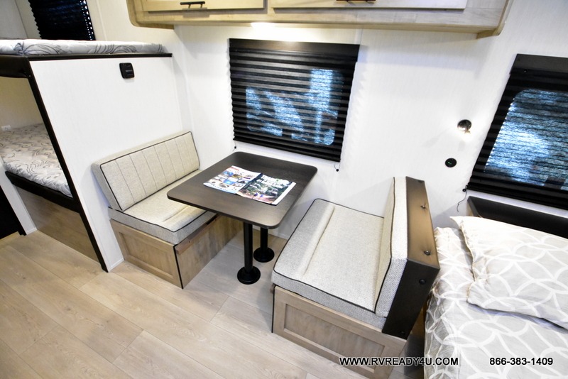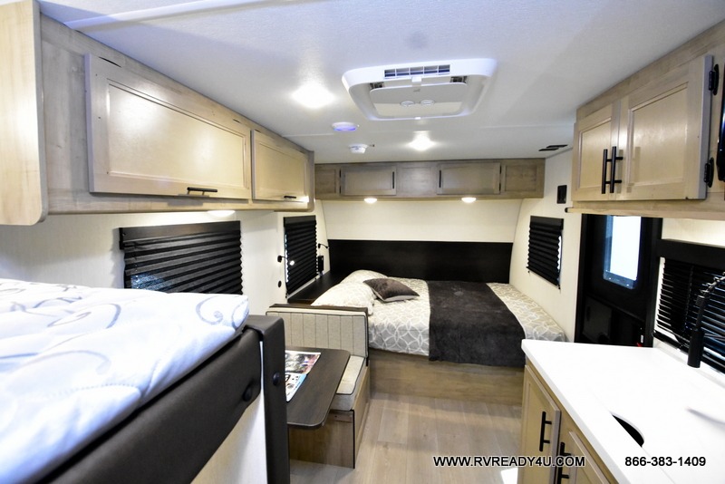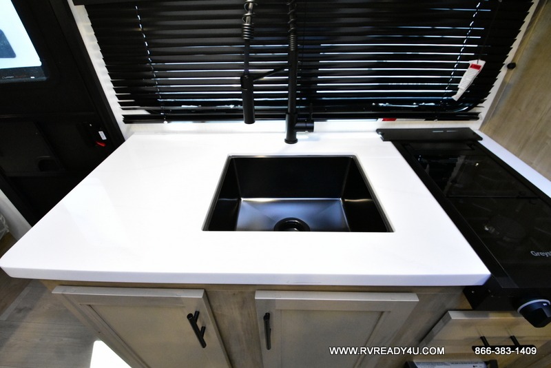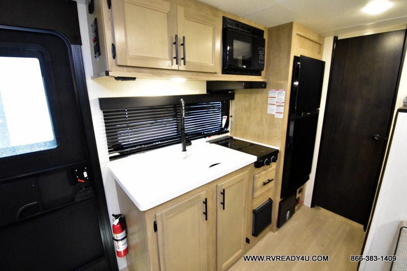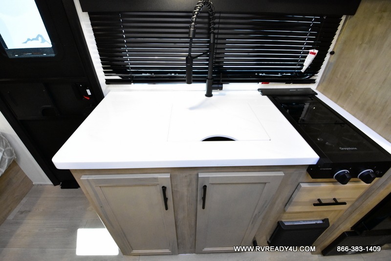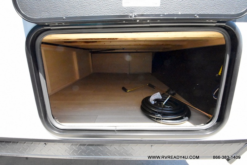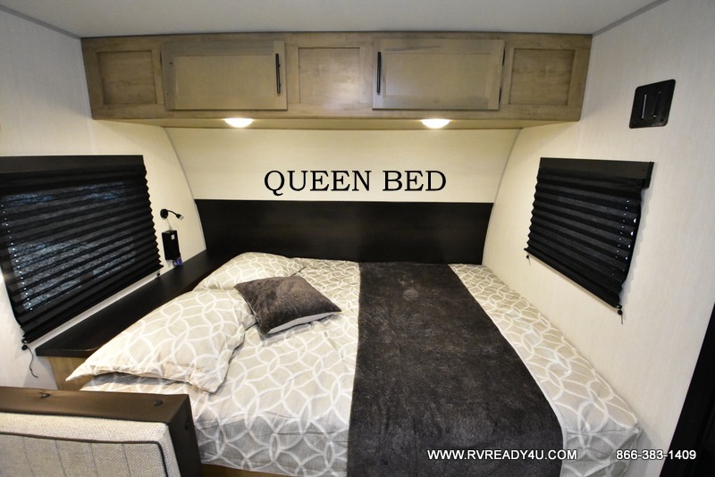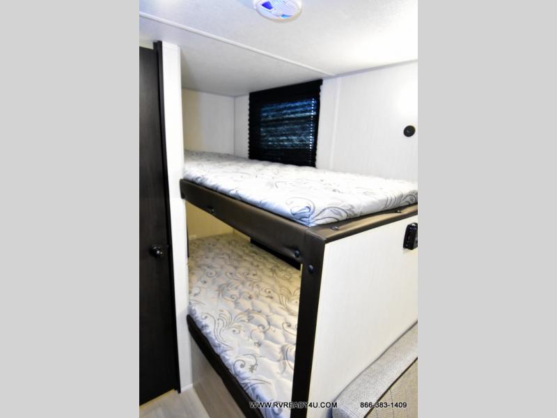 The whole family can sleep comfortably in this travel trailer! It has a set of bunk beds for the kids or guests to sleep on, and you can sleep comfortably on the front queen bed with overhead cabinets and a shelf. There is even an exterior storage plus door that accesses the storage space under the bottom bunk. The chef will enjoy preparing their best home cooked meals either indoors with the high output cooktop or at the outside mini kitchen while staying protected by the 12' power awning!