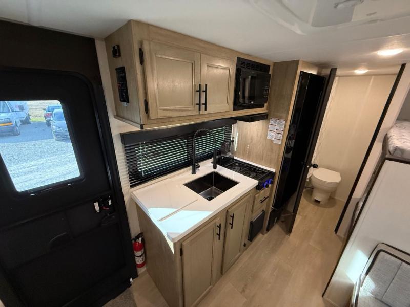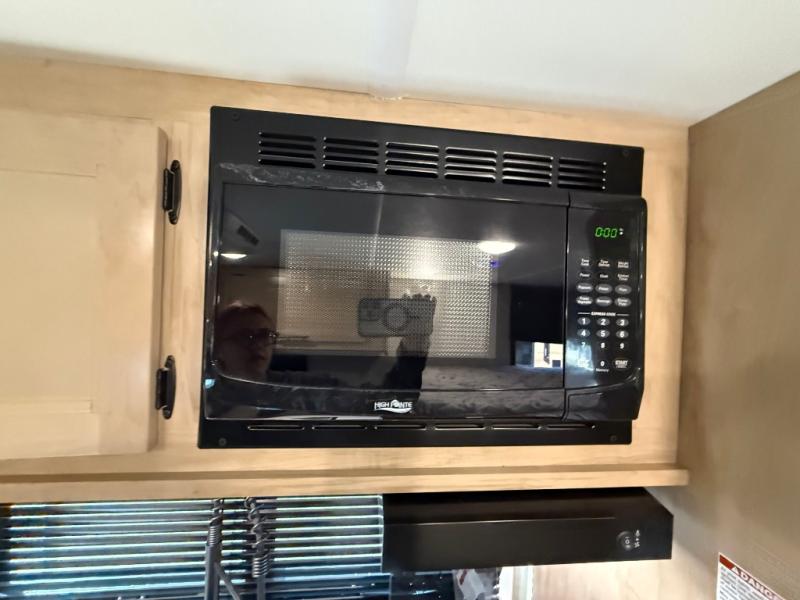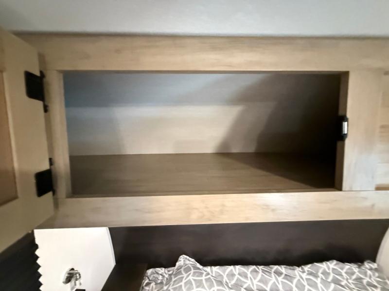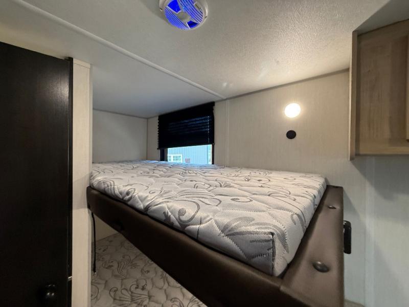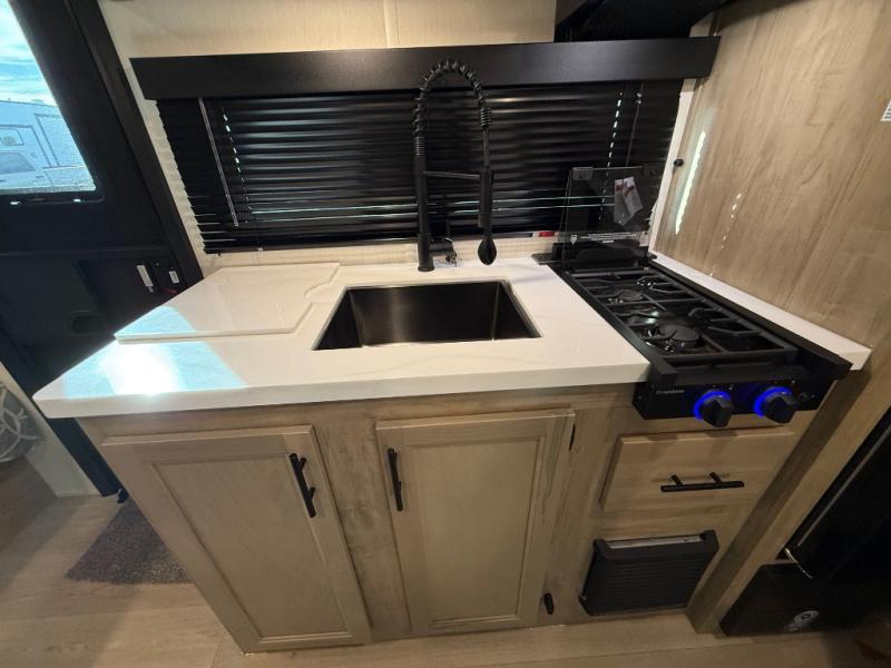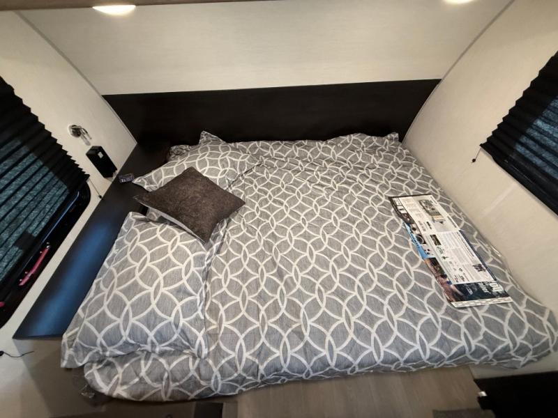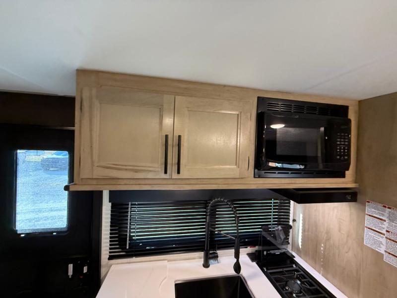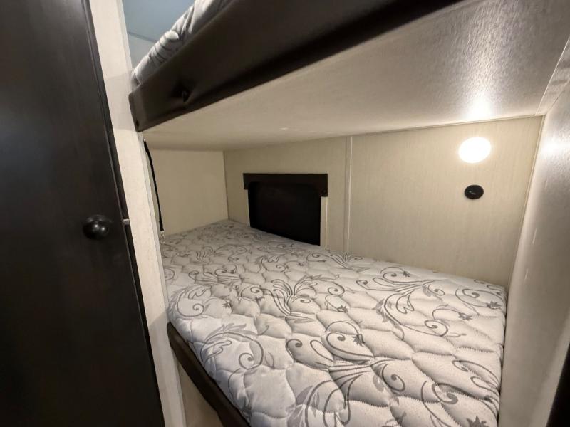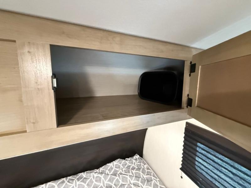 The whole family can sleep comfortably in this travel trailer! It has a set of bunk beds for the kids or guests to sleep on, and you can sleep comfortably on the front queen bed with overhead cabinets and a shelf. There is even an exterior storage plus door that accesses the storage space under the bottom bunk. The chef will enjoy preparing their best home cooked meals either indoors with the cooktop or at the outside mini kitchen while staying protected by the 12' power awning!