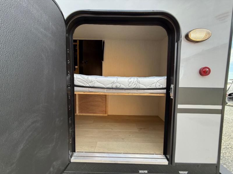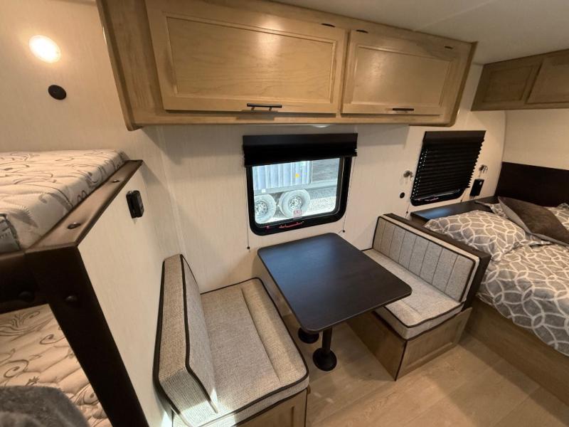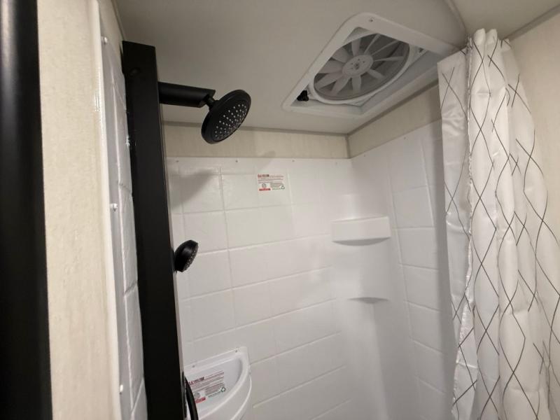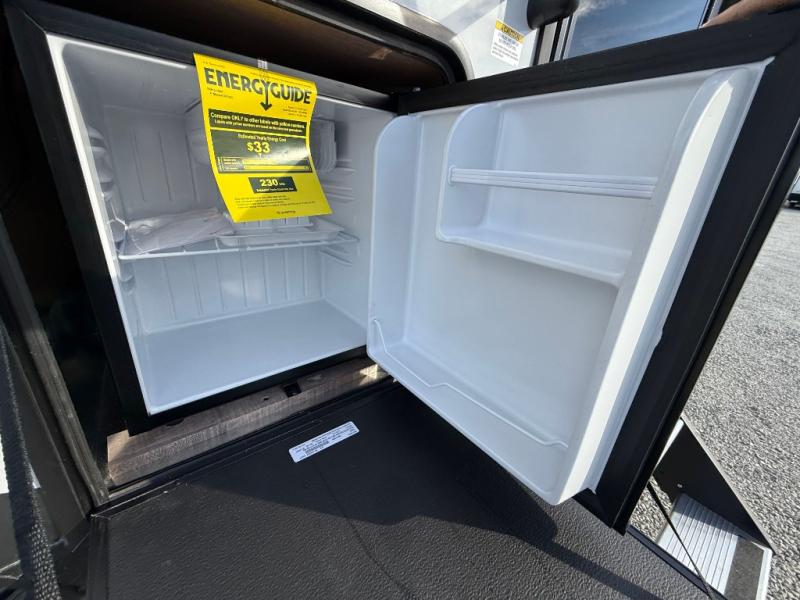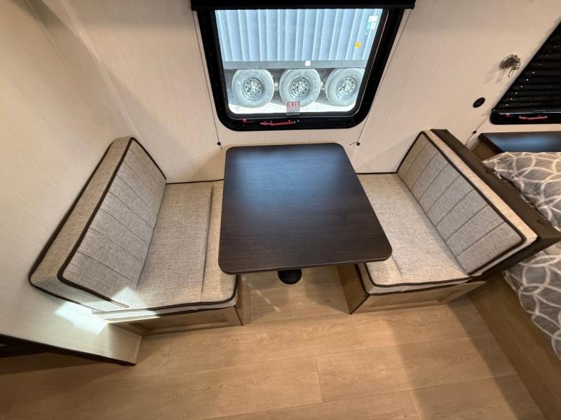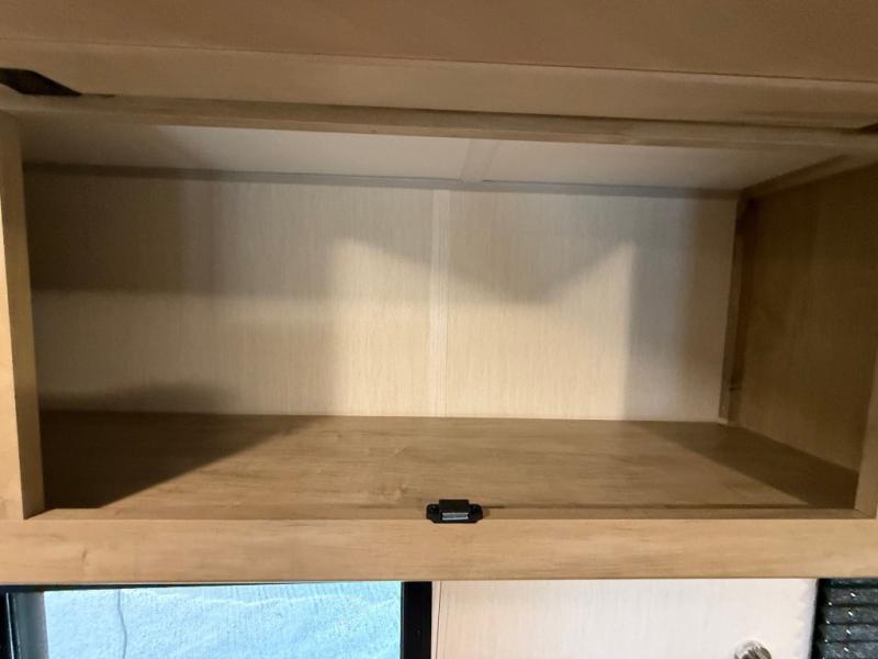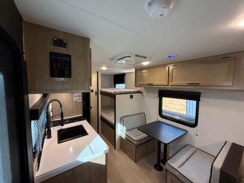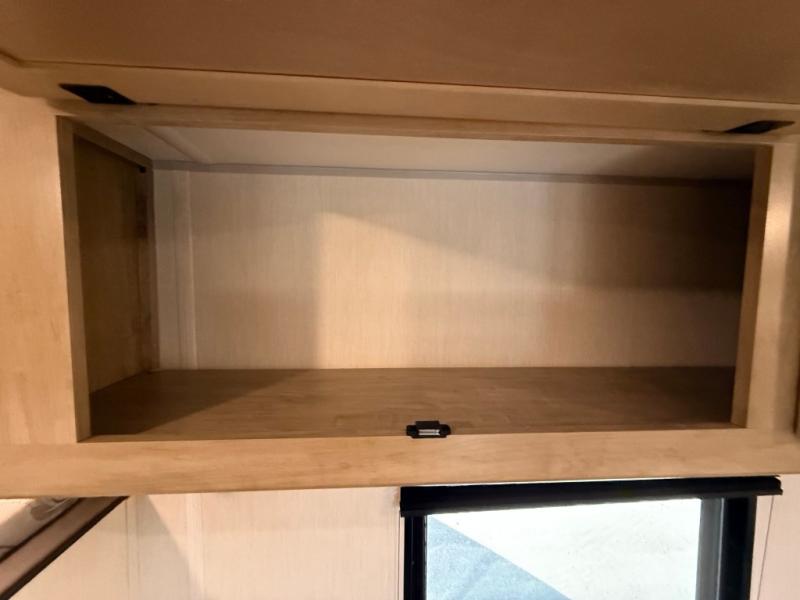 The whole family can sleep comfortably in this travel trailer! It has a set of bunk beds for the kids or guests to sleep on, and you can sleep comfortably on the front queen bed with overhead cabinets and a shelf. There is even an exterior storage plus door that accesses the storage space under the bottom bunk. The chef will enjoy preparing their best home cooked meals either indoors with the cooktop or at the outside mini kitchen while staying protected by the 12' power awning!