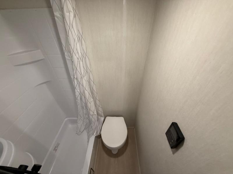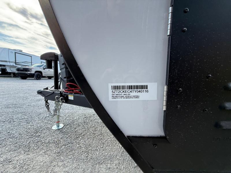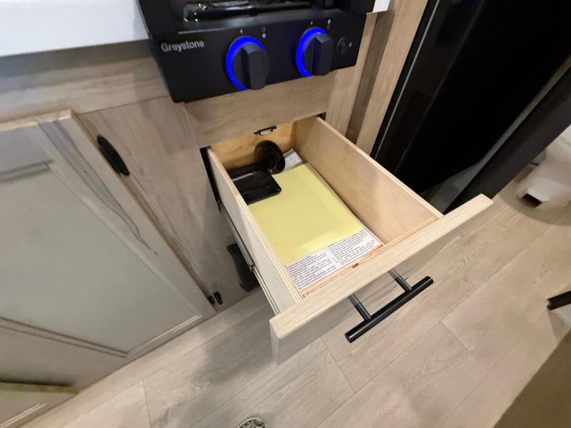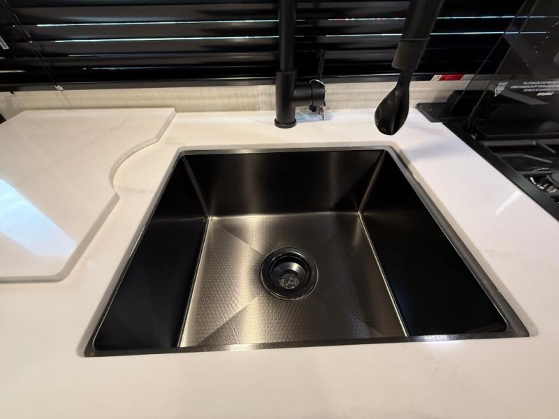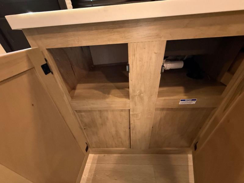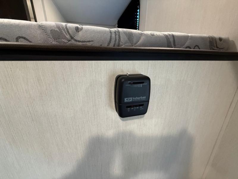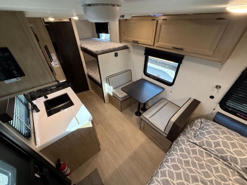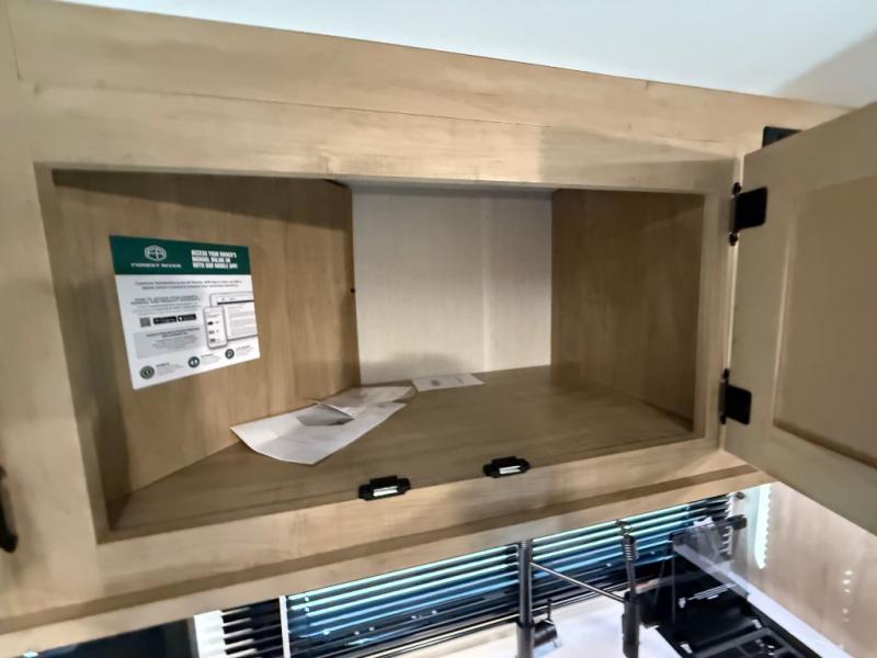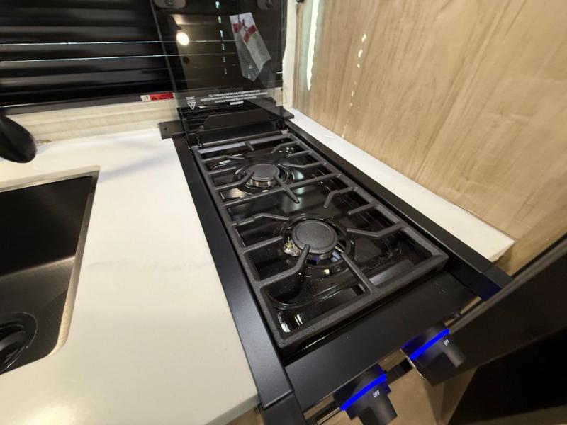 The whole family can sleep comfortably in this travel trailer! It has a set of bunk beds for the kids or guests to sleep on, and you can sleep comfortably on the front queen bed with overhead cabinets and a shelf. There is even an exterior storage plus door that accesses the storage space under the bottom bunk. The chef will enjoy preparing their best home cooked meals either indoors with the cooktop or at the outside mini kitchen while staying protected by the 12' power awning!