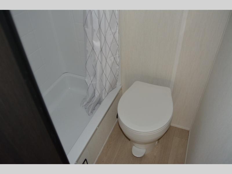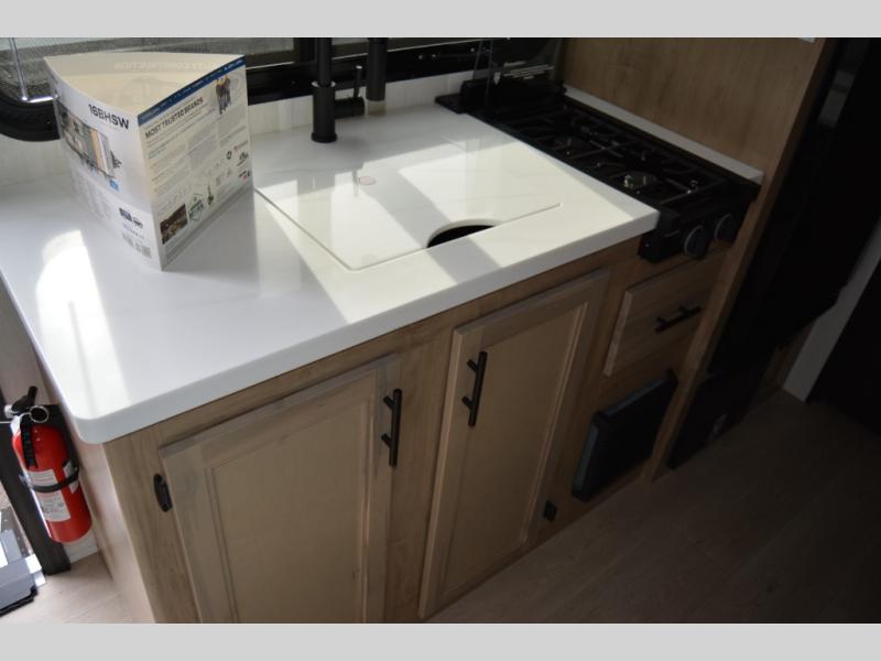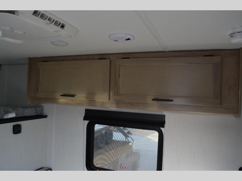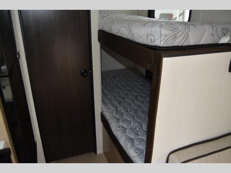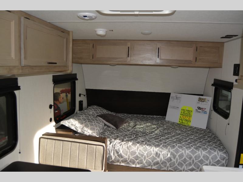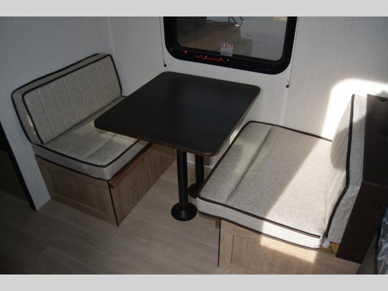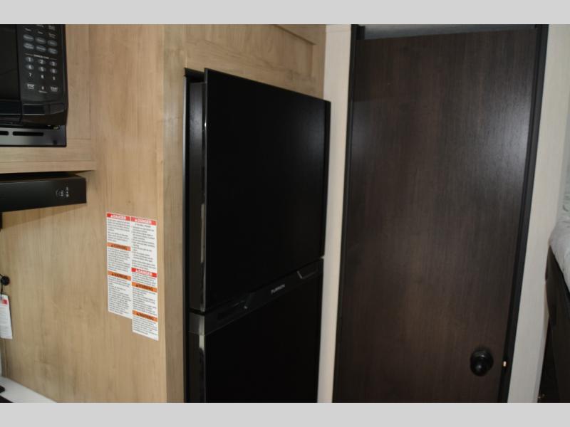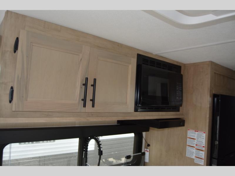 The whole family can sleep comfortably in this travel trailer! It has a set of bunk beds for the kids or guests to sleep on, and you can sleep comfortably on the front queen bed with overhead cabinets and a shelf. There is even an exterior storage plus door that accesses the storage space under the bottom bunk. The chef will enjoy preparing their best home cooked meals either indoors with the cooktop or at the outside mini kitchen while staying protected by the 12' power awning!
