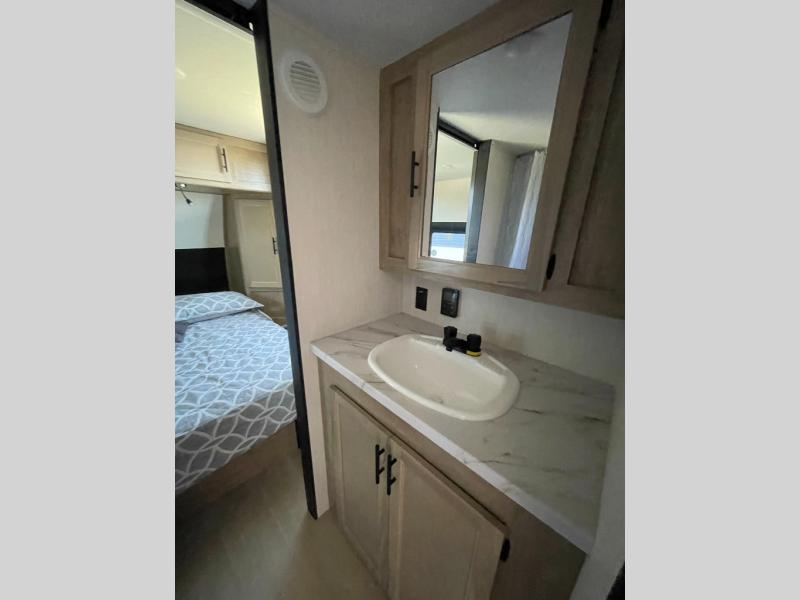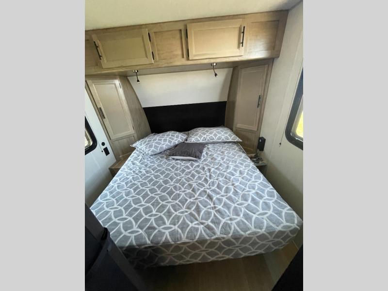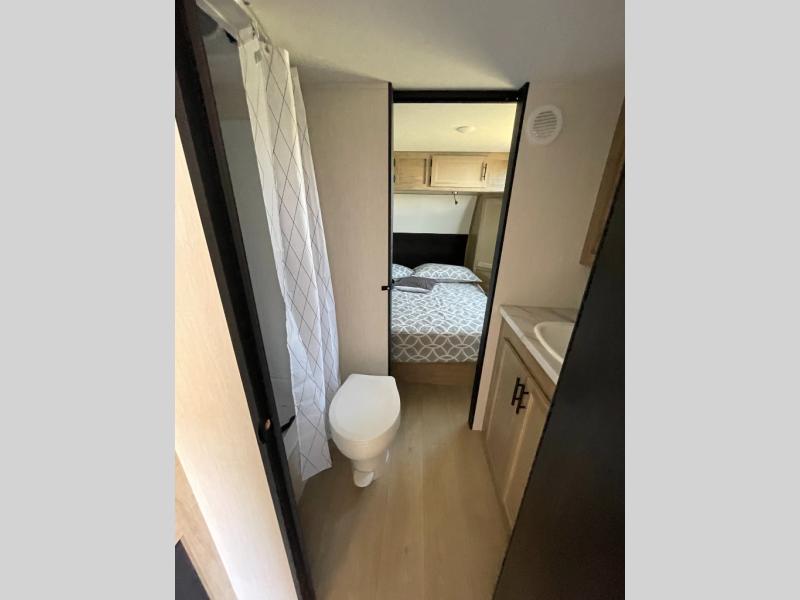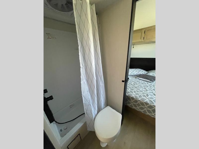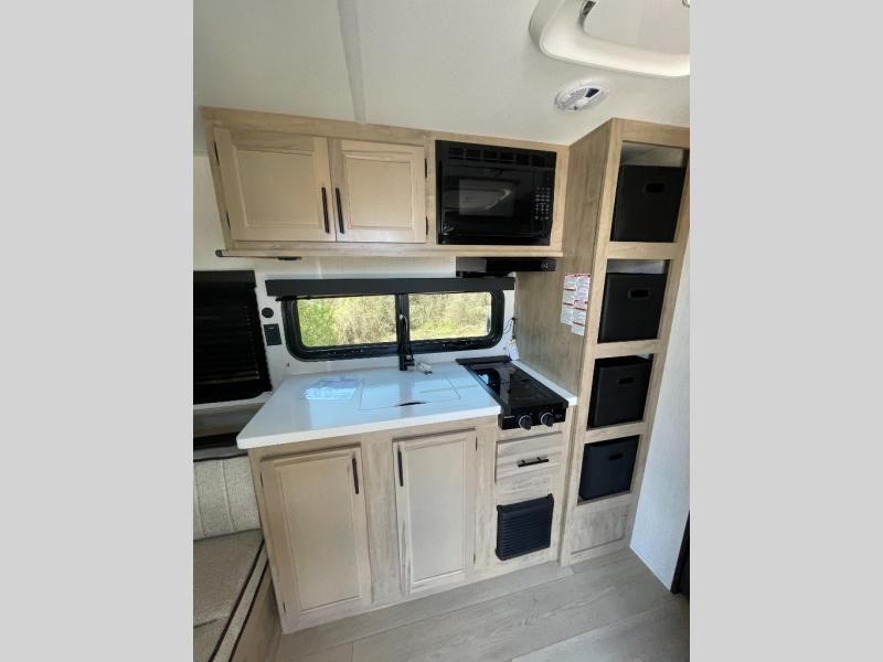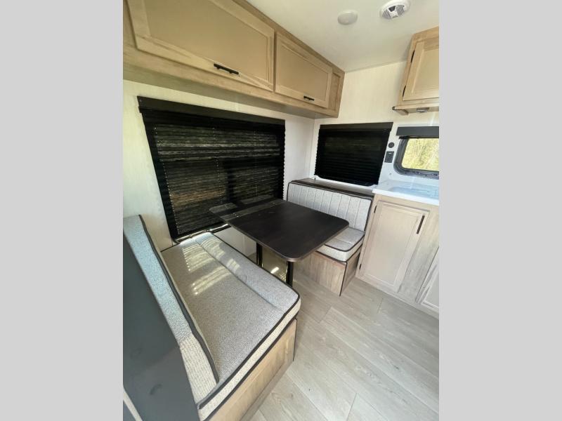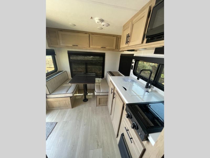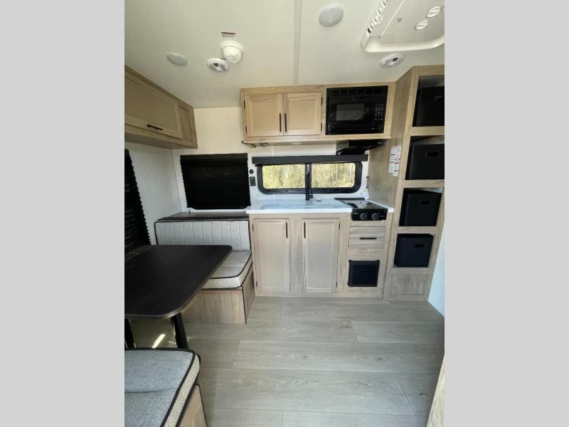 Convenient camping is found with this lightweight travel trailer! Once you arrive at your destination, put out the 15' awning, then make lunch on the exterior mini kitchen. Inside, you can dine at the booth dinette, freshen up in the tub/shower, and sleep soundly on the queen bed in the master bedroom. And you're sure to find plenty of storage spaces both inside and outside!