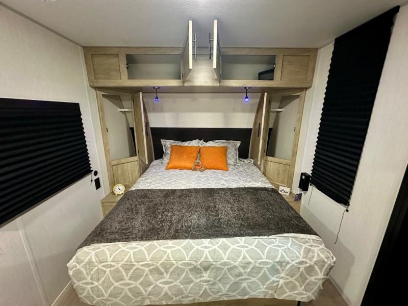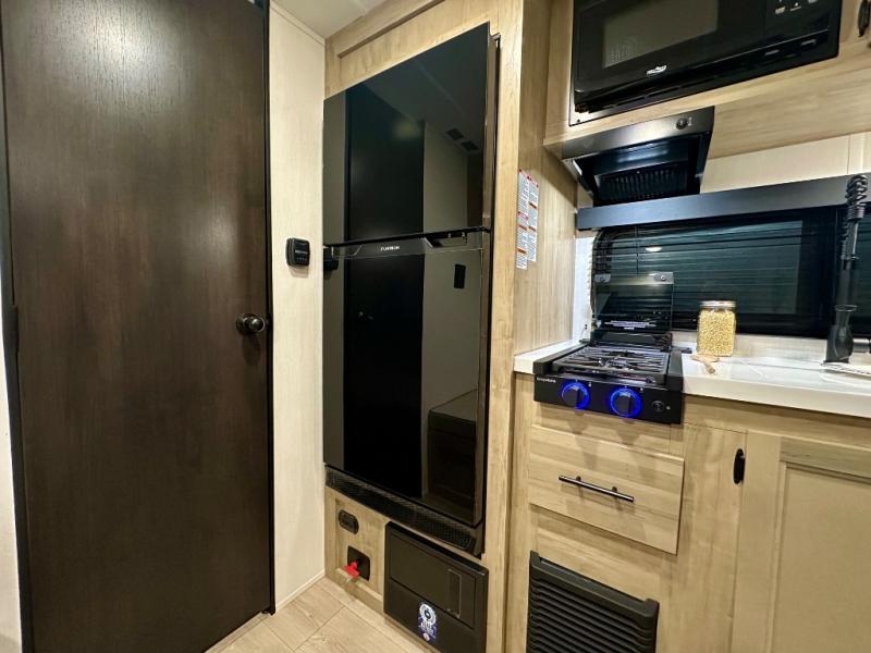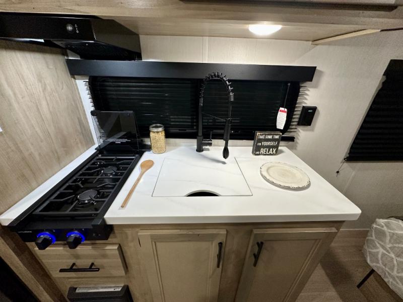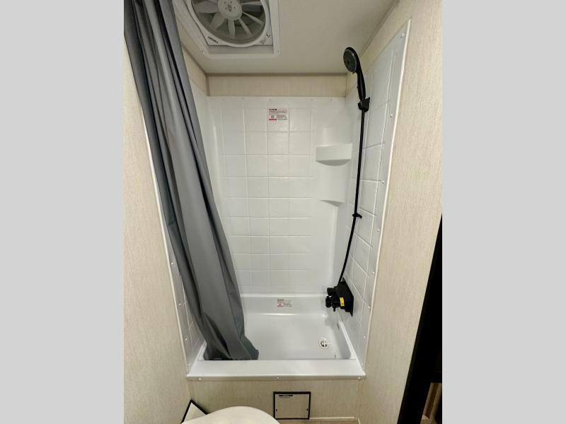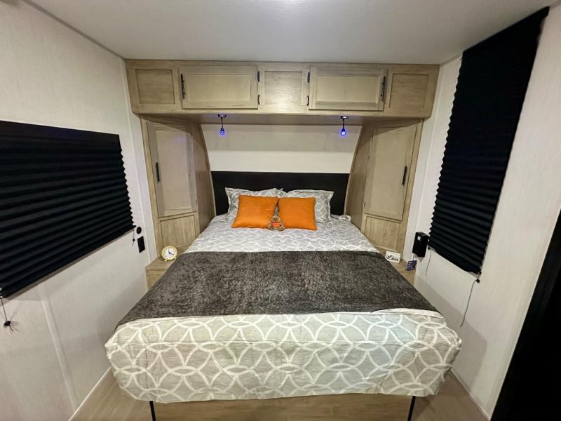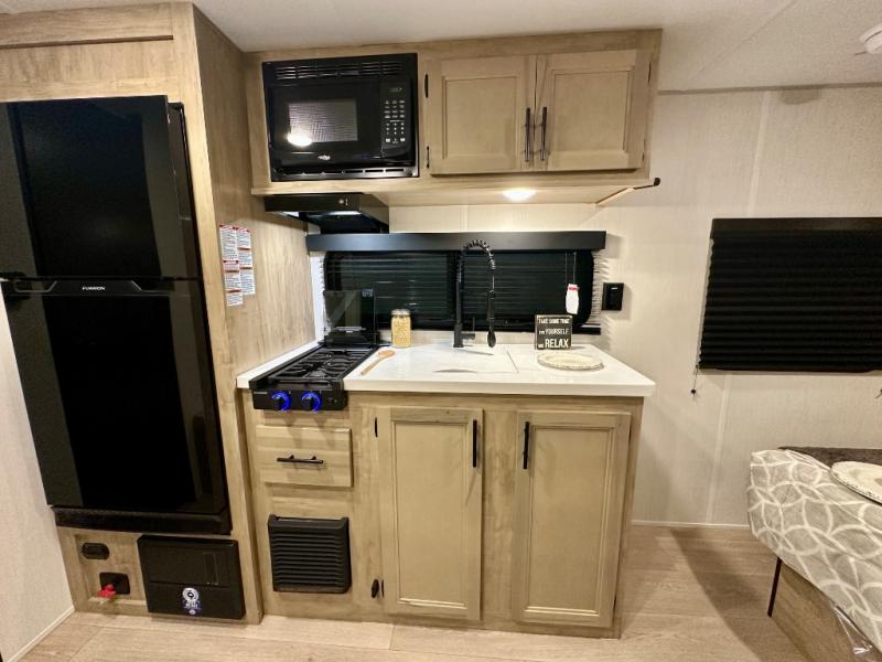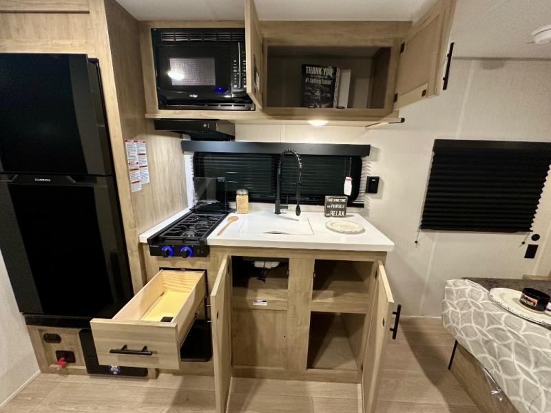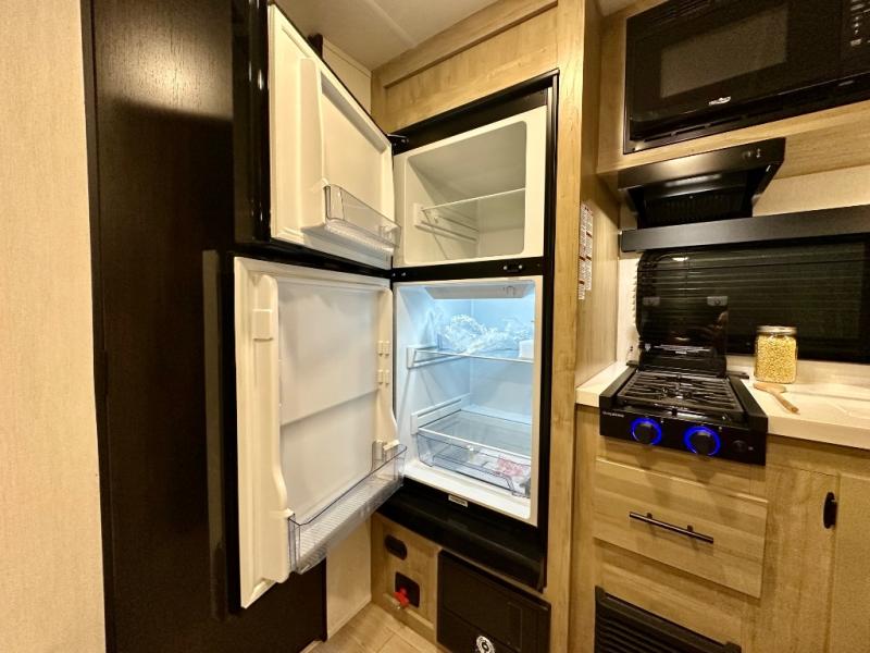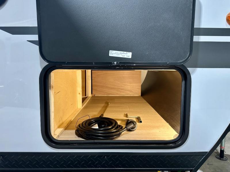 You will love camping in this travel trailer with your own queen bed up front! Freshen up each morning in the full rear bathroom with the tub/shower, toilet, and sink. Fill your bellies with the perishables stored in the 12V high efficiency refrigerator and cook them on the high output cooktop. You could even prepare a meal while breathing in some fresh air at the outside mini kitchen while staying protected by the 12' power awning. Easily store all of your outdoor gear in the outside storage area too!