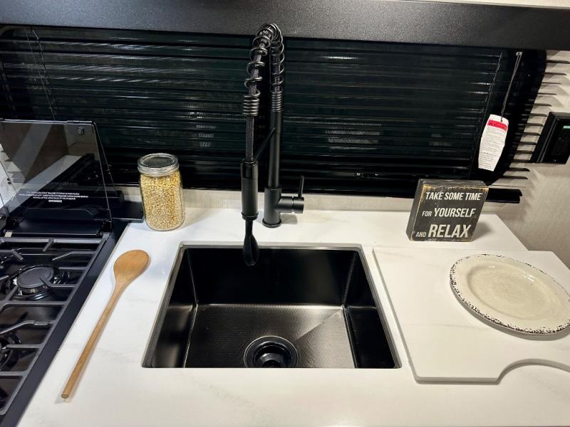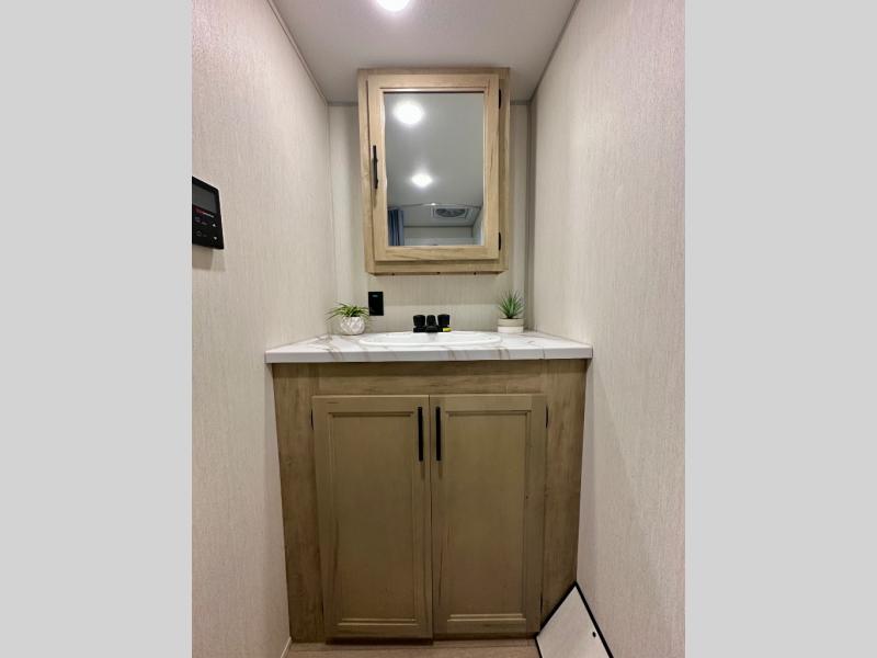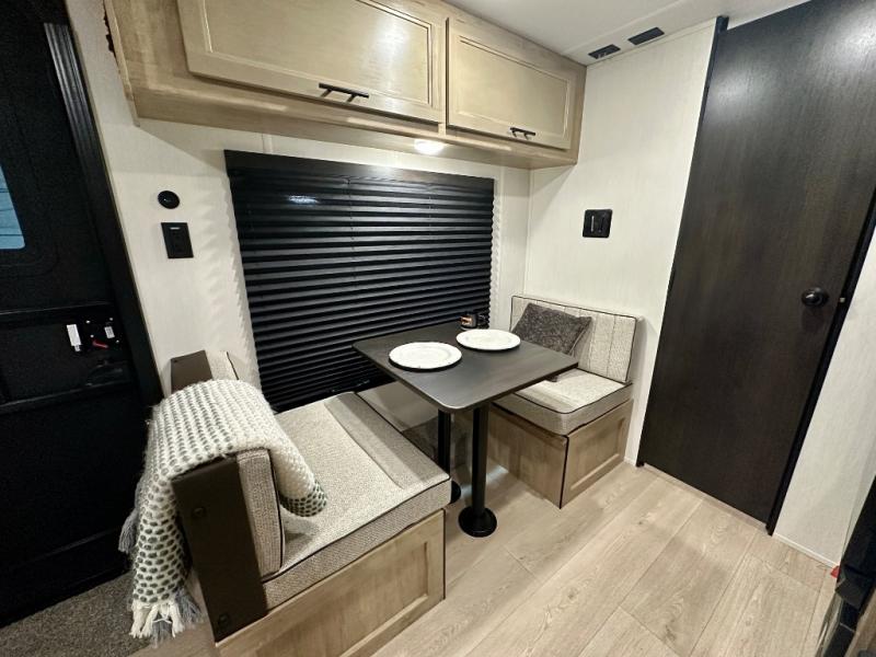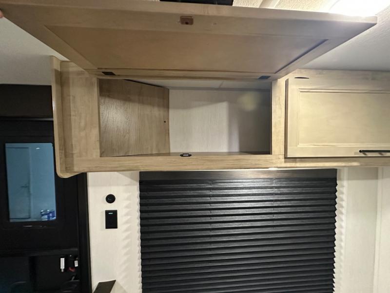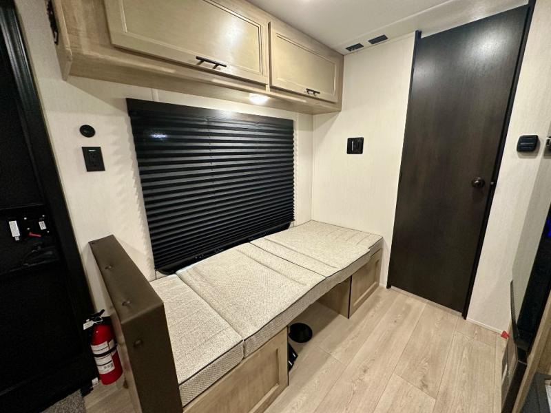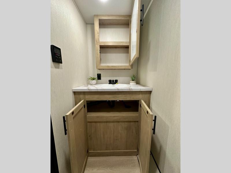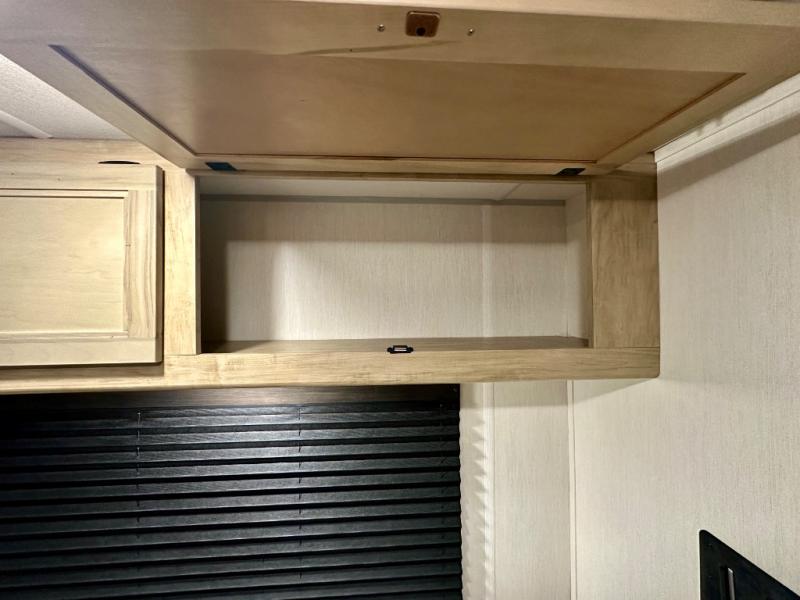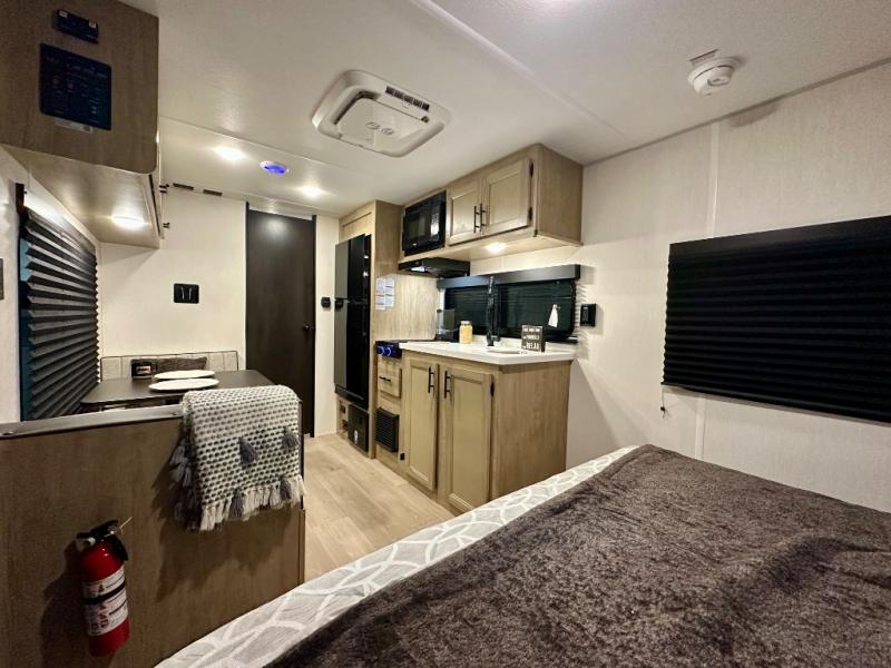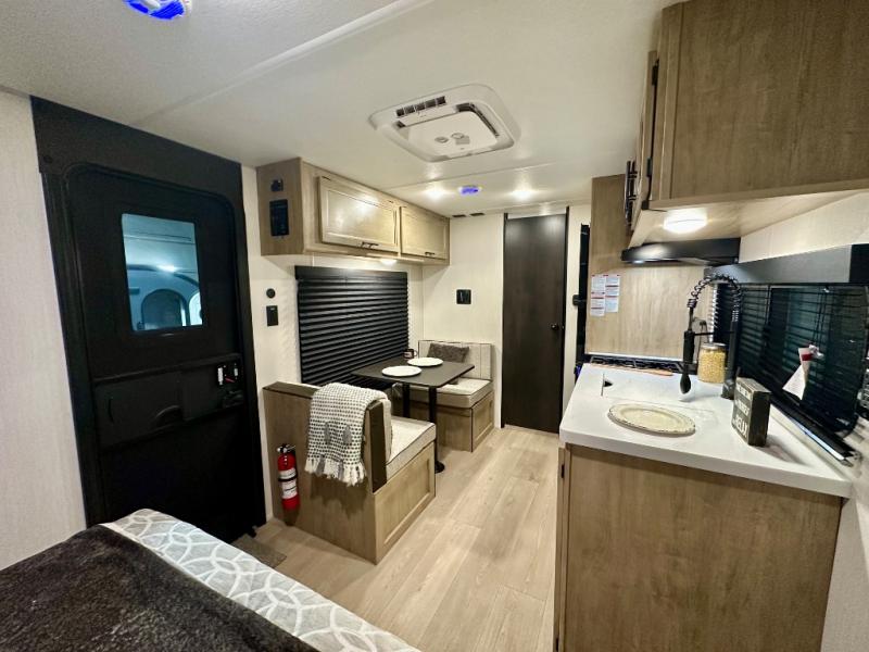 You will love camping in this travel trailer with your own queen bed up front! Freshen up each morning in the full rear bathroom with the tub/shower, toilet, and sink. Fill your bellies with the perishables stored in the 12V high efficiency refrigerator and cook them on the high output cooktop. You could even prepare a meal while breathing in some fresh air at the outside mini kitchen while staying protected by the 12' power awning. Easily store all of your outdoor gear in the outside storage area too!