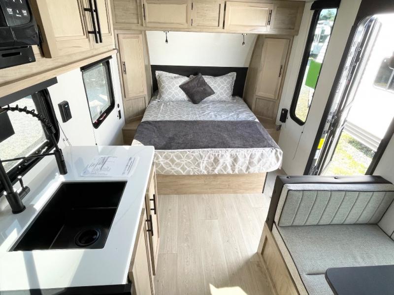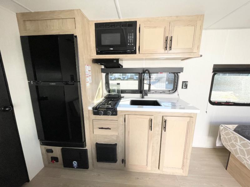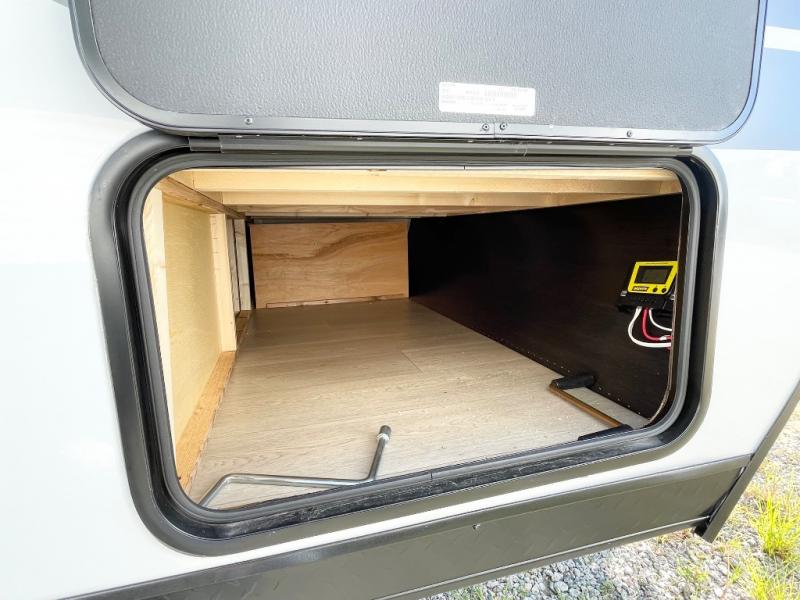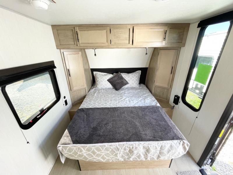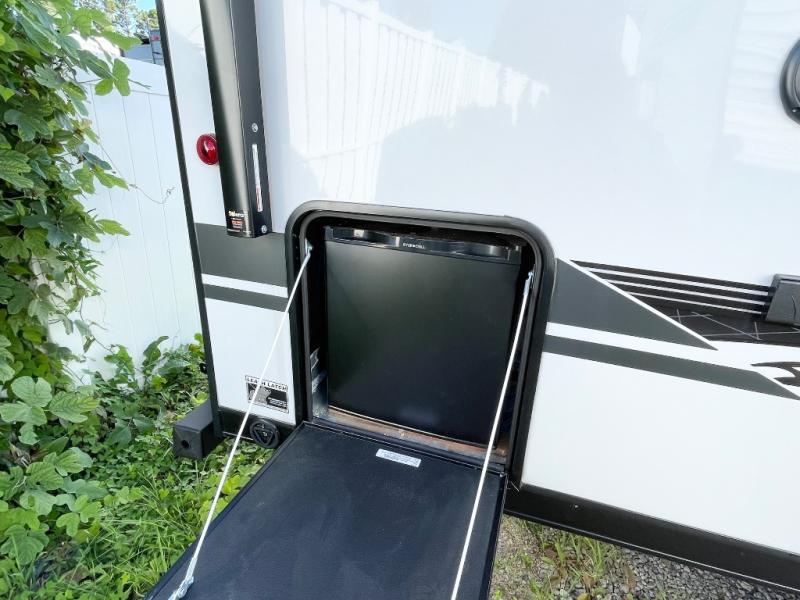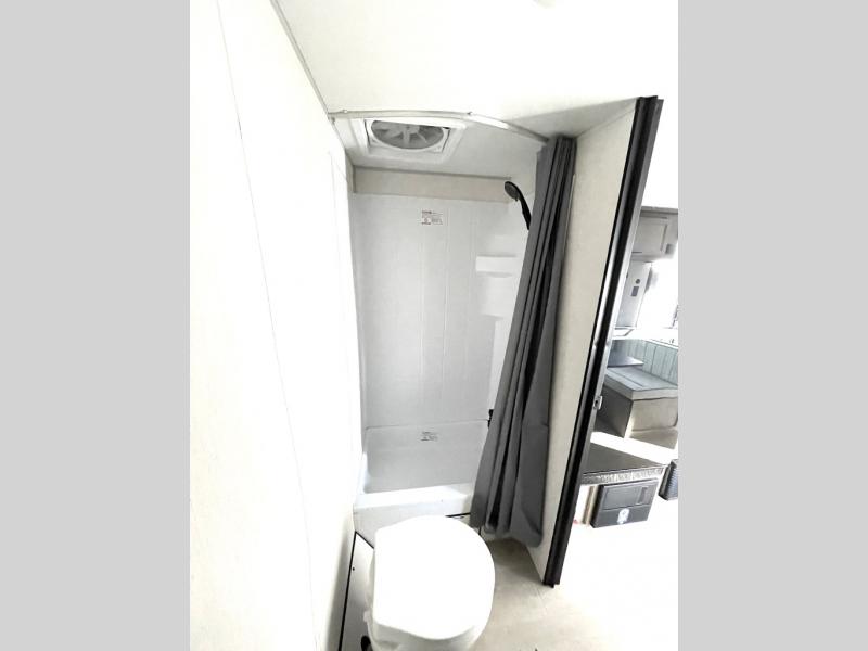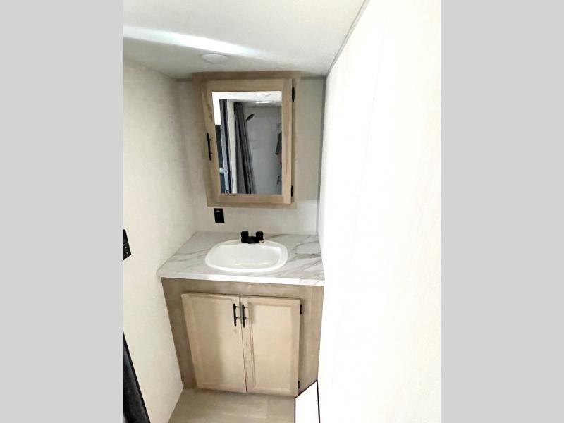You will love camping in this travel trailer with your own queen bed up front! Freshen up each morning in the full rear bathroom with the tub/shower, toilet, and sink. Fill your bellies with the perishables stored in the 12V high efficiency refrigerator and cook them on the high output cooktop. You could even prepare a meal while breathing in some fresh air at the outside mini kitchen while staying protected by the 12' power awning. Easily store all of your outdoor gear in the outside storage area too!